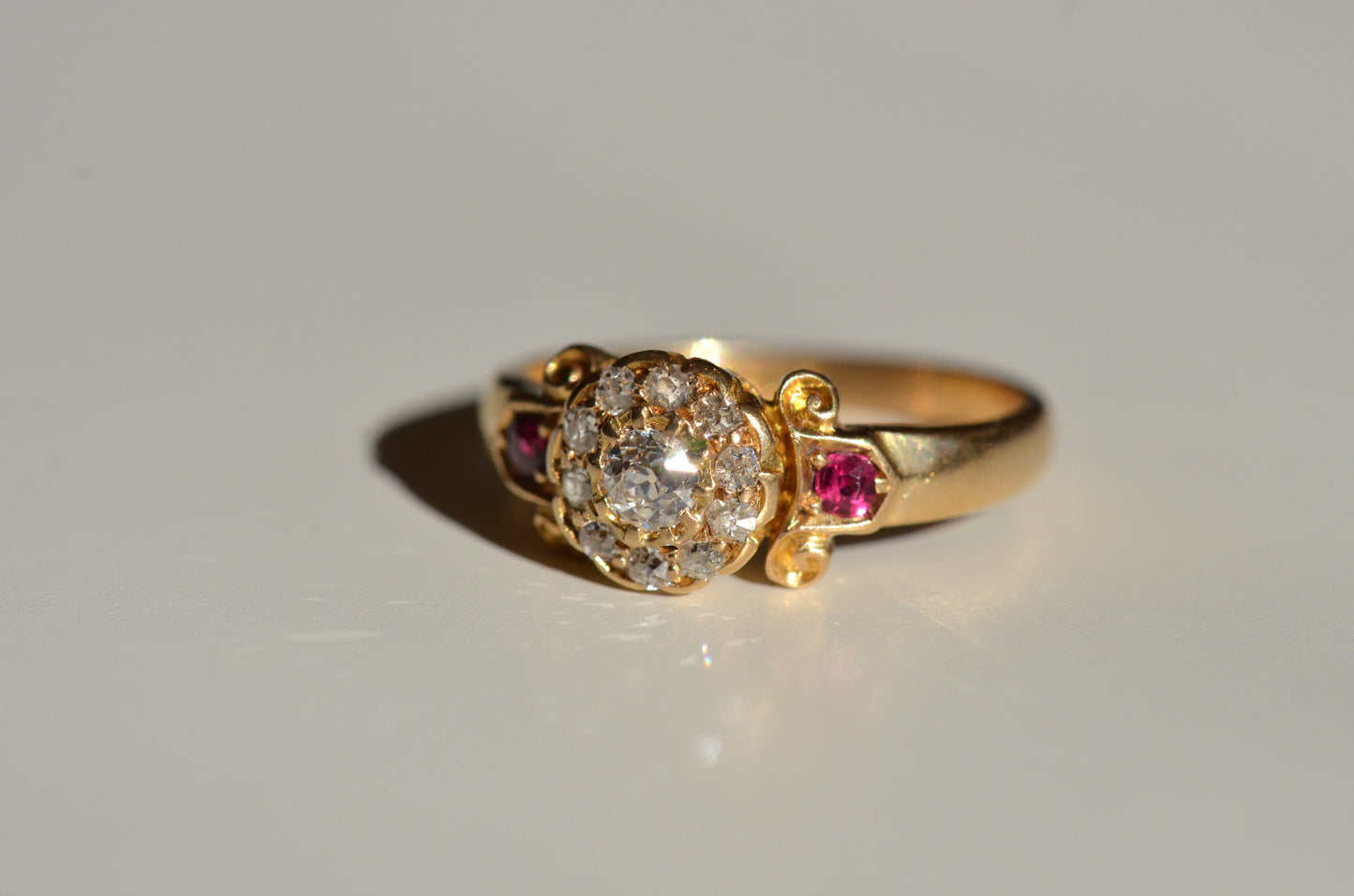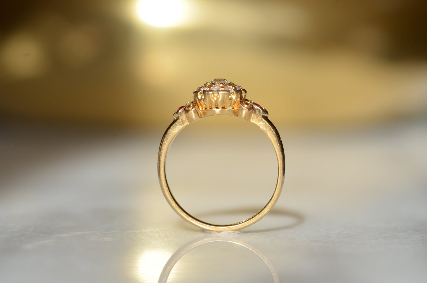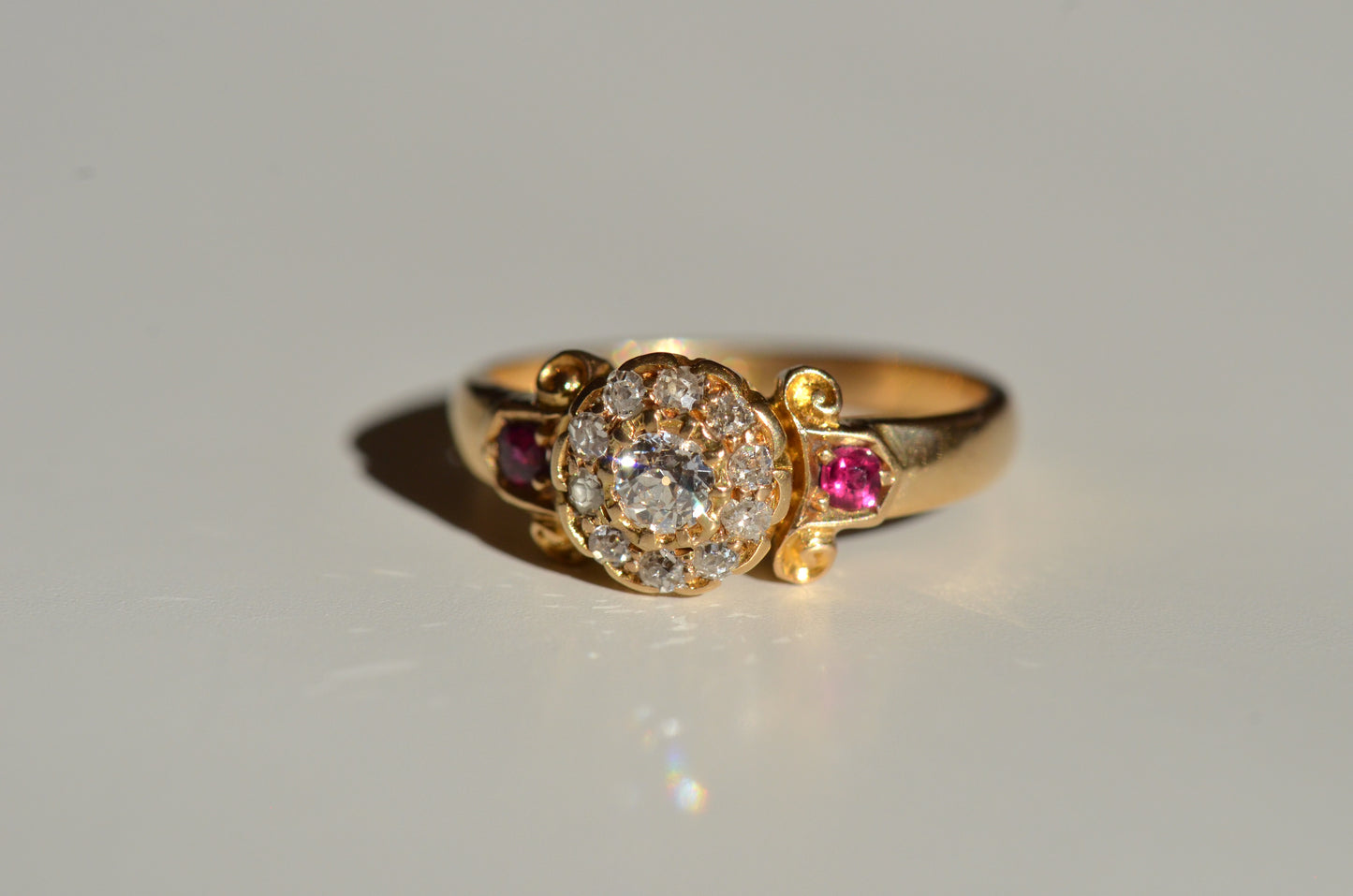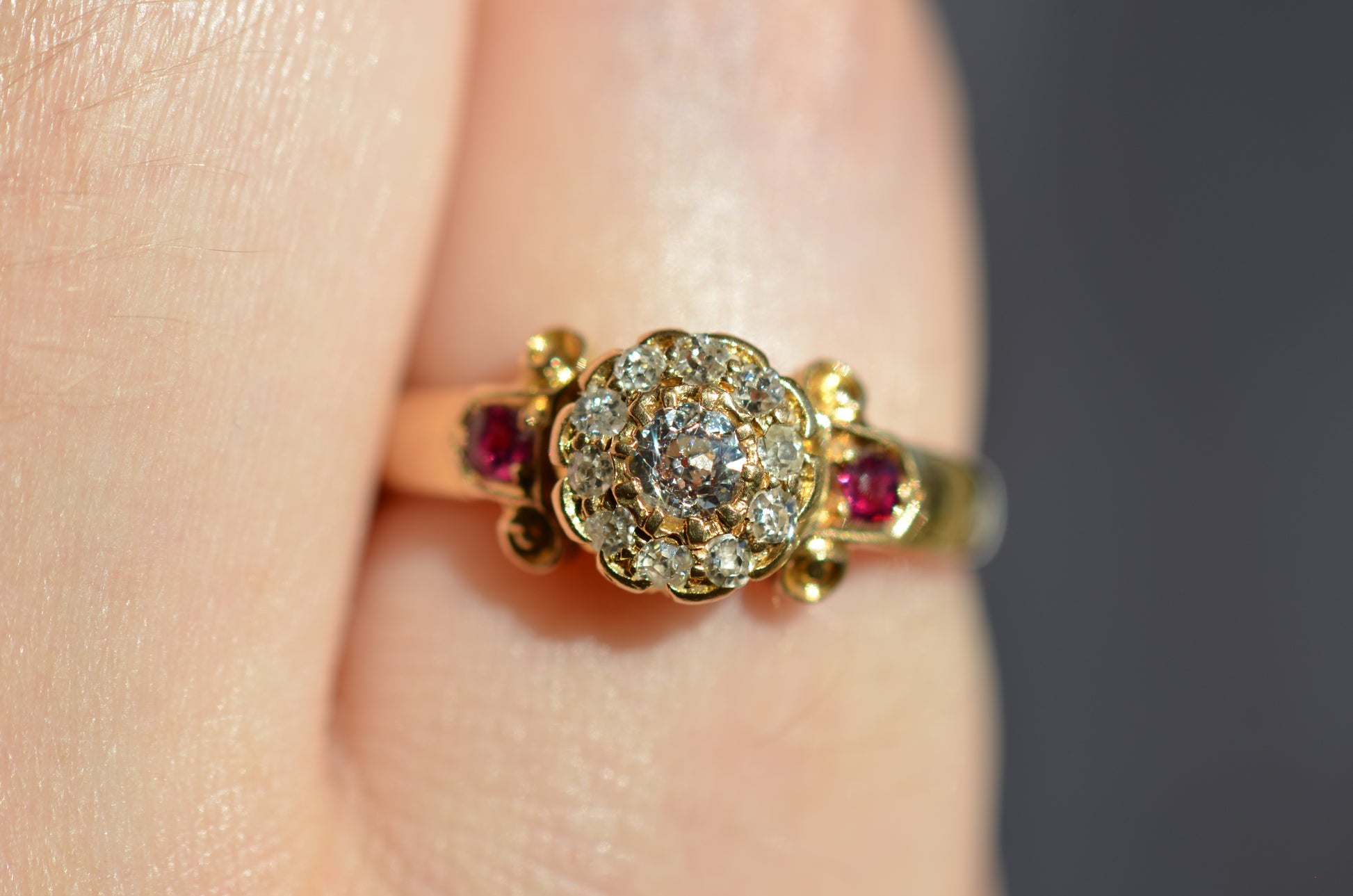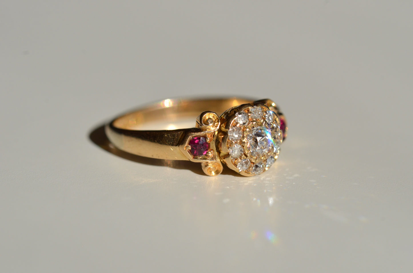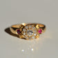 Small but mighty, this elegant turn of the century ring would make a delightfully impressive pinky ring or a perfectly scaled engagement ring for the tiny-handed among us. A halo of twinkling single cut diamonds surround a central old Euro, while richly hued rubies nestle into flourished shoulders for a pop of colour.