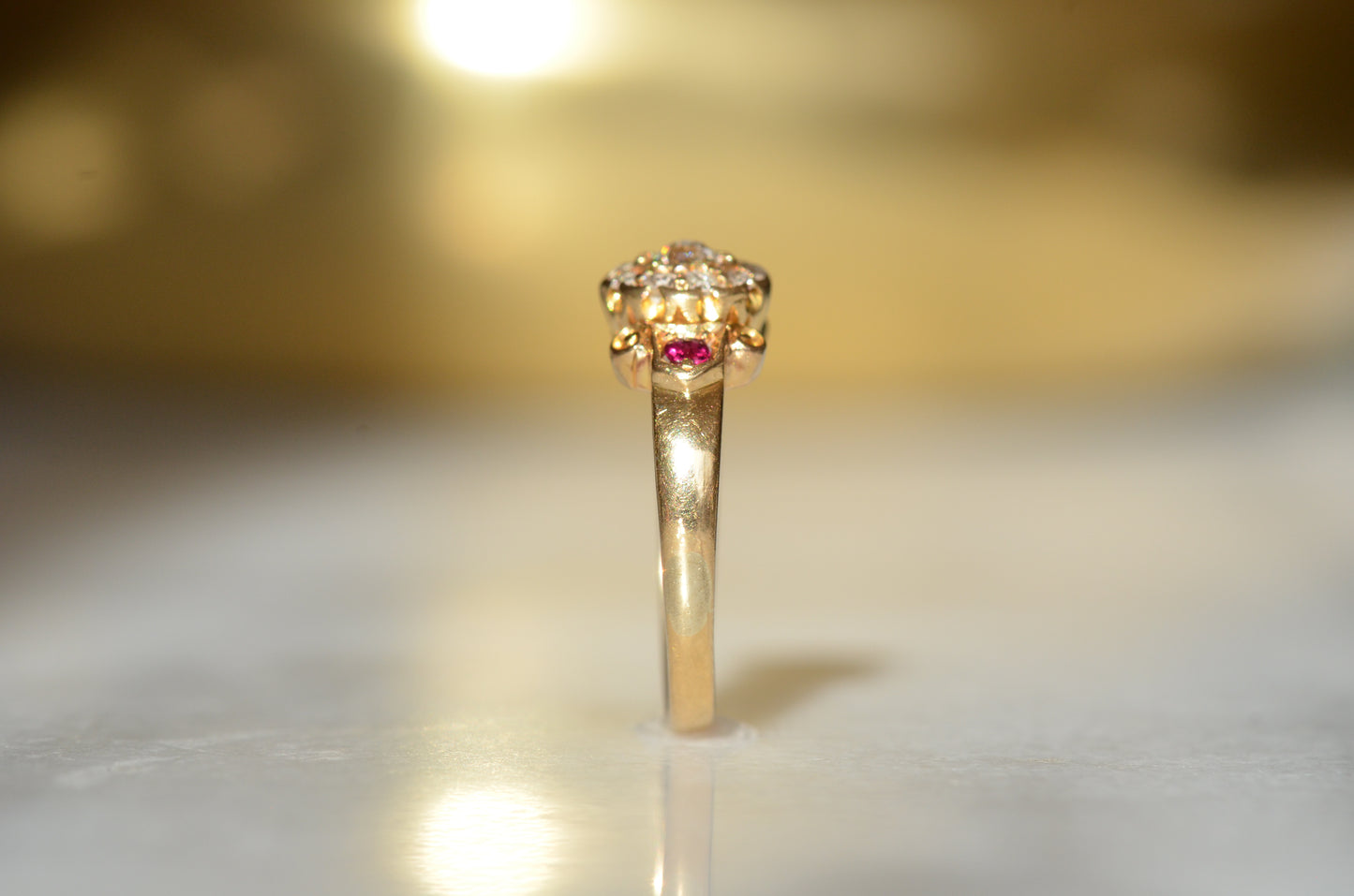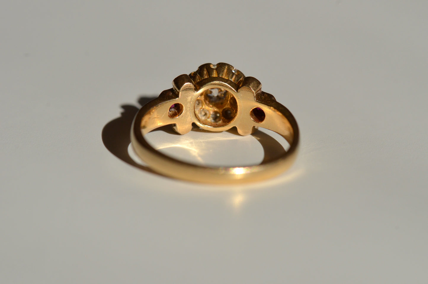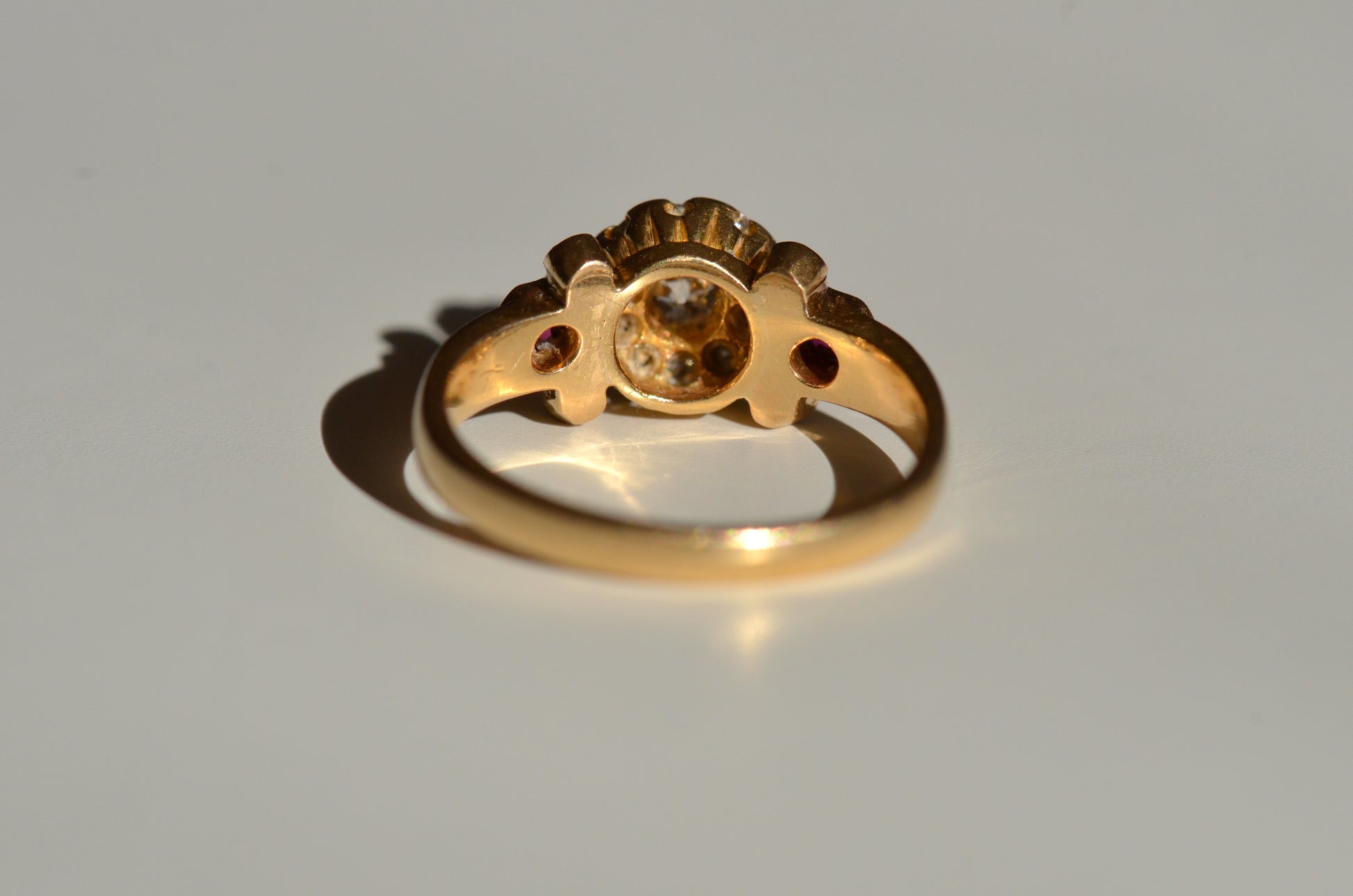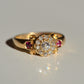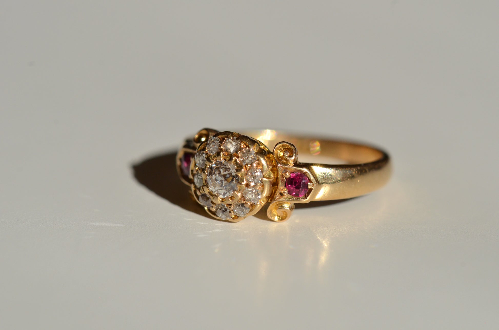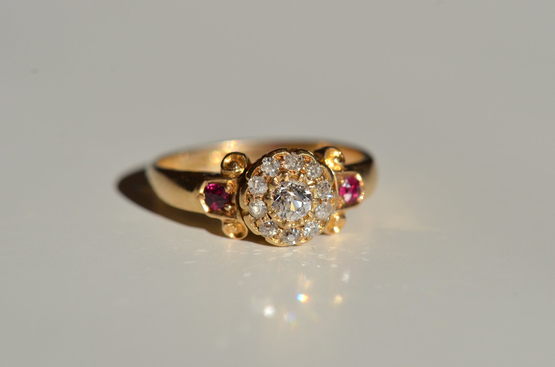 Small but mighty, this elegant turn of the century ring would make a delightfully impressive pinky ring or a perfectly scaled engagement ring for the tiny-handed among us. A halo of twinkling single cut diamonds surround a central old Euro, while richly hued rubies nestle into flourished shoulders for a pop of colour.