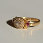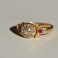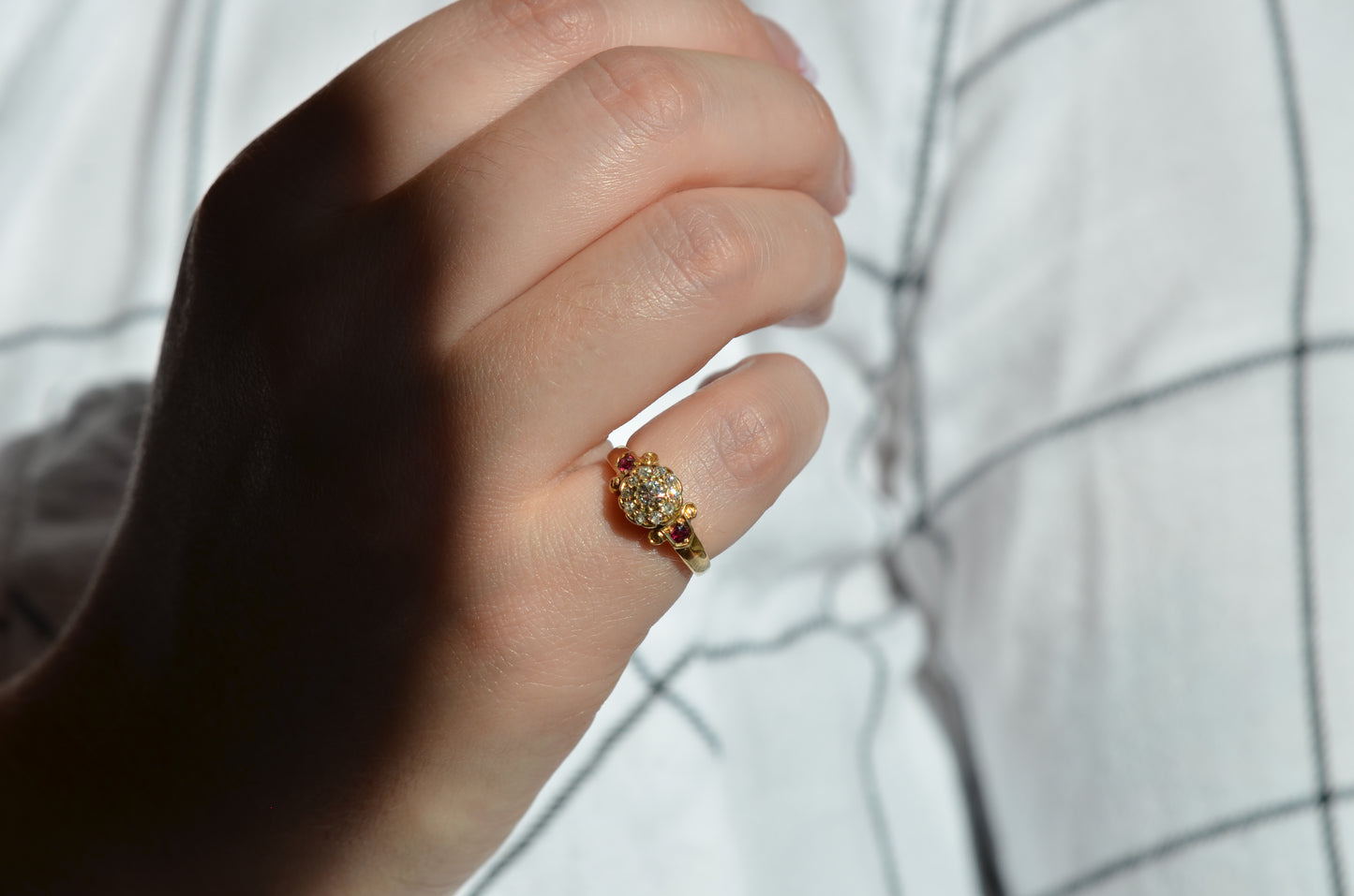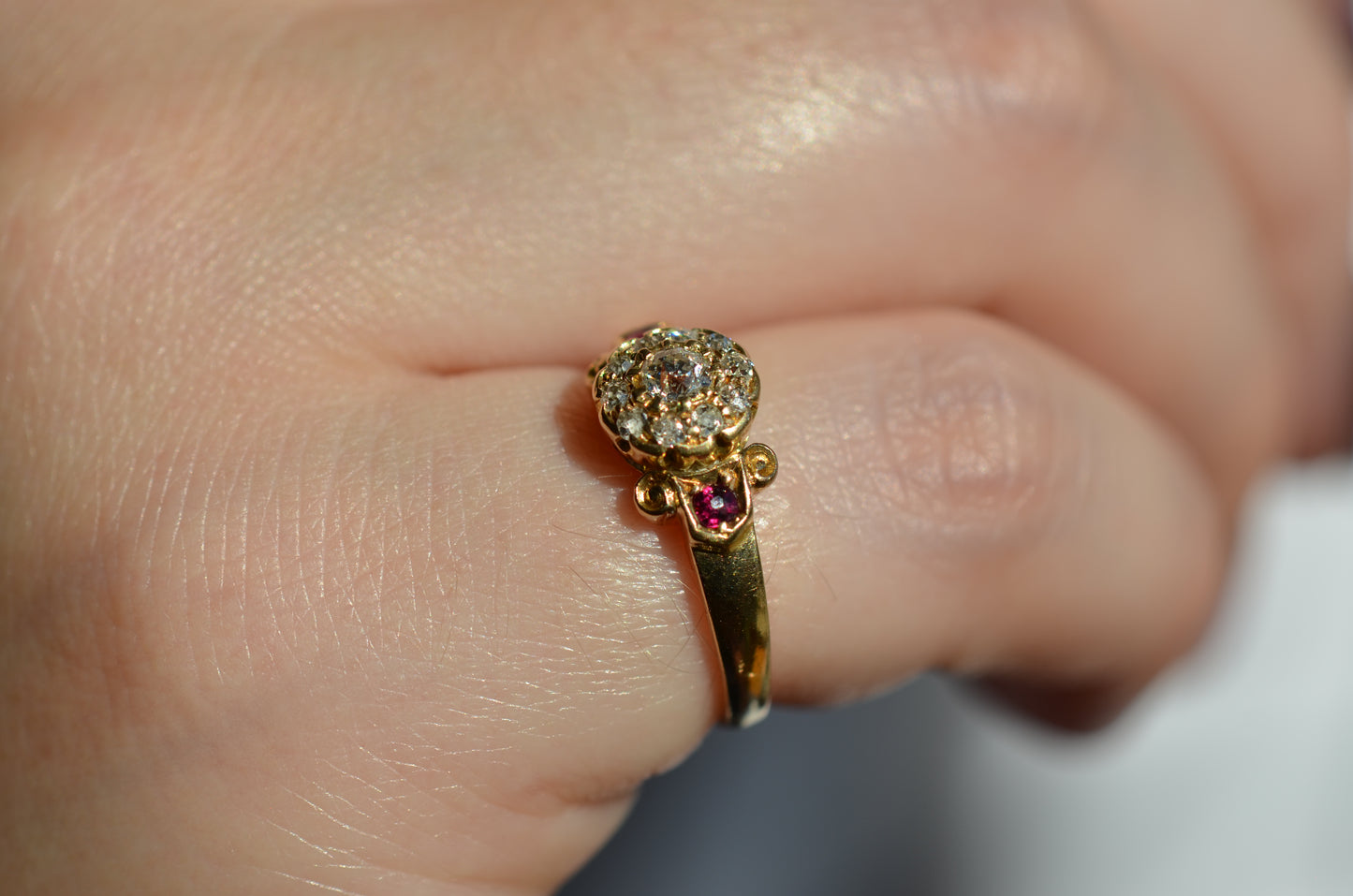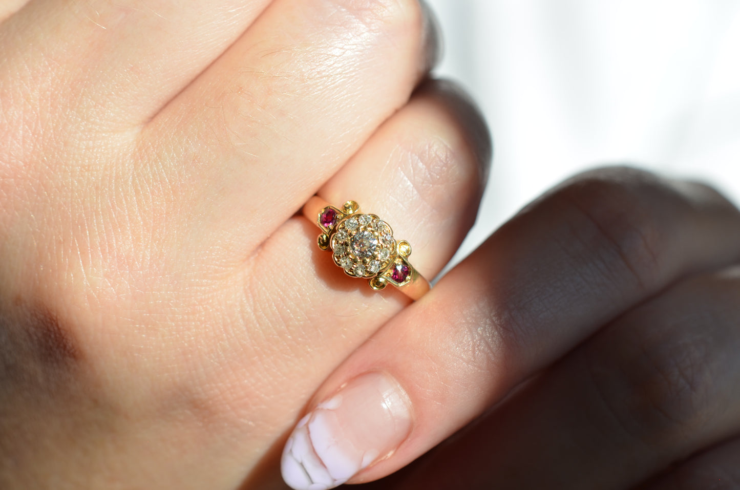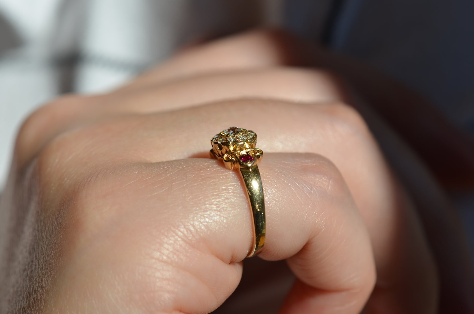 Small but mighty, this elegant turn of the century ring would make a delightfully impressive pinky ring or a perfectly scaled engagement ring for the tiny-handed among us. A halo of twinkling single cut diamonds surround a central old Euro, while richly hued rubies nestle into flourished shoulders for a pop of colour.