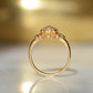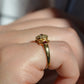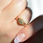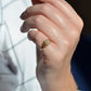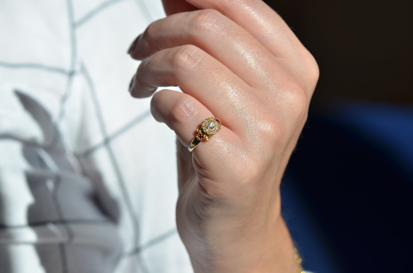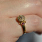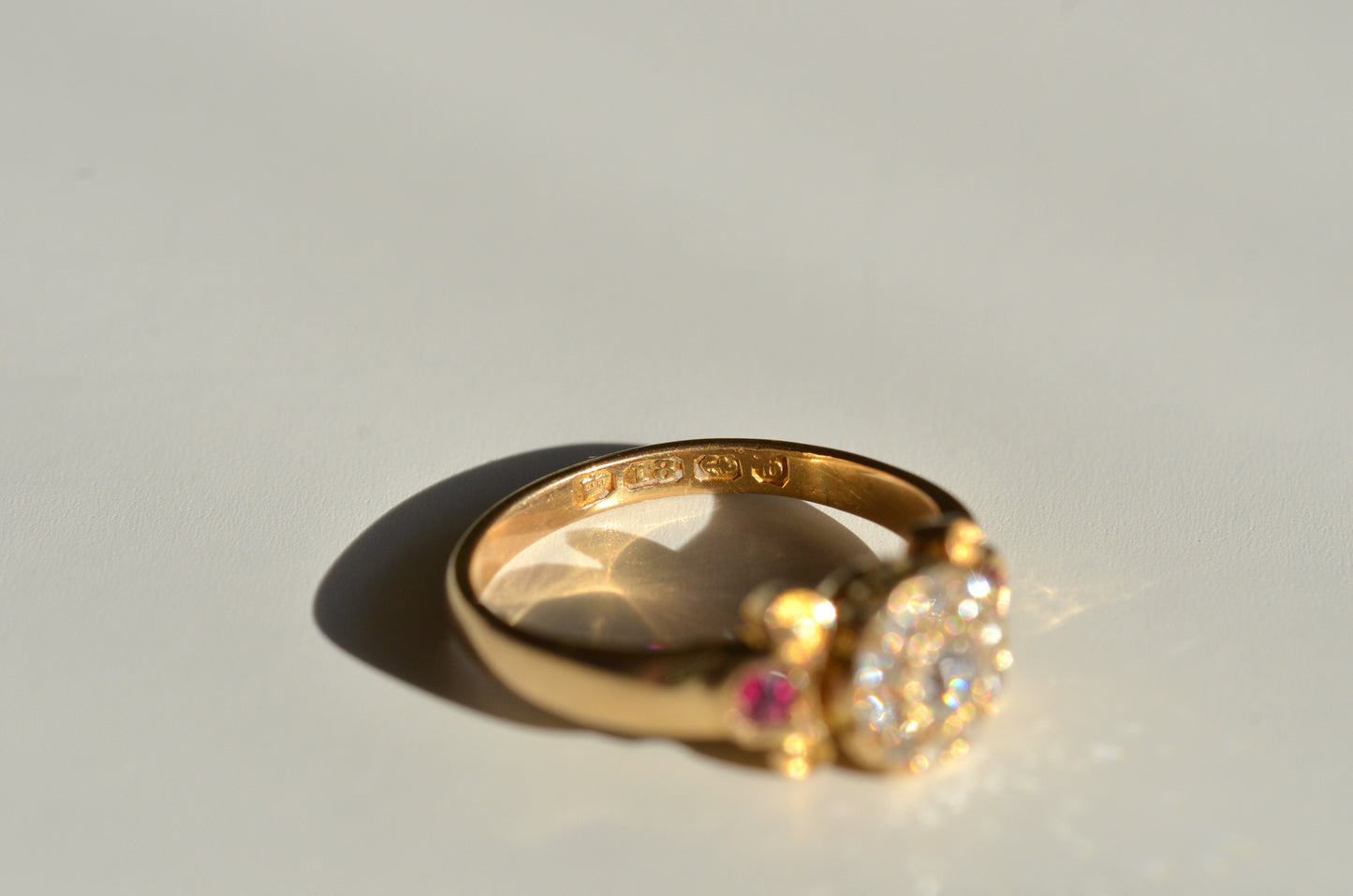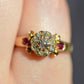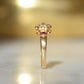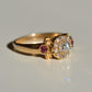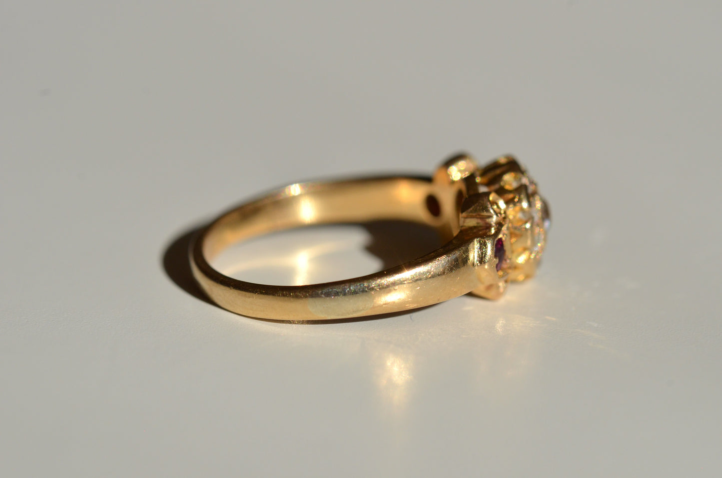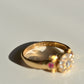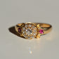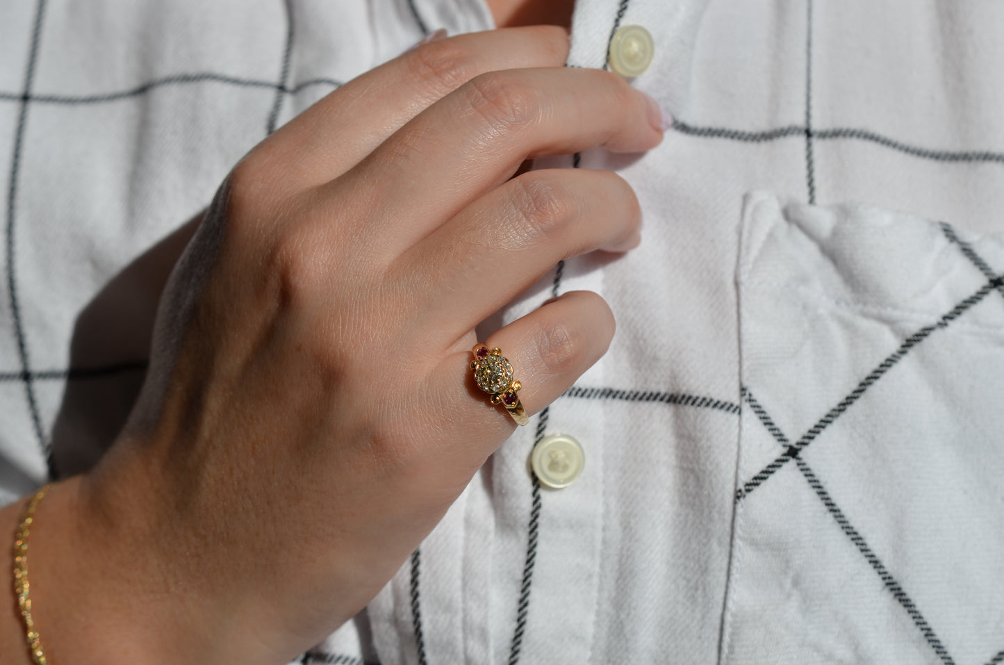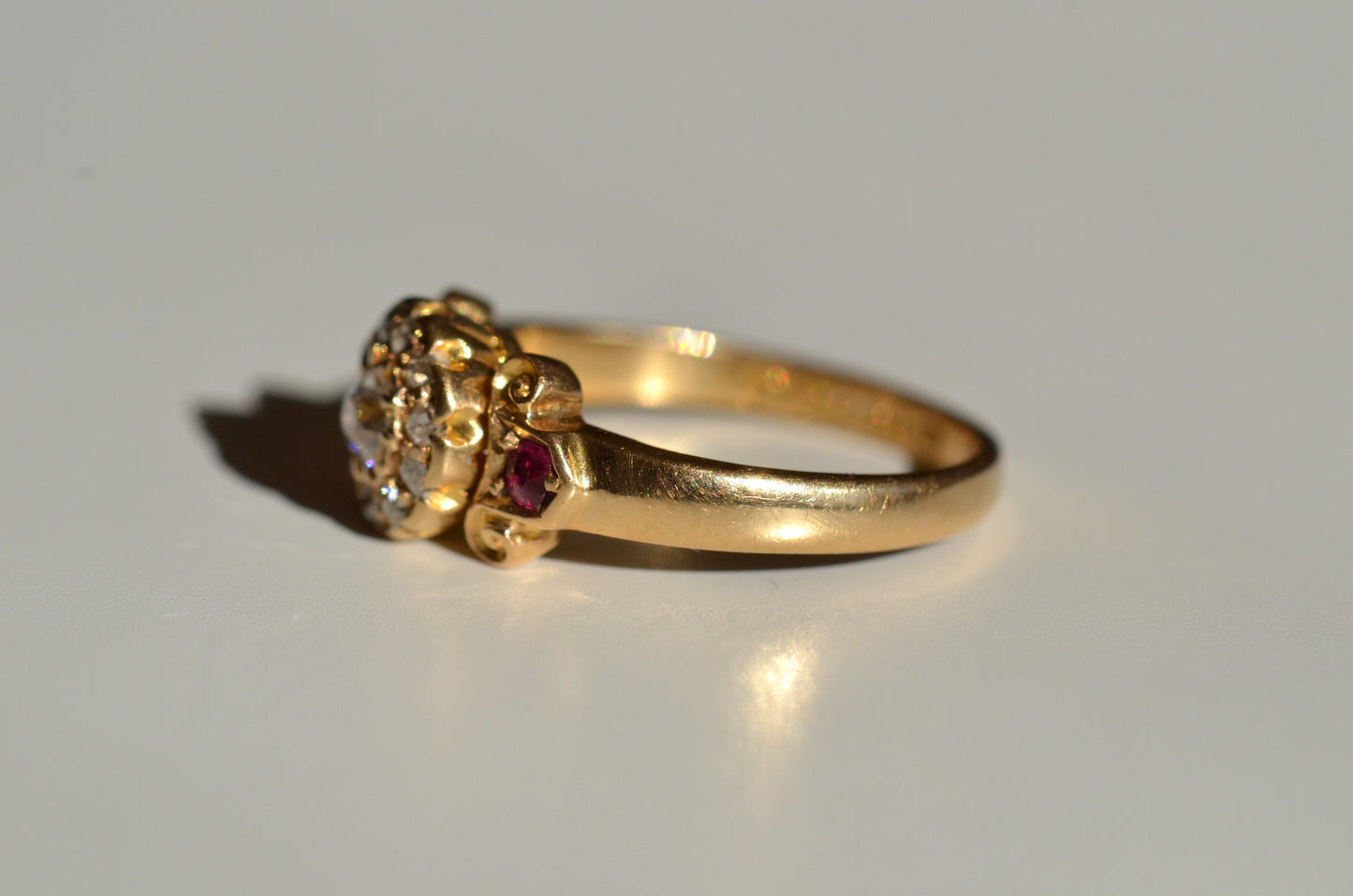 Small but mighty, this elegant turn of the century ring would make a delightfully impressive pinky ring or a perfectly scaled engagement ring for the tiny-handed among us. A halo of twinkling single cut diamonds surround a central old Euro, while richly hued rubies nestle into flourished shoulders for a pop of colour.