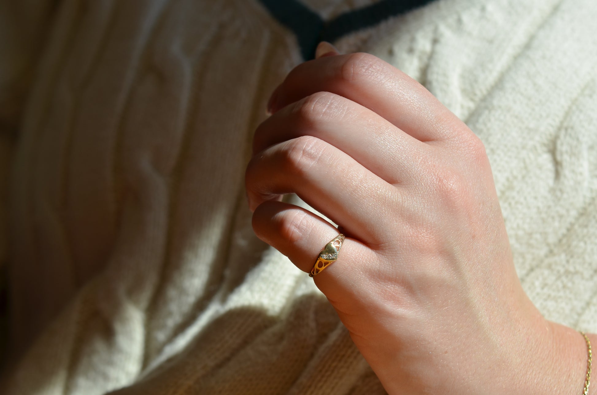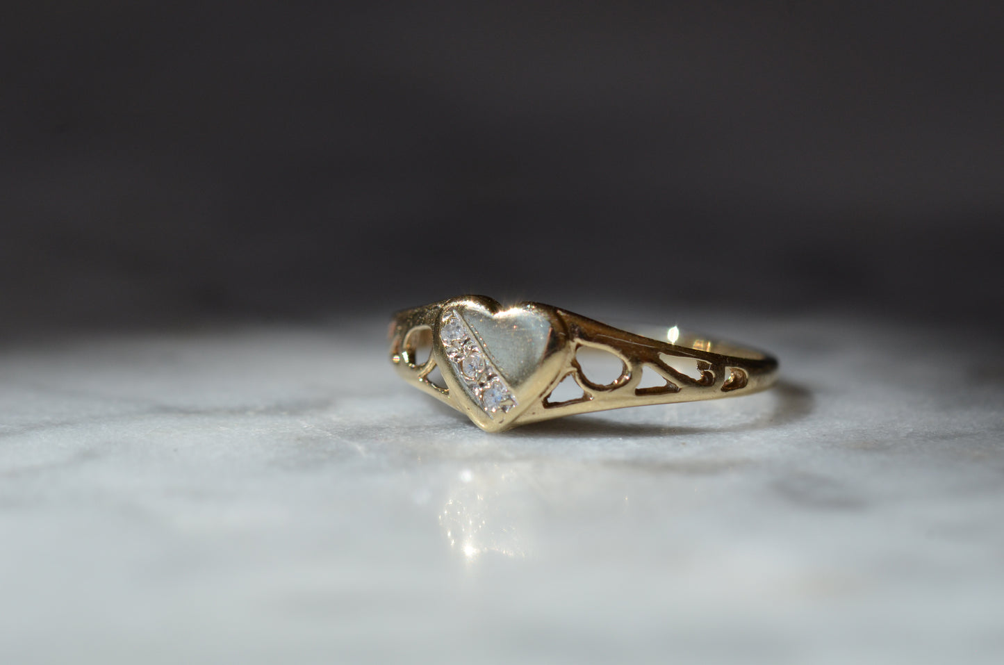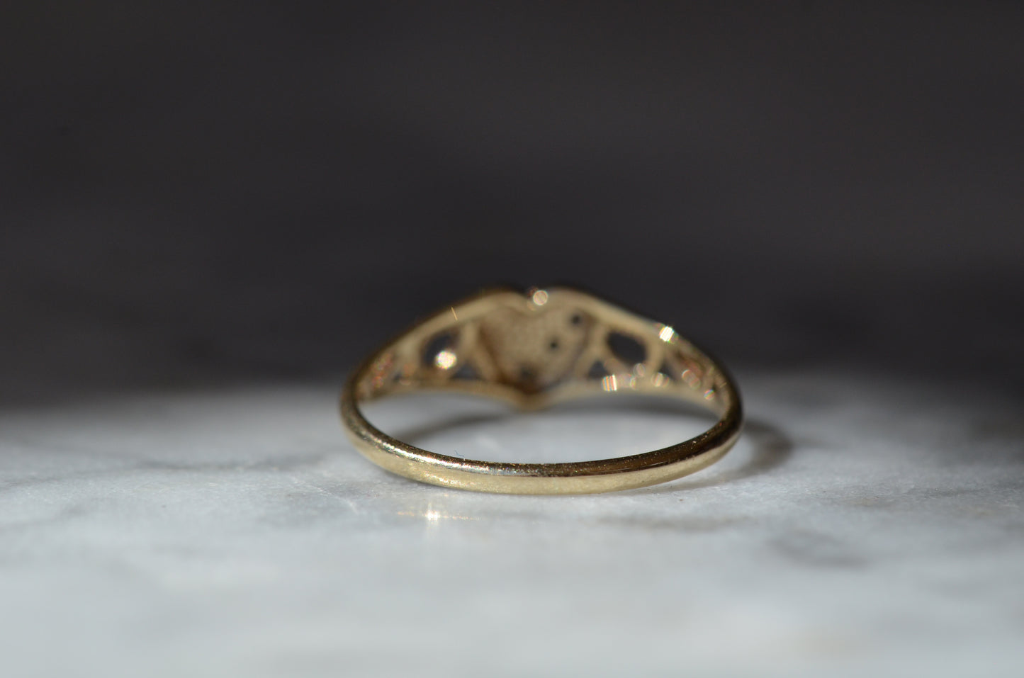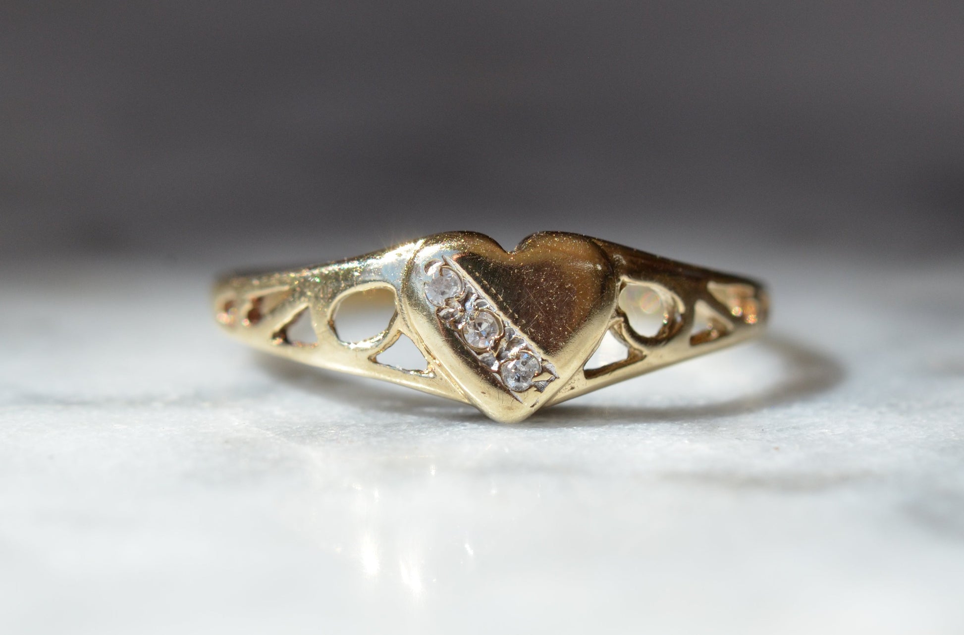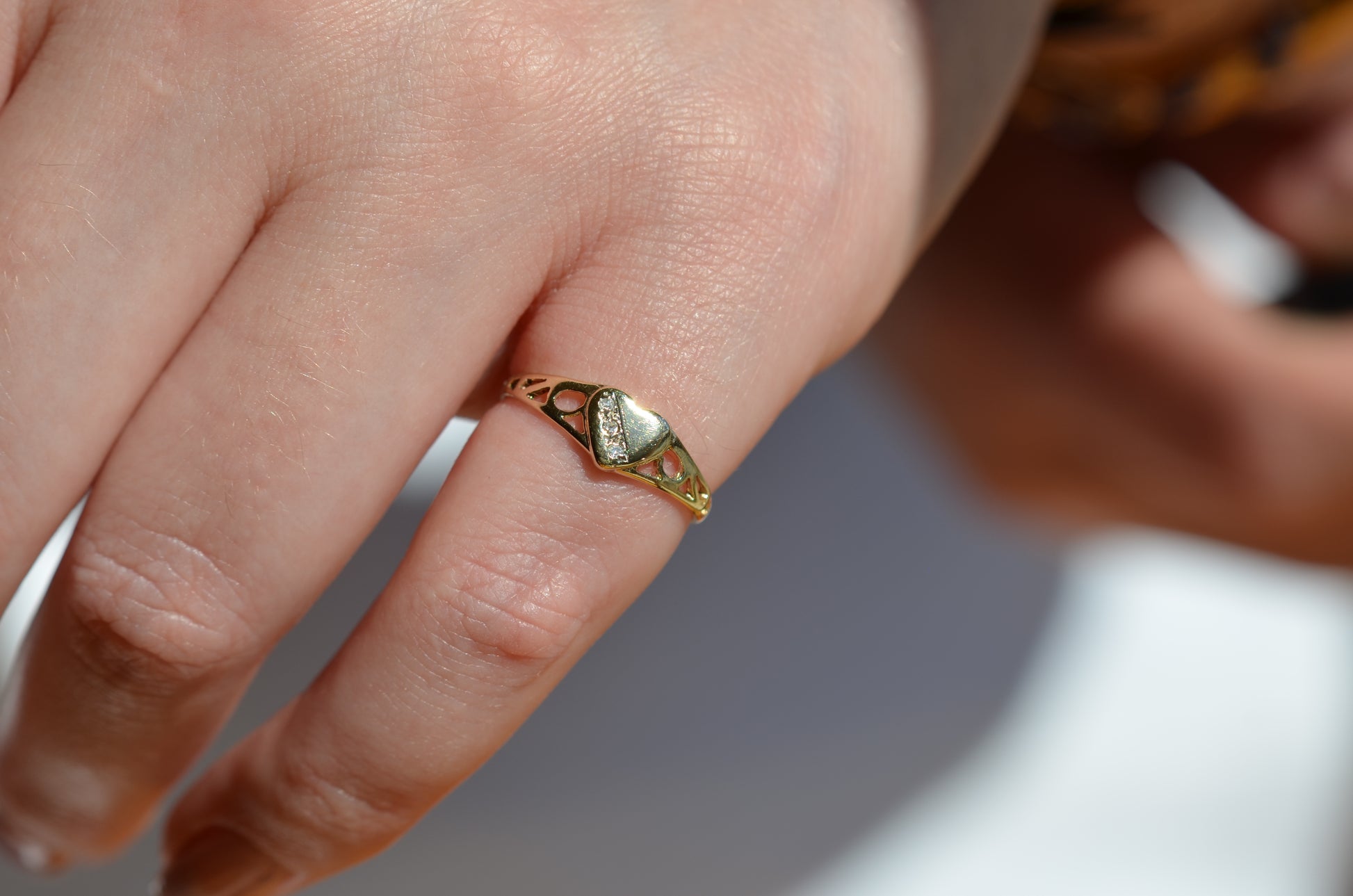 As petite as it is sweet, this small signet makes a darling pinky ring or a perfect gift for a new parent. Three tiny diamonds reflect pinpricks of light, while the smooth surface of the heart-shaped face is unengraved - easily left plain, or up to you to personalize. Ripe with early '90s tenderness, this ring will charm alone or in a stack.