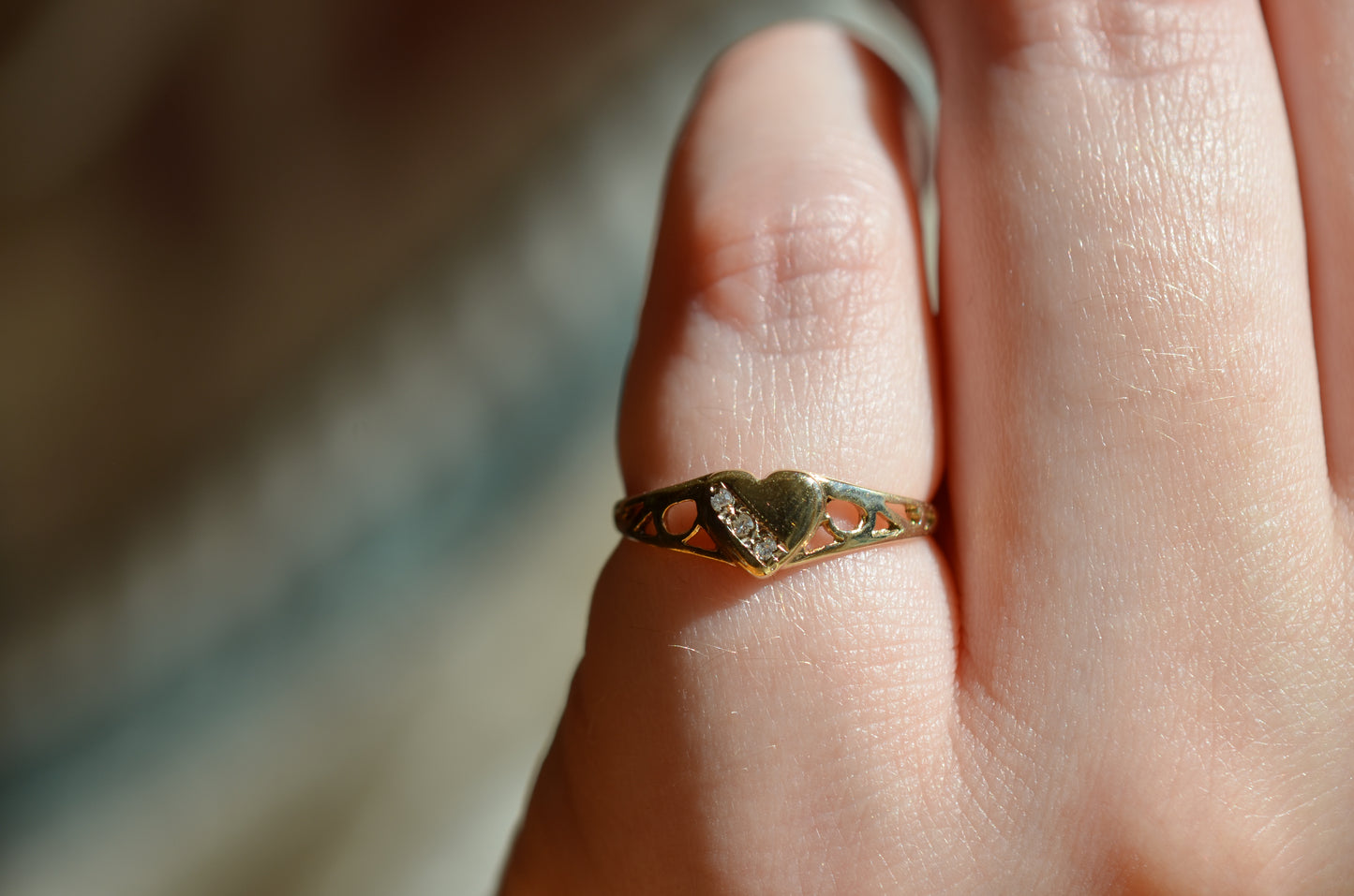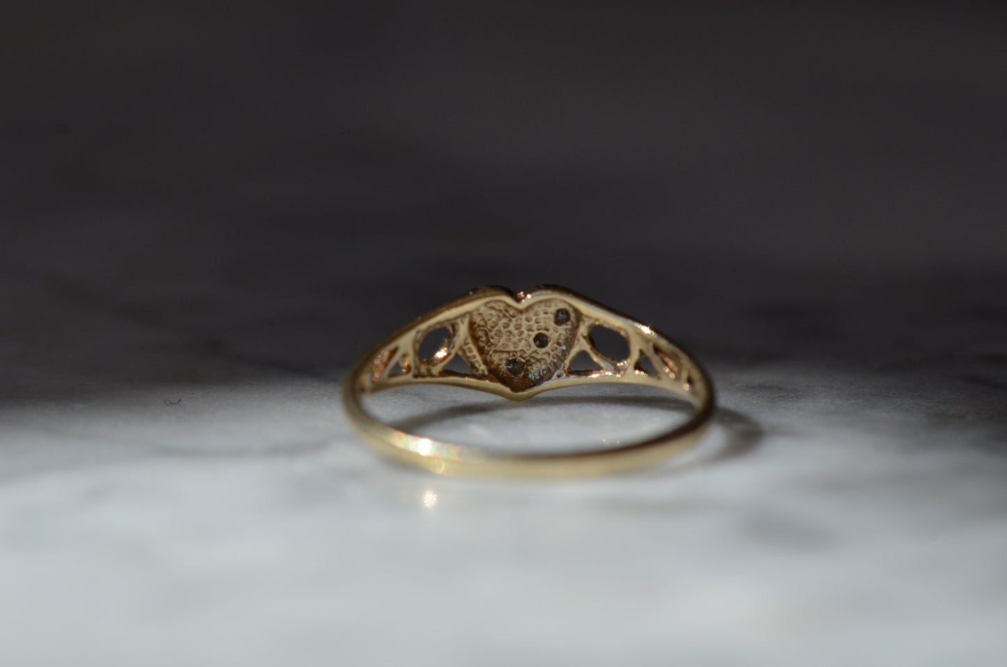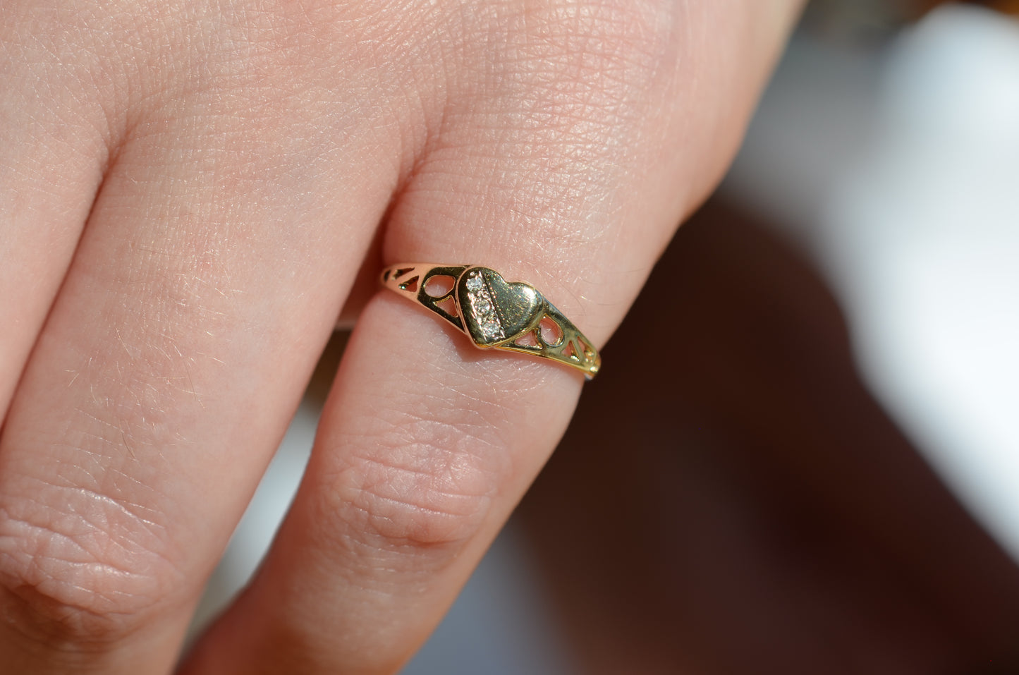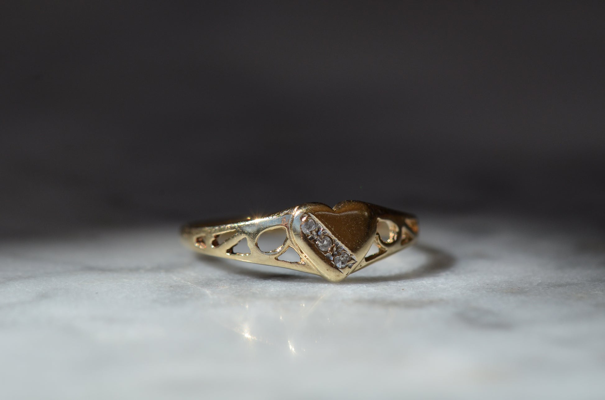 As petite as it is sweet, this small signet makes a darling pinky ring or a perfect gift for a new parent. Three tiny diamonds reflect pinpricks of light, while the smooth surface of the heart-shaped face is unengraved - easily left plain, or up to you to personalize. Ripe with early '90s tenderness, this ring will charm alone or in a stack.