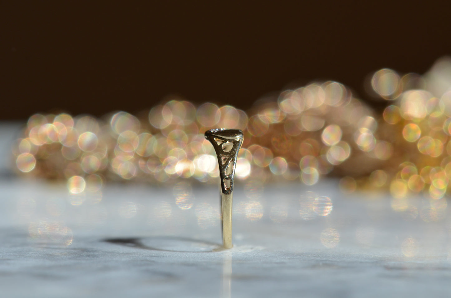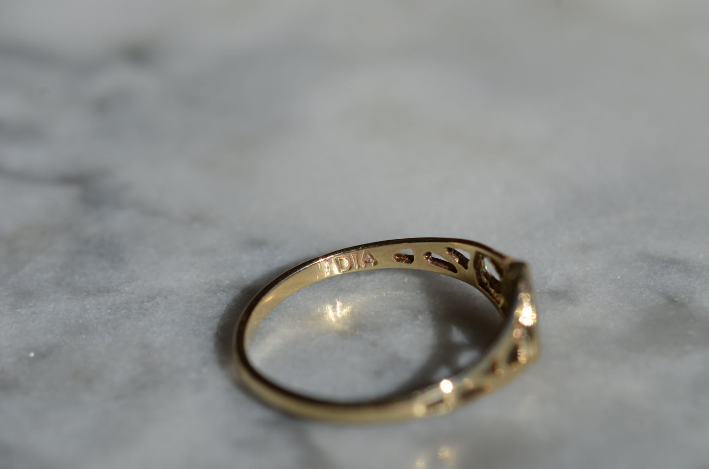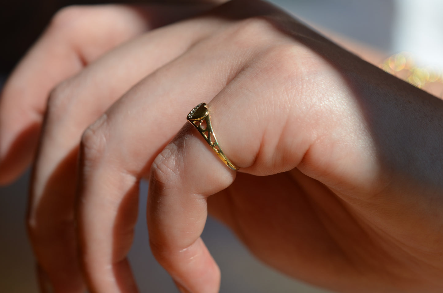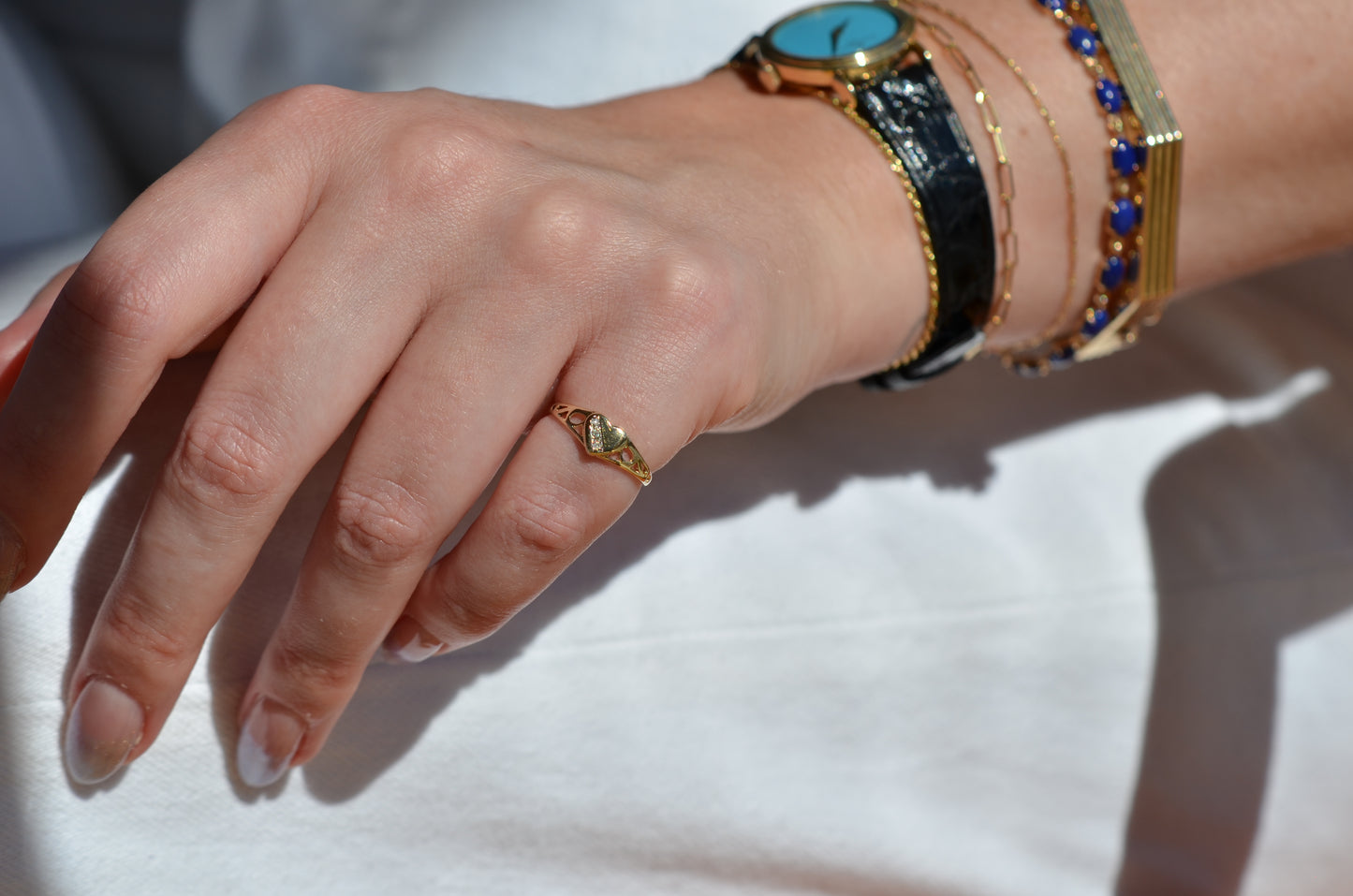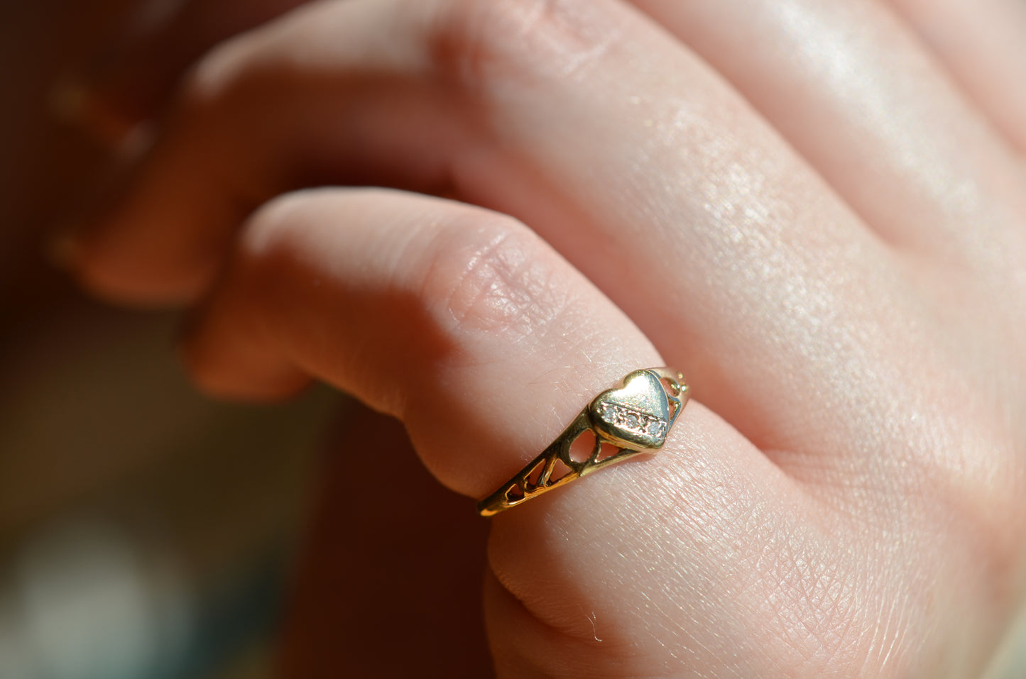 As petite as it is sweet, this small signet makes a darling pinky ring or a perfect gift for a new parent. Three tiny diamonds reflect pinpricks of light, while the smooth surface of the heart-shaped face is unengraved - easily left plain, or up to you to personalize. Ripe with early '90s tenderness, this ring will charm alone or in a stack.