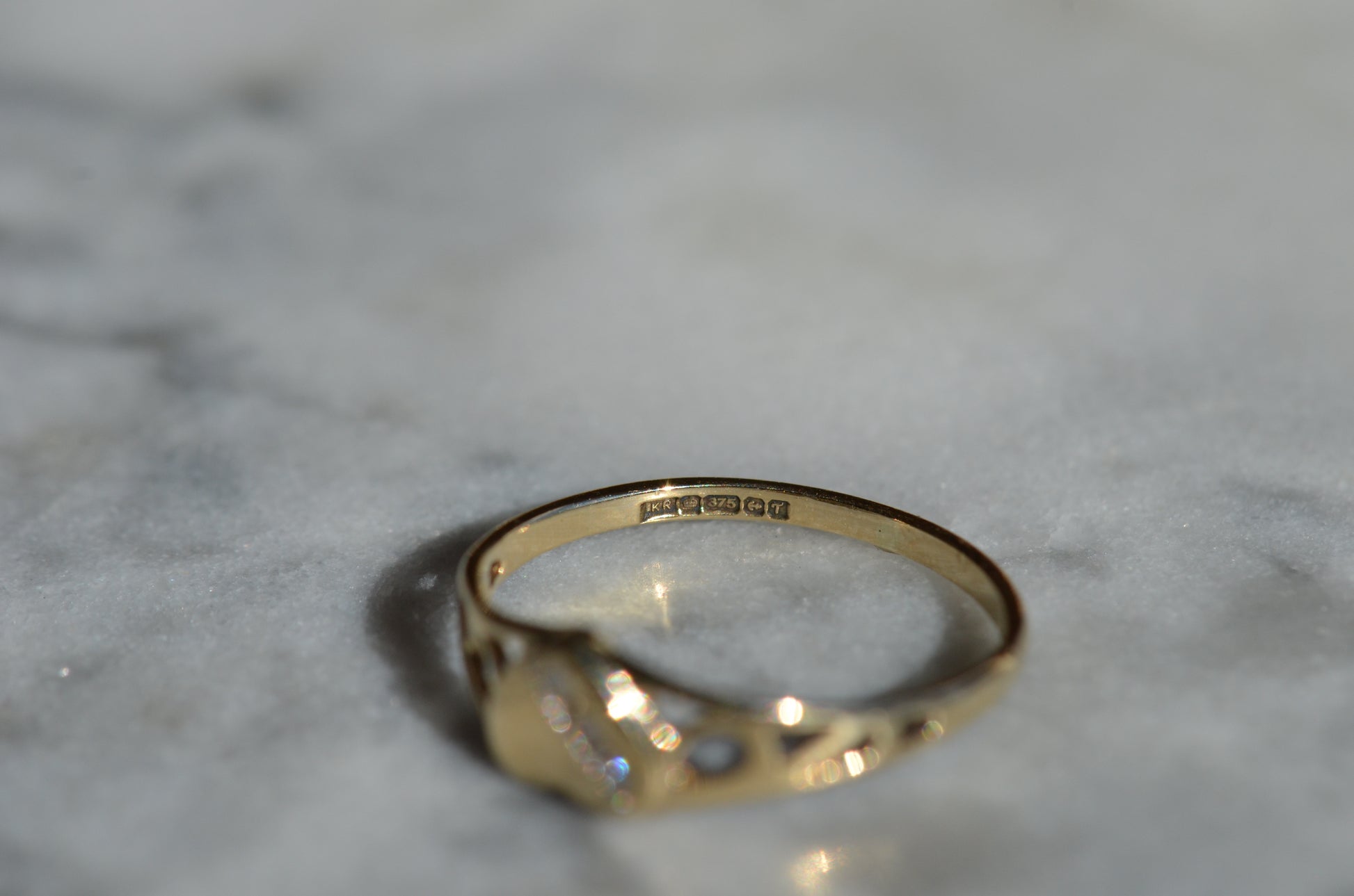 • 9k yellow gold, full British hallmarks for Birmingham 1993, maker's mark KP, and stamped "DIA" for diamond