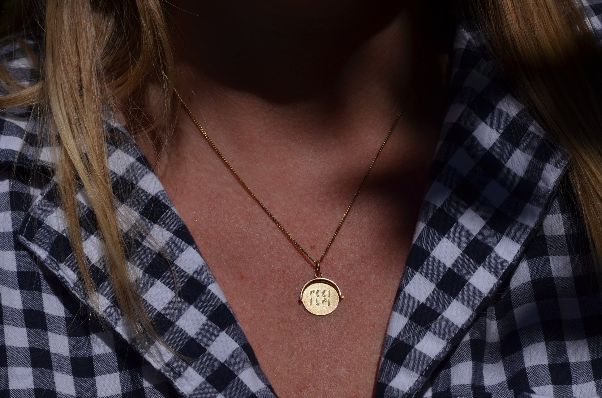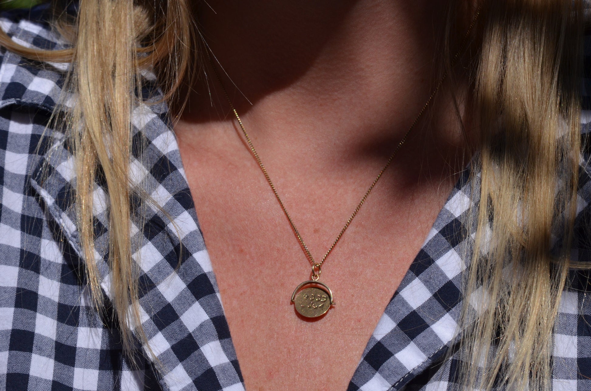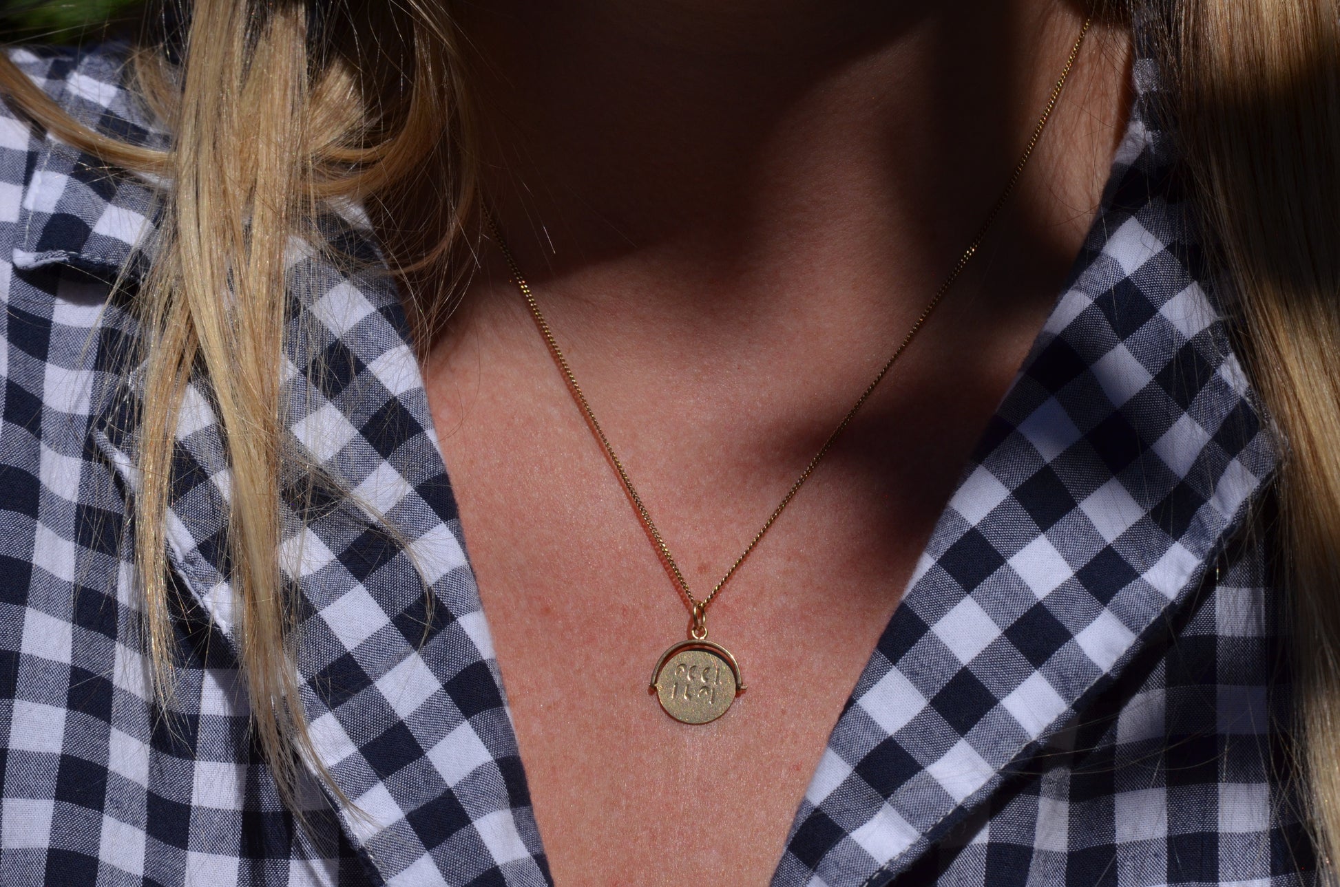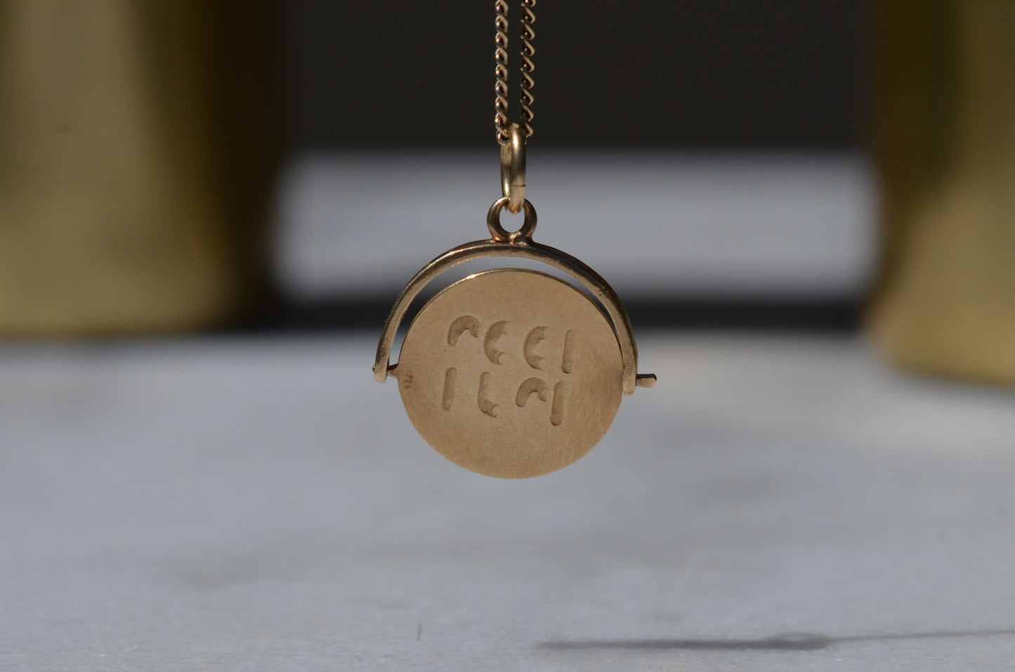 Straight from the midcentury charm craze, these delightful pieces can be added to your own charm bracelet or necklace, or worn alone on a chain to give them all the focus. Each side of the disc bears only a portion of each letter, creating a secret message that is only revealed when the disc is spun and in motion.
