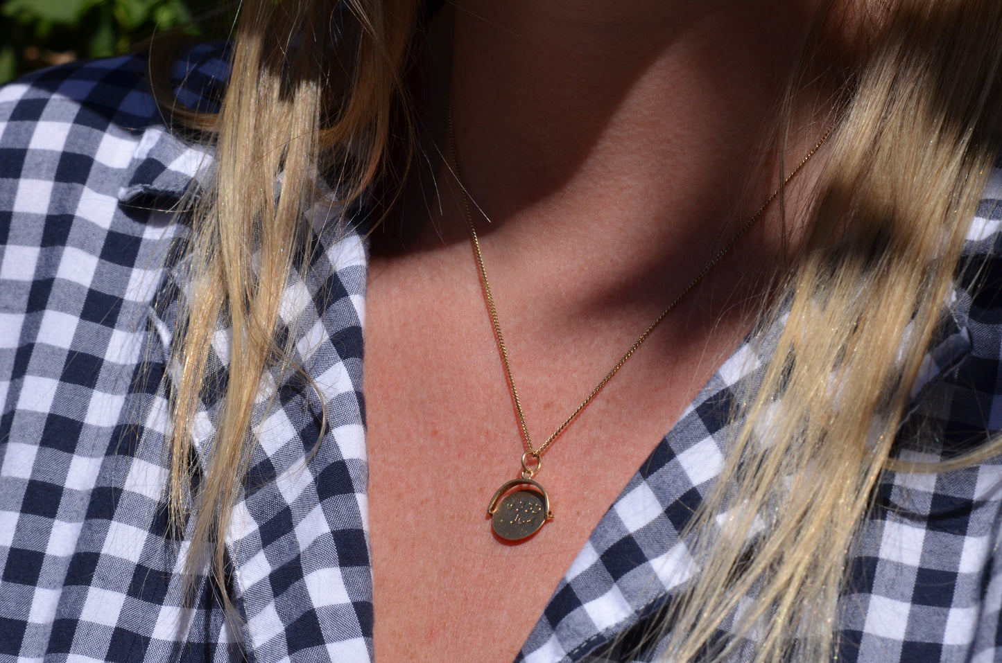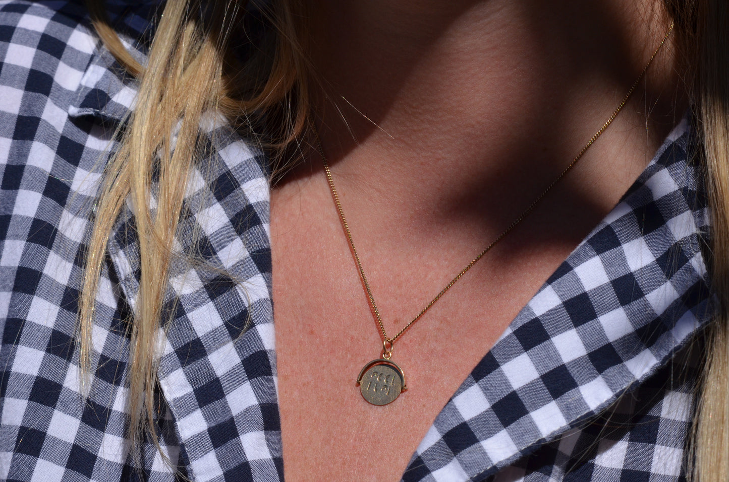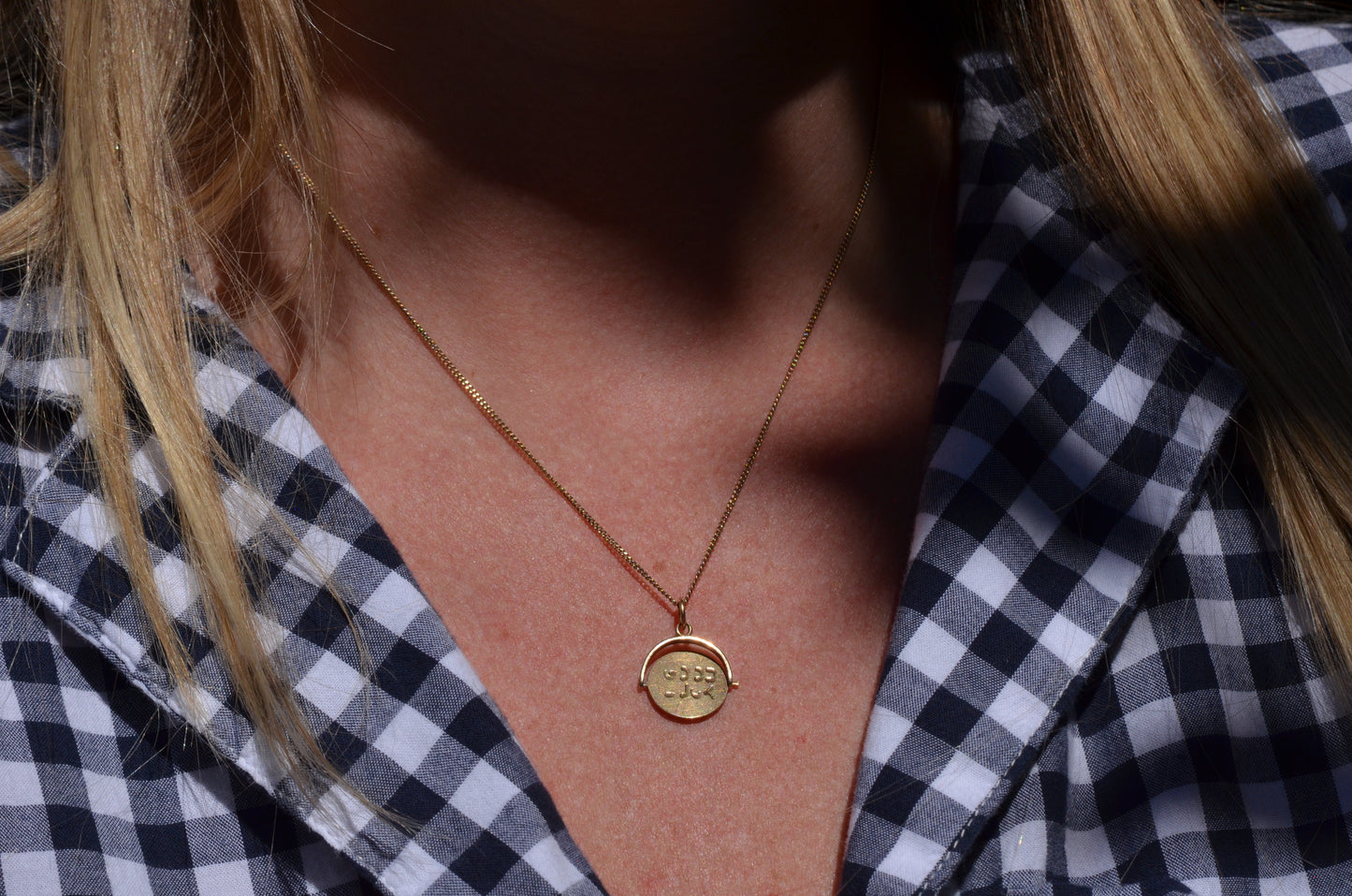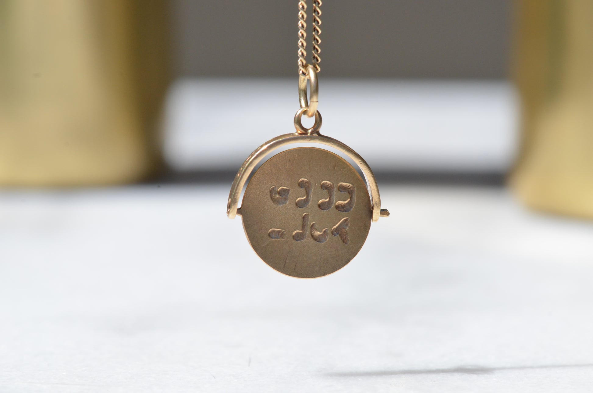 Straight from the midcentury charm craze, these delightful pieces can be added to your own charm bracelet or necklace, or worn alone on a chain to give them all the focus. Each side of the disc bears only a portion of each letter, creating a secret message that is only revealed when the disc is spun and in motion.