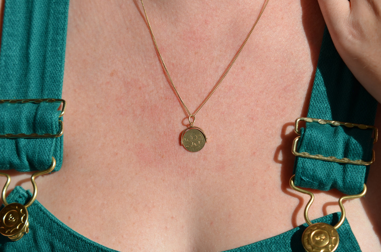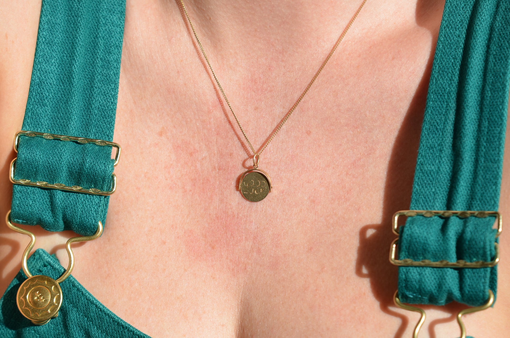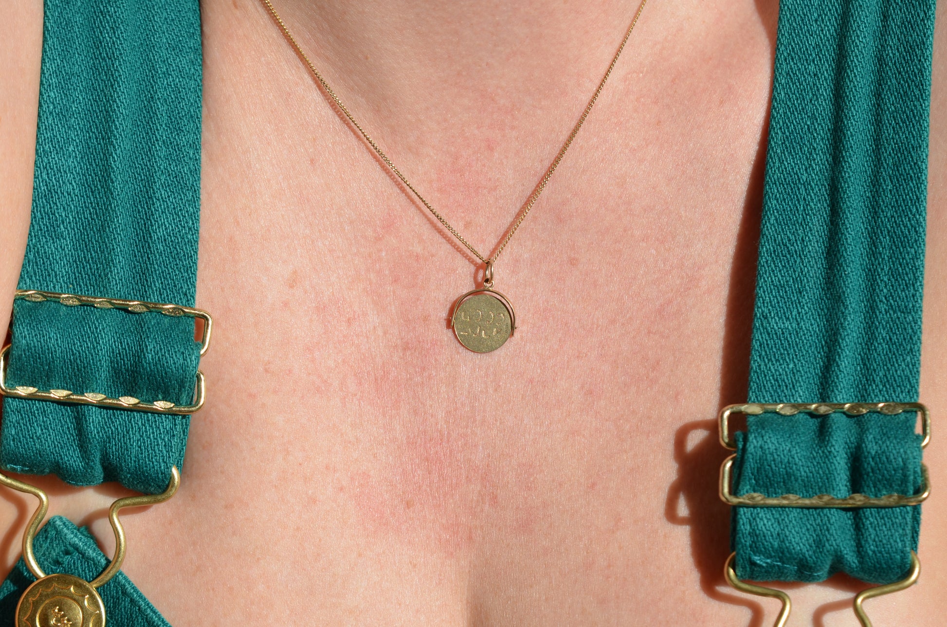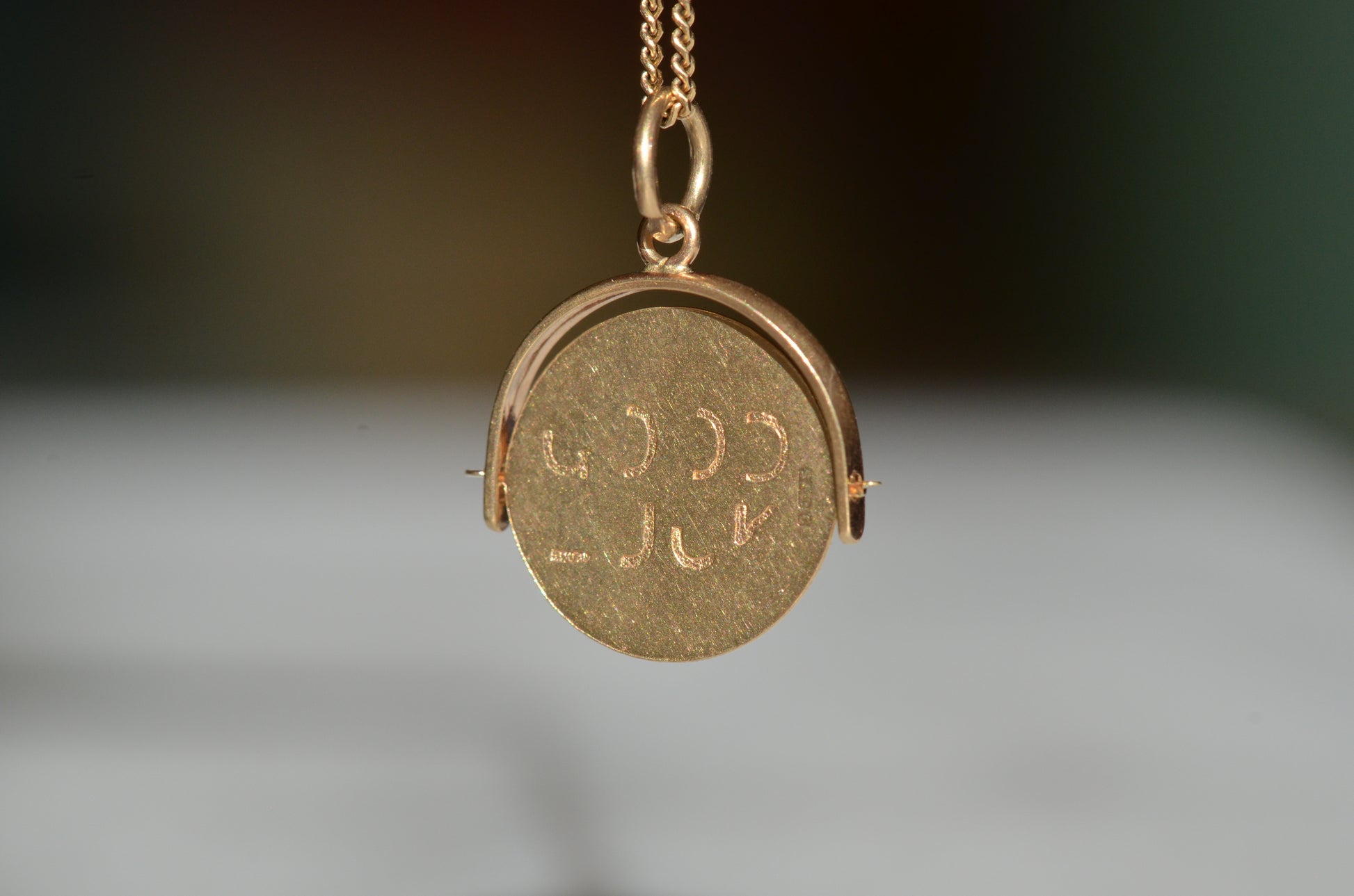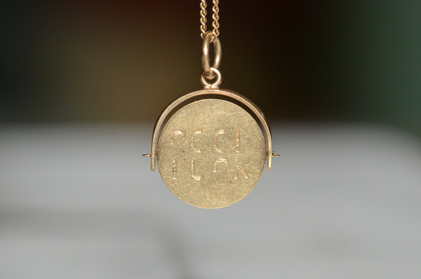 Straight from the mid-century charm craze, these delightful pieces can be added to your own charm bracelet or necklace, or worn alone on a chain to give them all the focus. Each side of the disc bears only a portion of each letter, creating a secret message that is only revealed when the disc is spun and in motion.