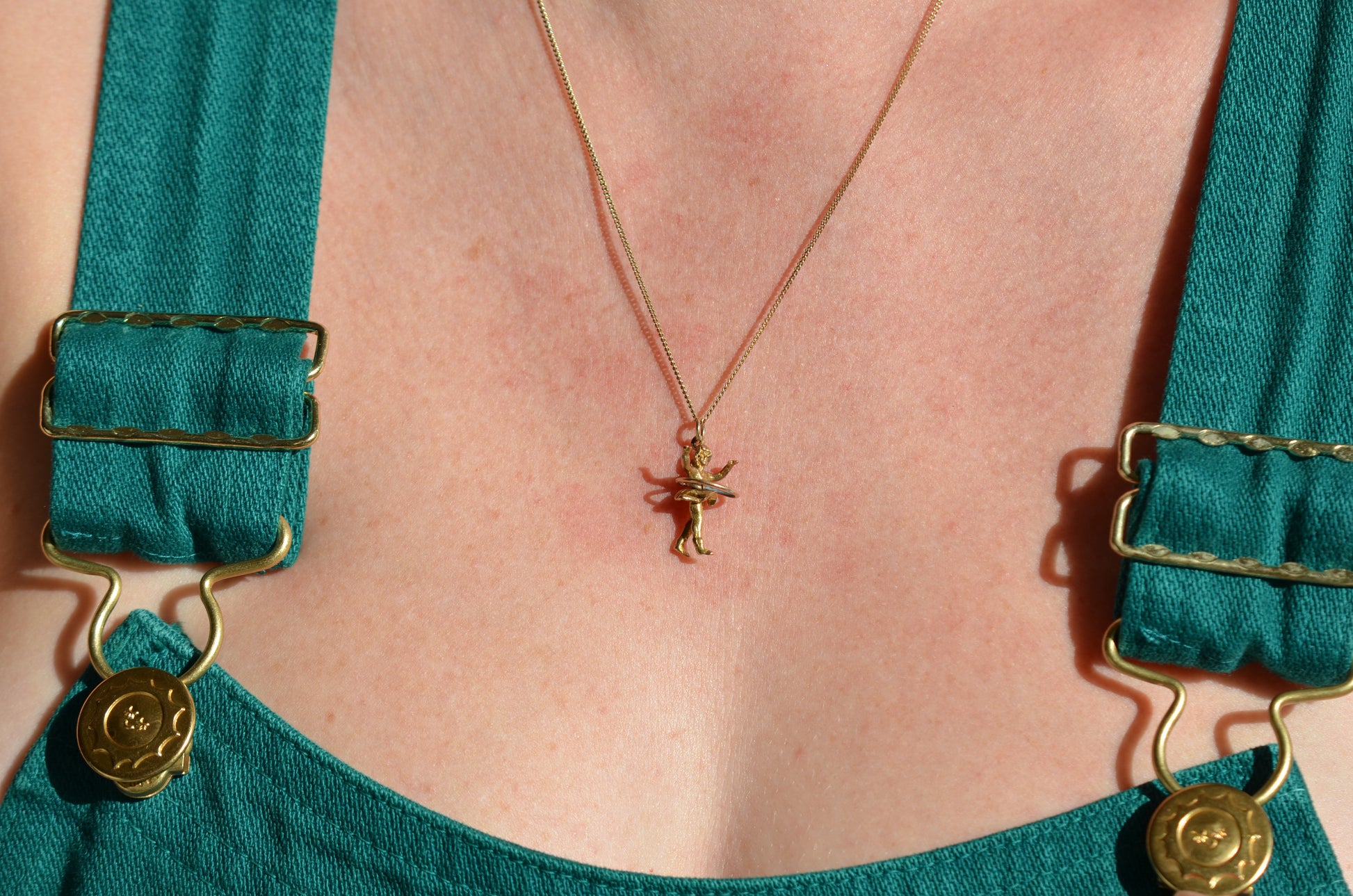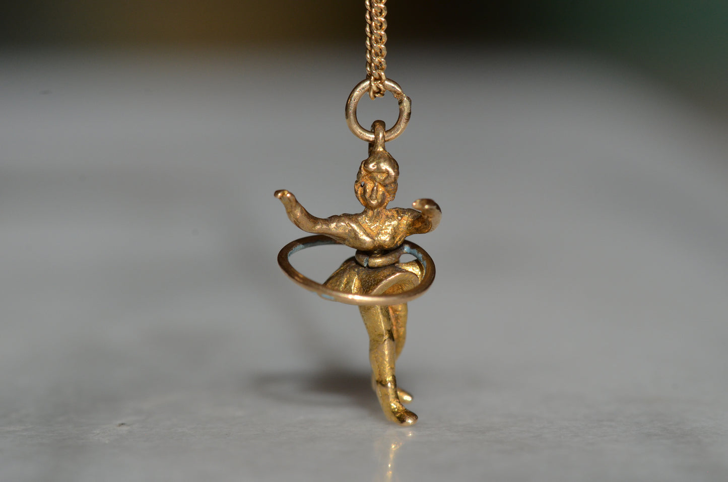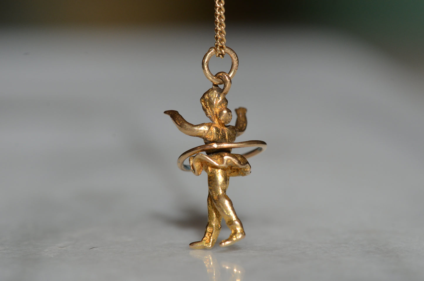 This whimsical charm features a girl mid-twirl, with a cleverly designed hula hoop fastened around her waist that allows it to endlessly spin and never fall. Though it didn't take the name "hula hoop" until the 20th century (the plastic toy version being invented in the 1950s and reigniting a fad), the practice has been around with natural materials for thousands of years. A perfect piece for the playful jeweler lover (and excellent for fidgeters).