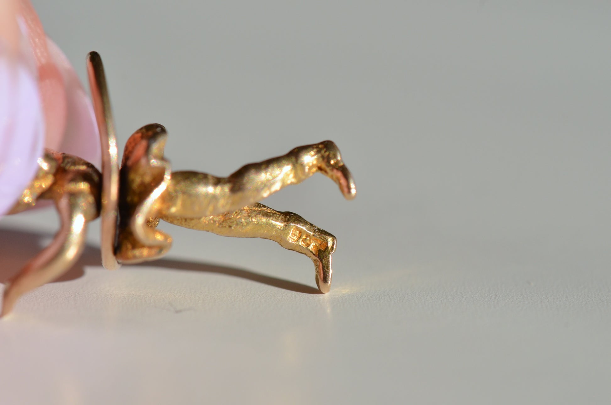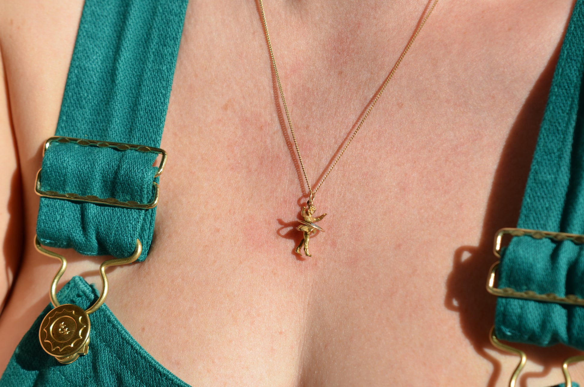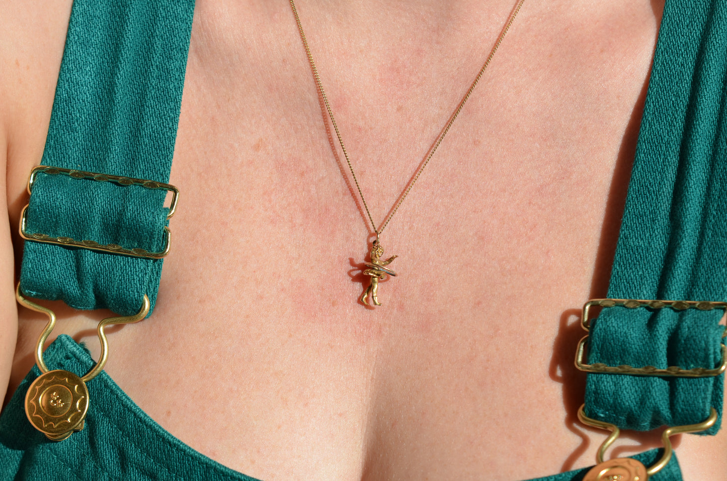 This whimsical charm features a girl mid-twirl, with a cleverly designed hula hoop fastened around her waist that allows it to endlessly spin and never fall. Though it didn't take the name "hula hoop" until the 20th century (the plastic toy version being invented in the 1950s and reigniting a fad), the practice has been around with natural materials for thousands of years. A perfect piece for the playful jeweler lover (and excellent for fidgeters).