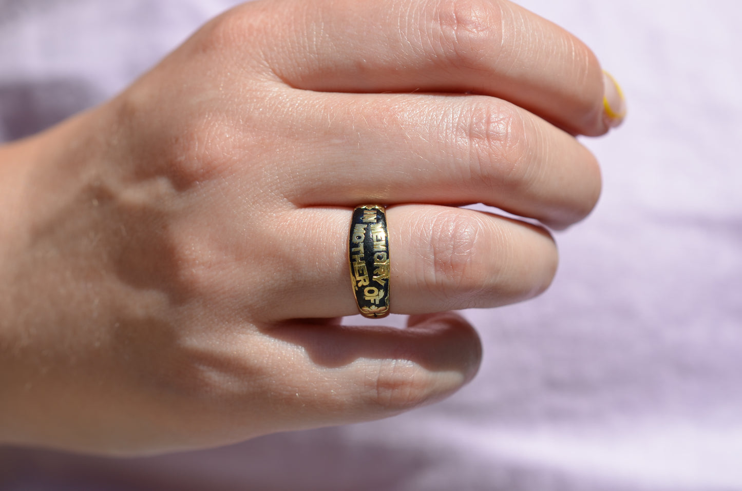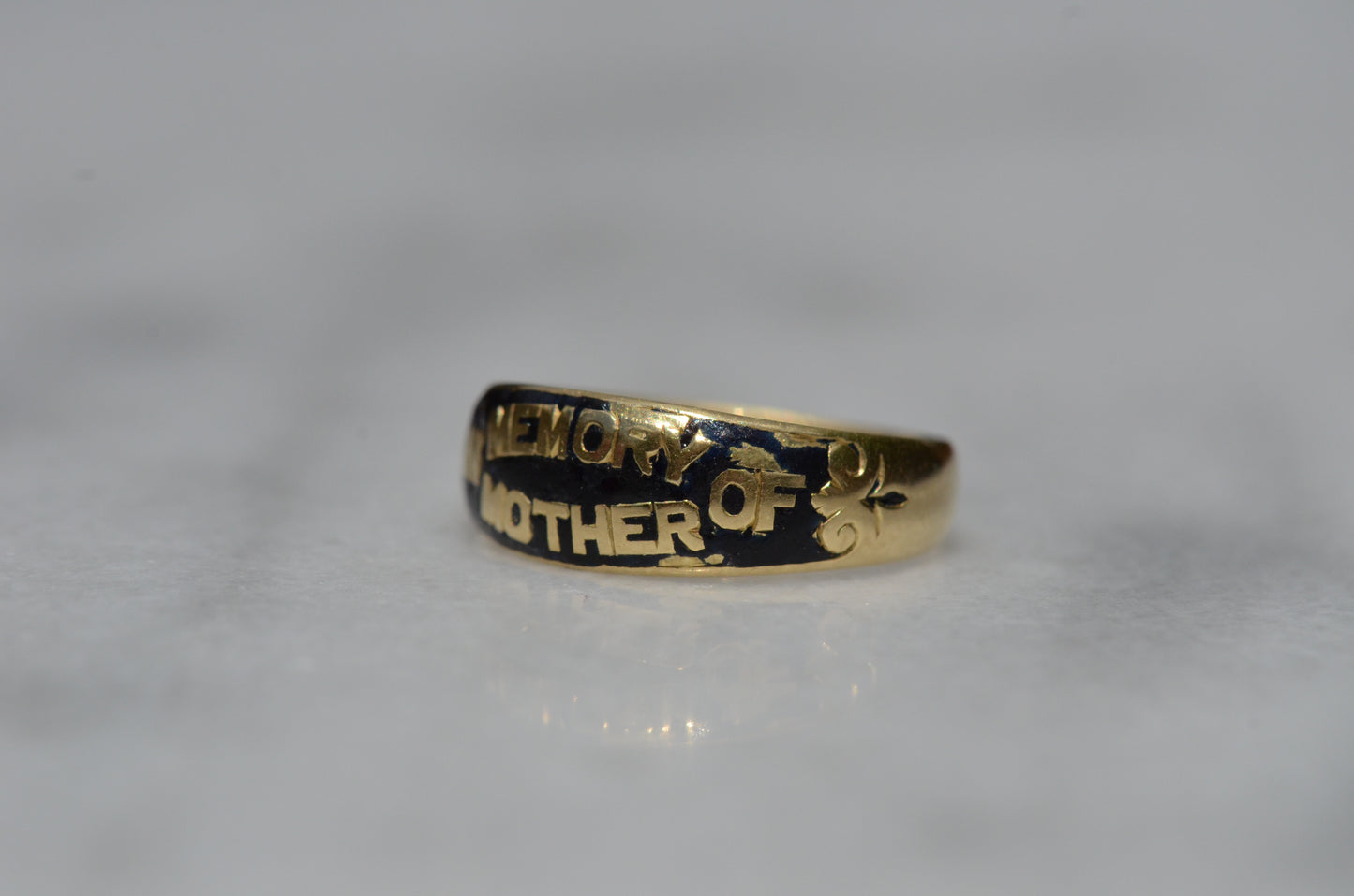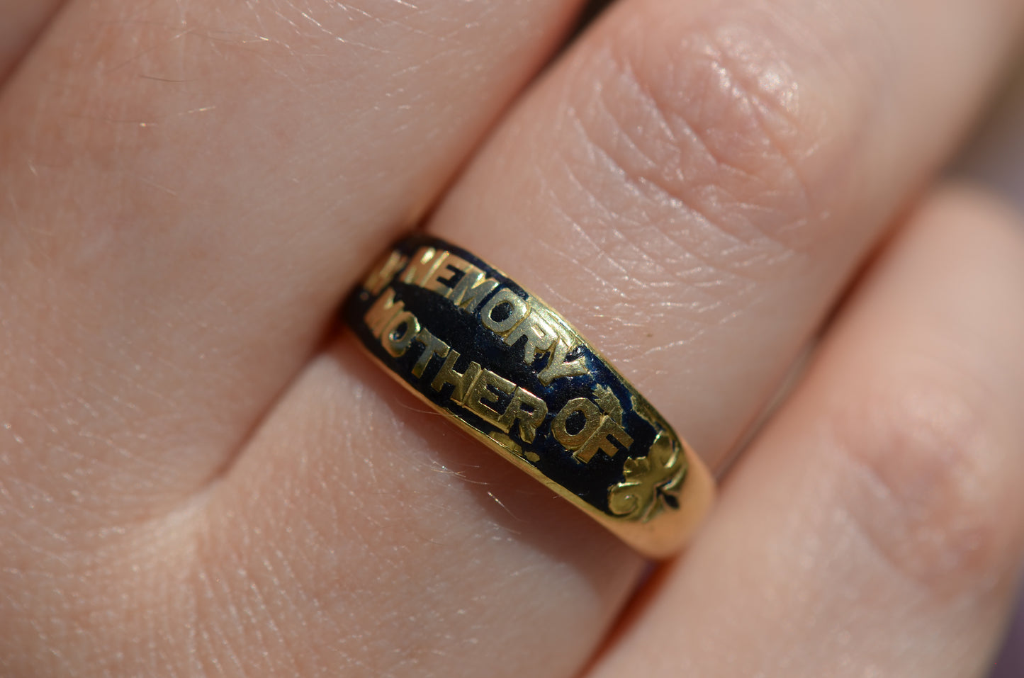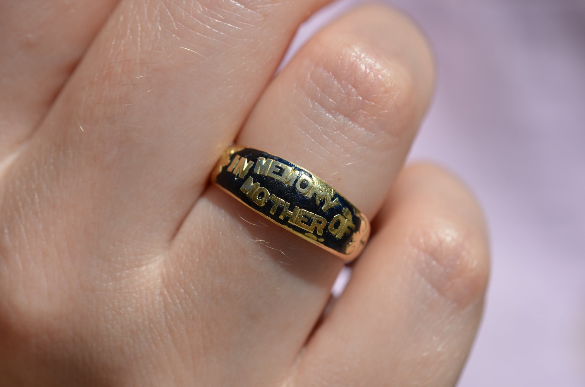 The demand for mourning pieces was so great that many jewelers created a selection of styles with popular sentiments on them - the phrase "In Memory Of" and black enameling, both seen here, were very popular, along with seed pearls, urn, and weeping willow imagery. There were often places for customization such as engraving or lockets for hair. While this particular piece doesn't bear further customization, it's clear that it was well worn and loved by someone, and provided a great deal of comfort in a time of loss.