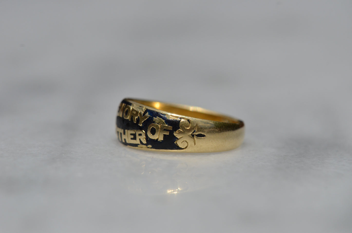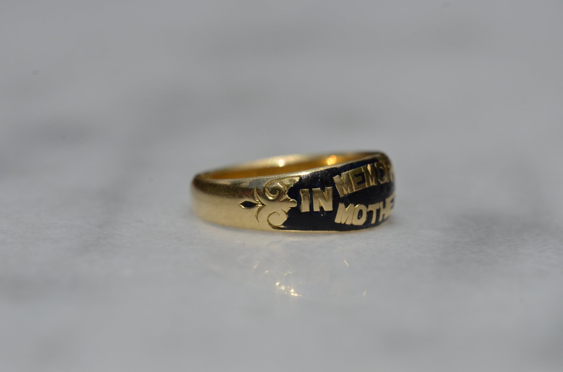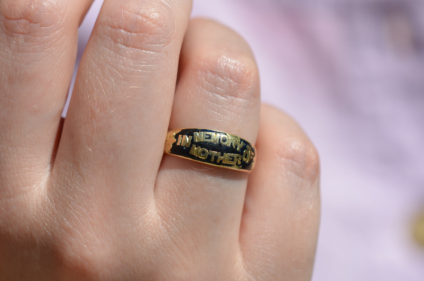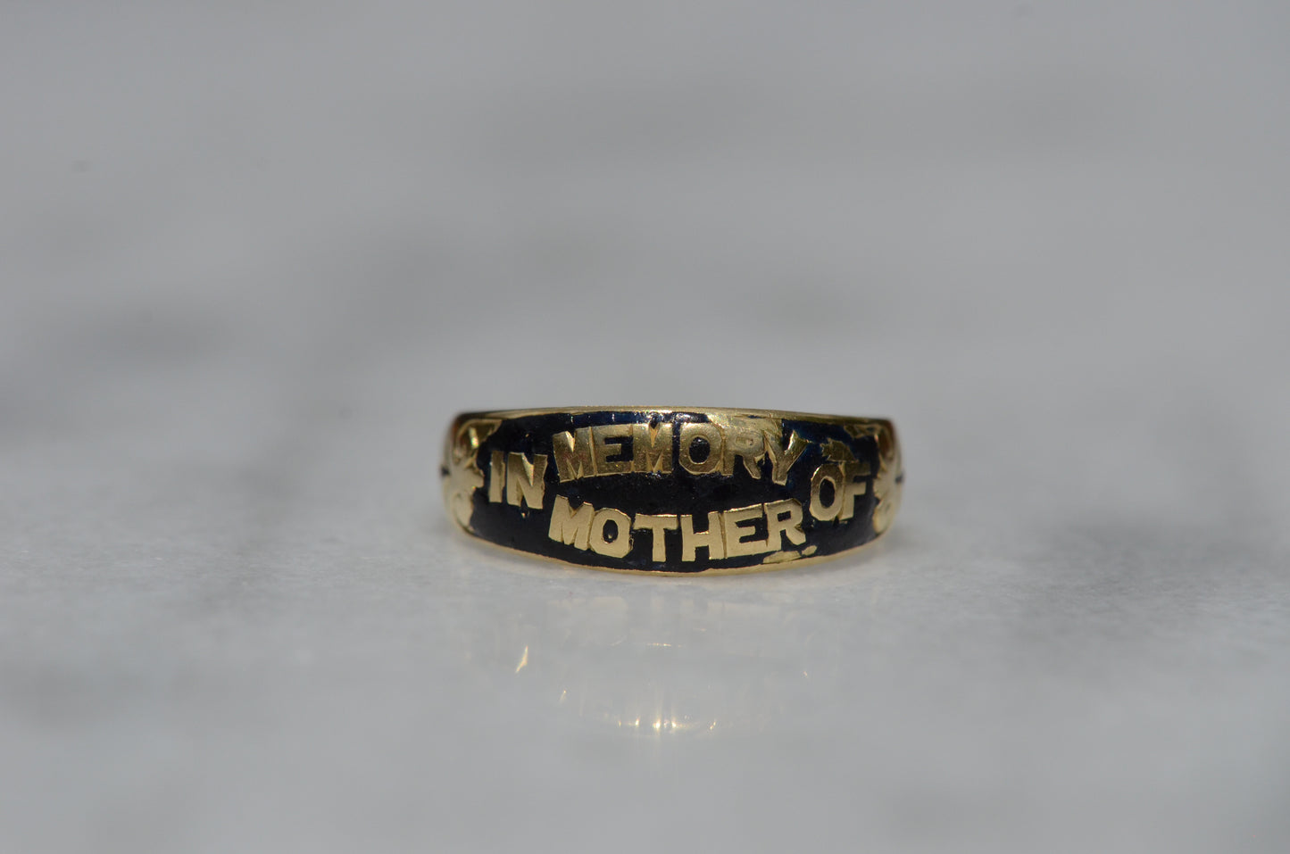 The demand for mourning pieces was so great that many jewelers created a selection of styles with popular sentiments on them - the phrase "In Memory Of" and black enameling, both seen here, were very popular, along with seed pearls, urn, and weeping willow imagery. There were often places for customization such as engraving or lockets for hair. While this particular piece doesn't bear further customization, it's clear that it was well worn and loved by someone, and provided a great deal of comfort in a time of loss.