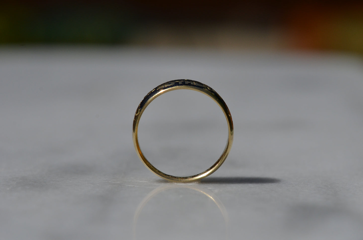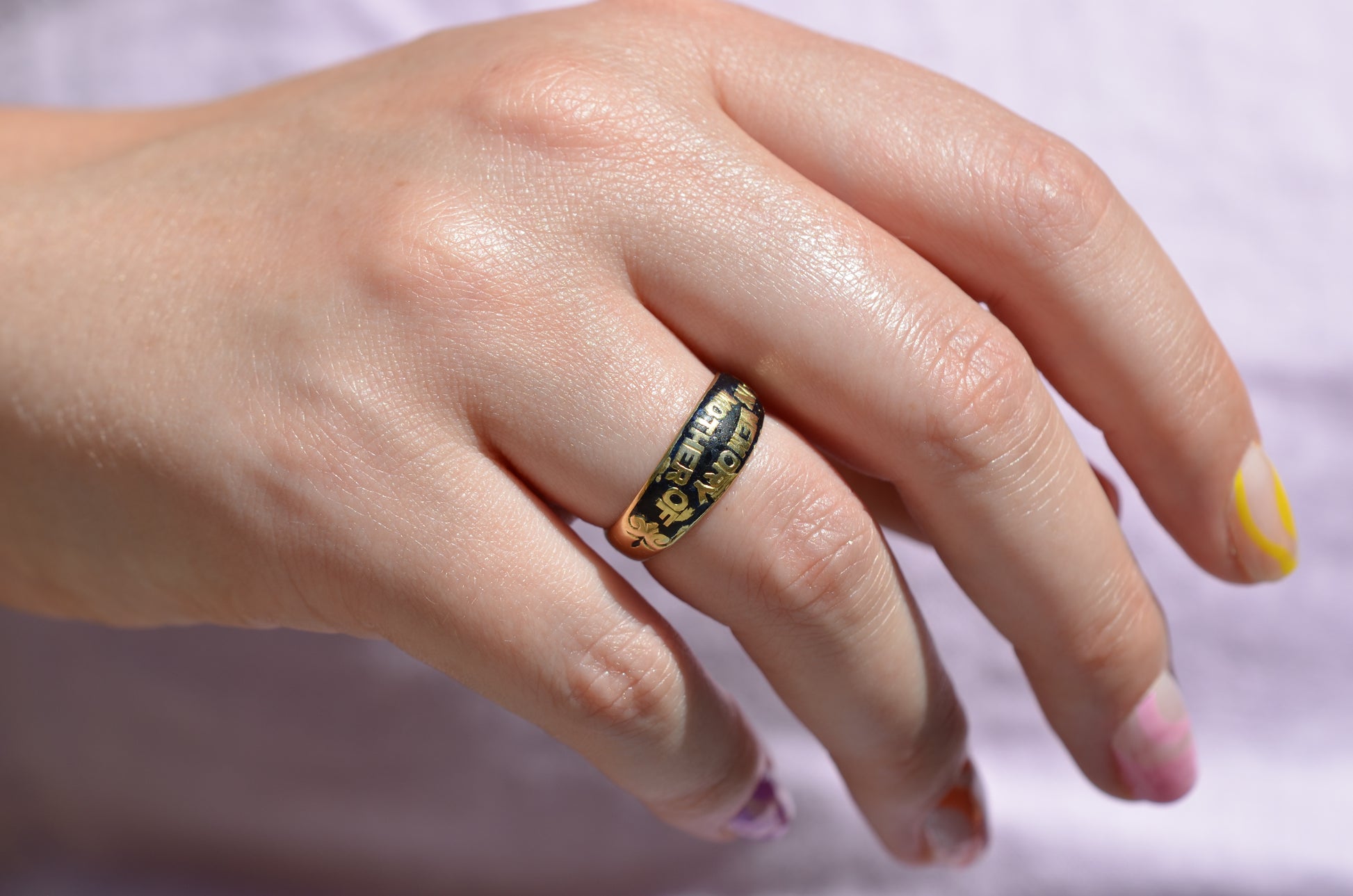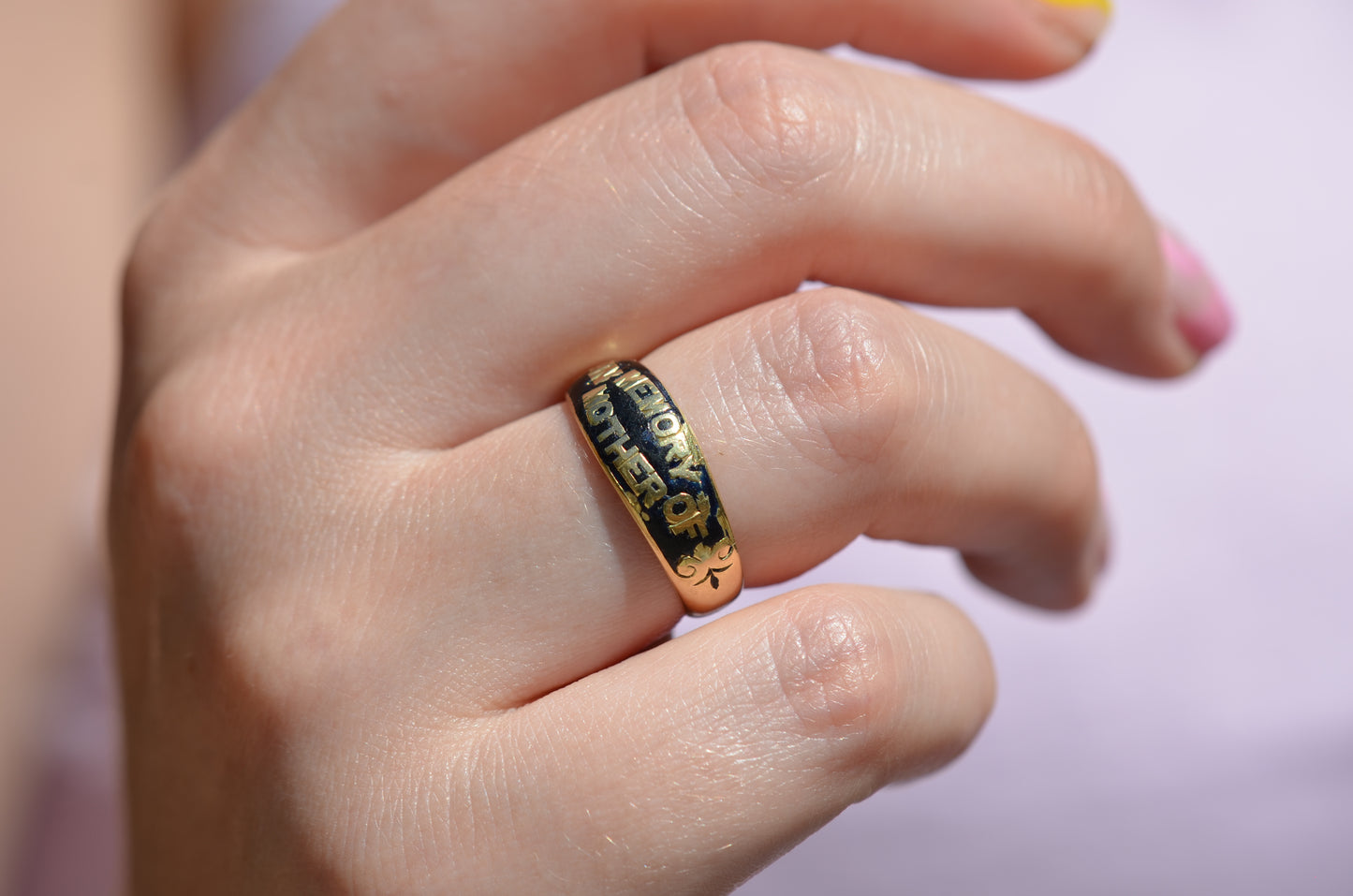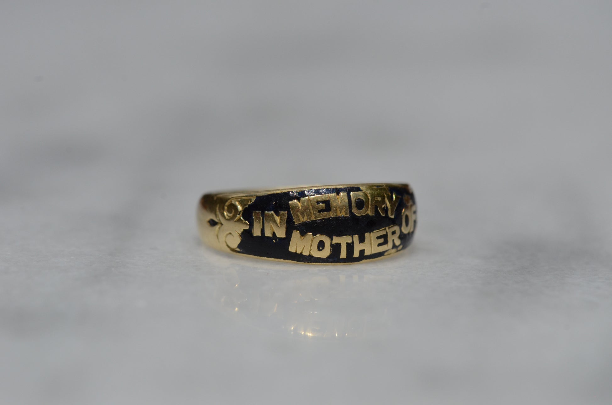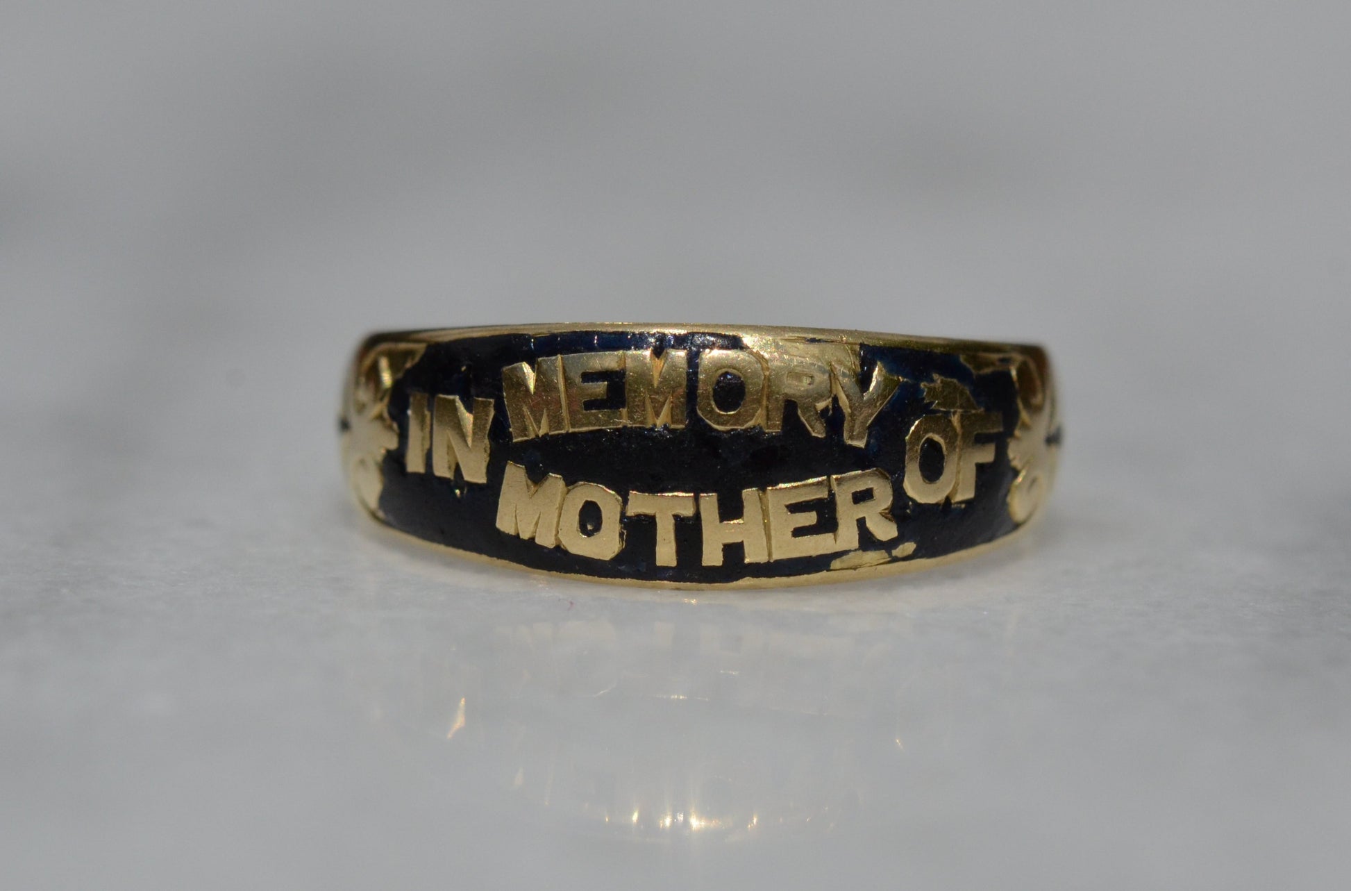 The demand for mourning pieces was so great that many jewelers created a selection of styles with popular sentiments on them - the phrase "In Memory Of" and black enameling, both seen here, were very popular, along with seed pearls, urn, and weeping willow imagery. There were often places for customization such as engraving or lockets for hair. While this particular piece doesn't bear further customization, it's clear that it was well worn and loved by someone, and provided a great deal of comfort in a time of loss.