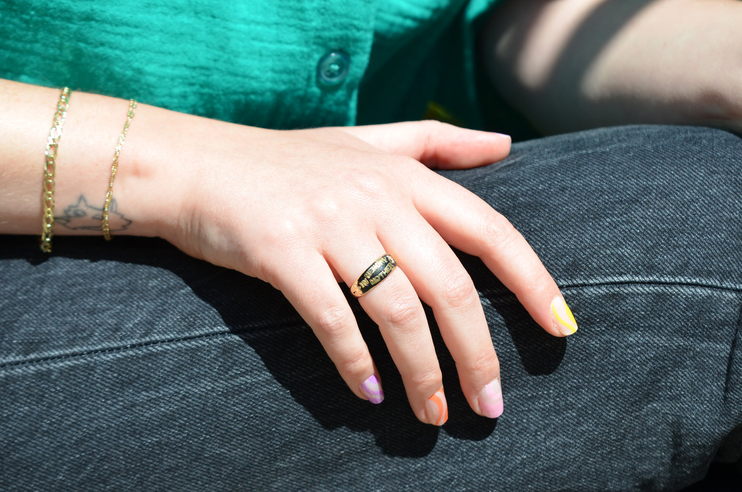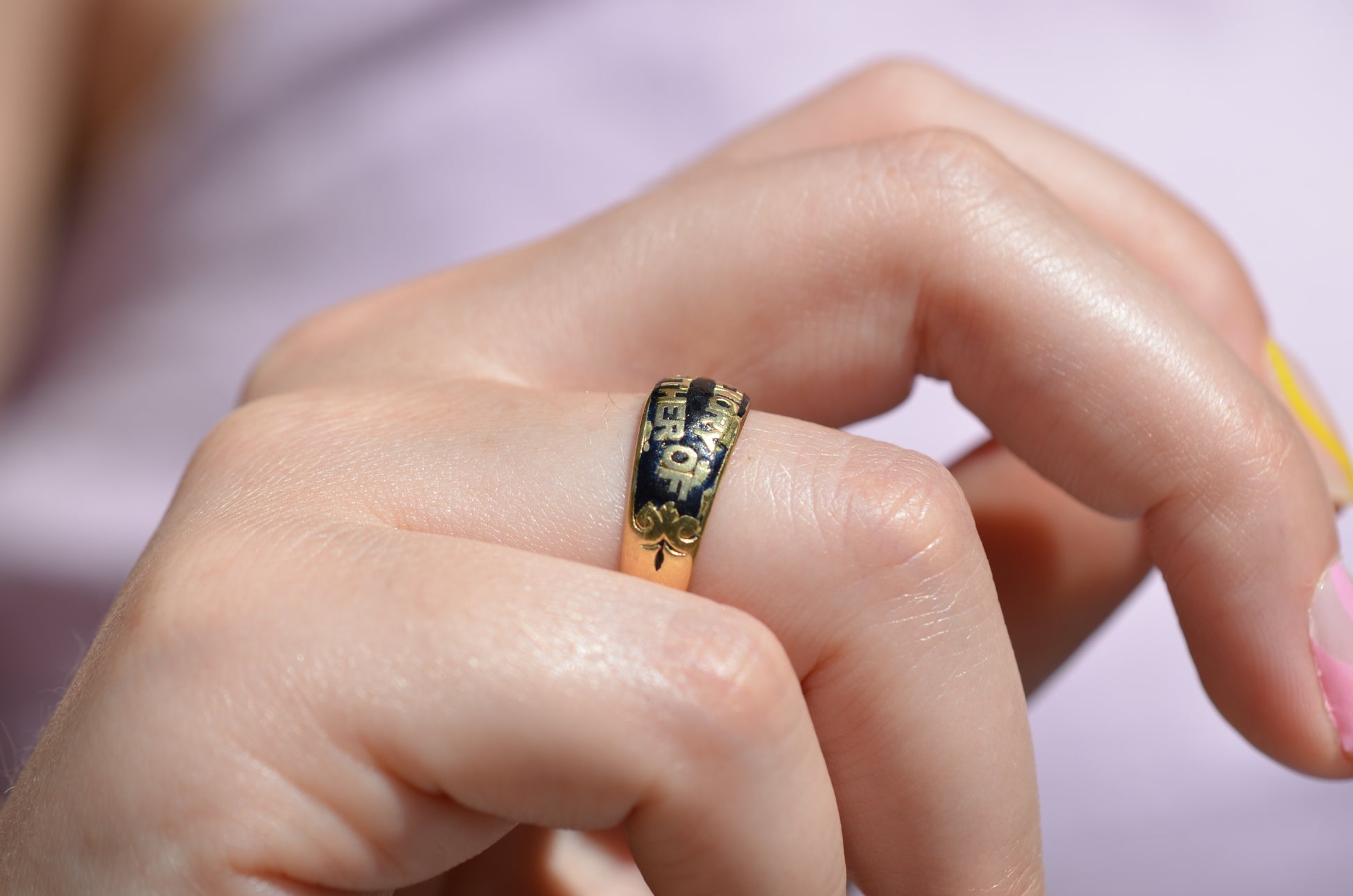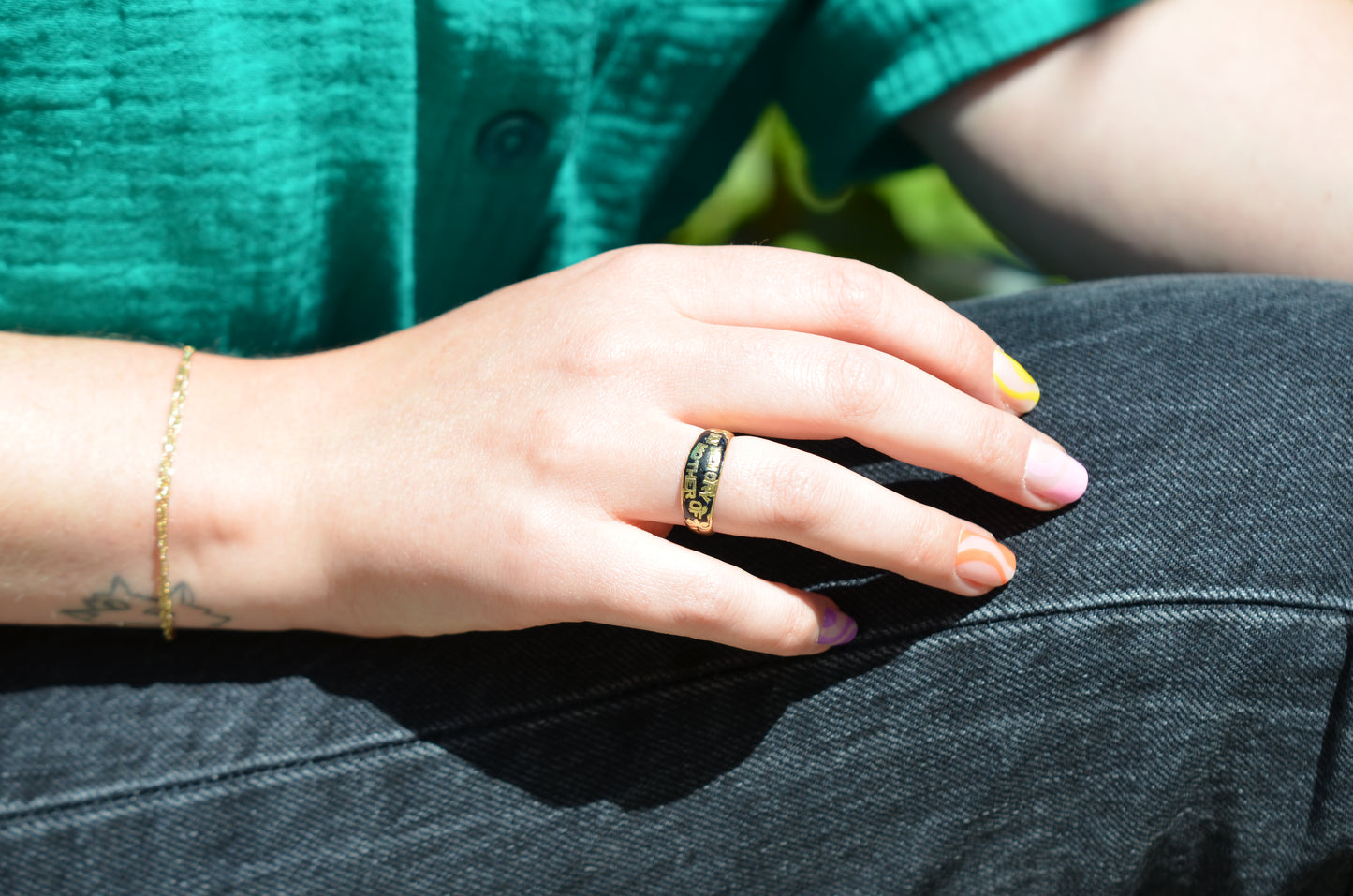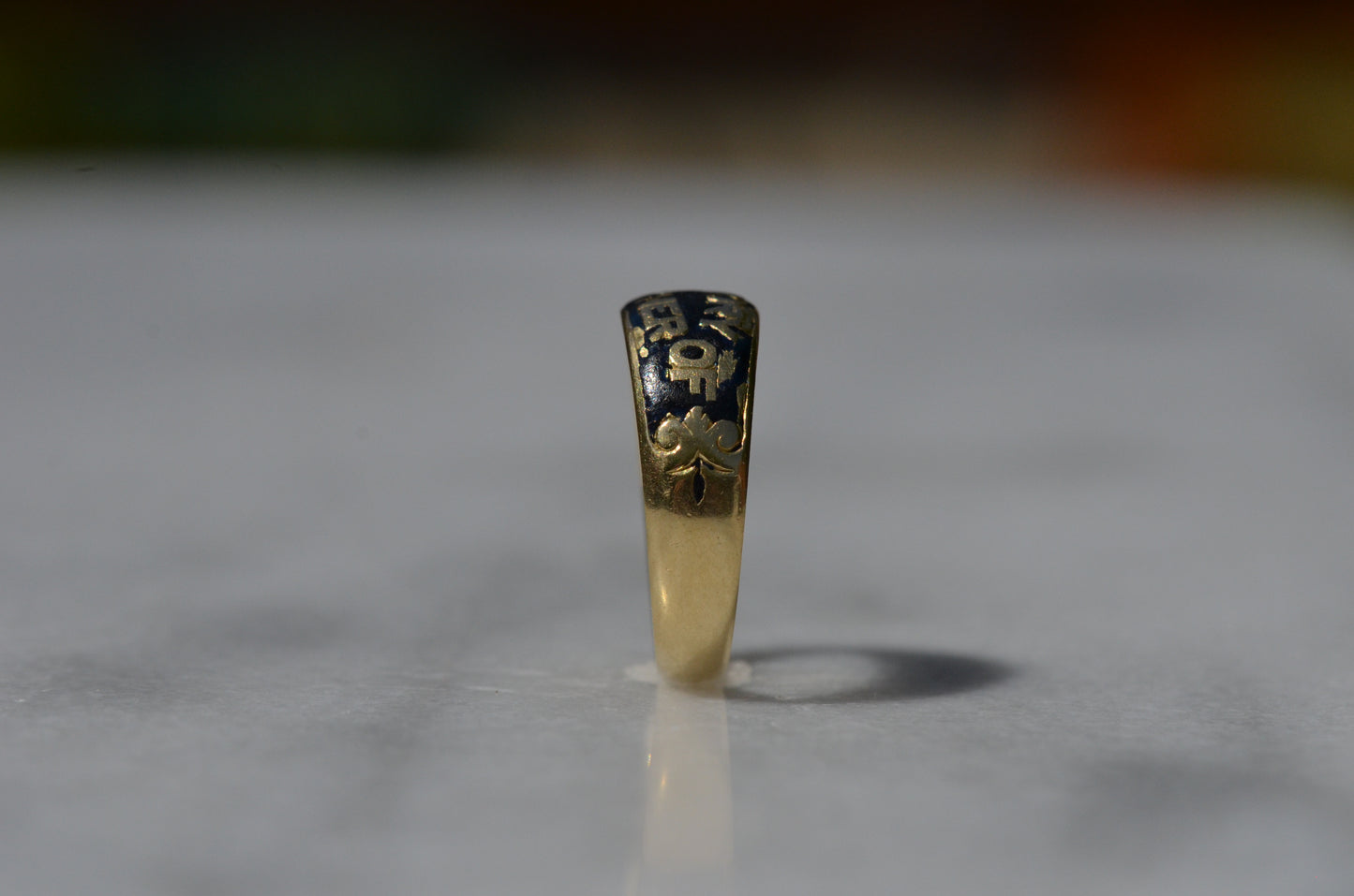 The demand for mourning pieces was so great that many jewelers created a selection of styles with popular sentiments on them - the phrase "In Memory Of" and black enameling, both seen here, were very popular, along with seed pearls, urn, and weeping willow imagery. There were often places for customization such as engraving or lockets for hair. While this particular piece doesn't bear further customization, it's clear that it was well worn and loved by someone, and provided a great deal of comfort in a time of loss.