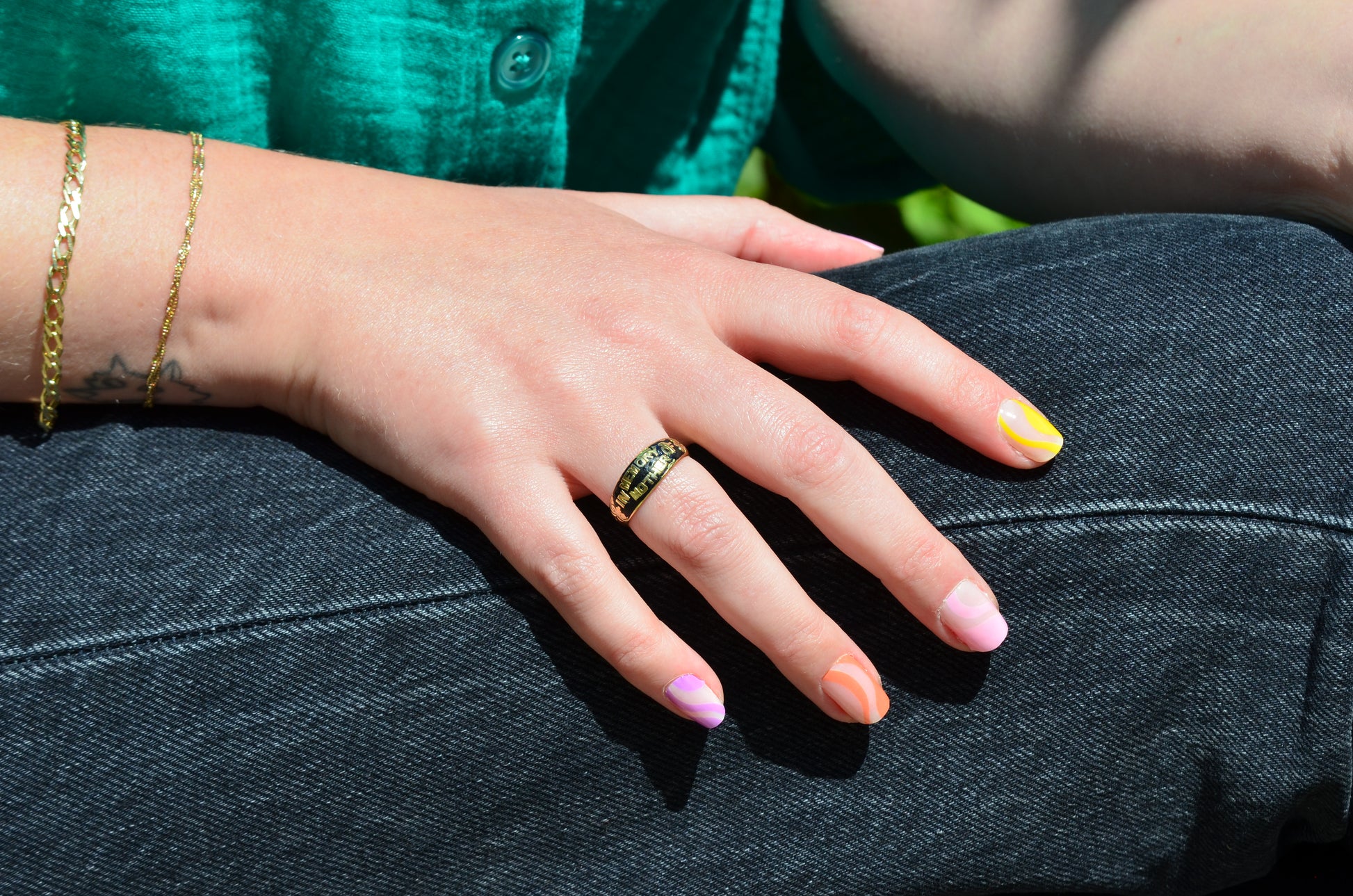 • Face of ring measures 7.1mm wide, with a rise of 1.6mm; back of band measures 3.4mm wide and 0.8mm thick