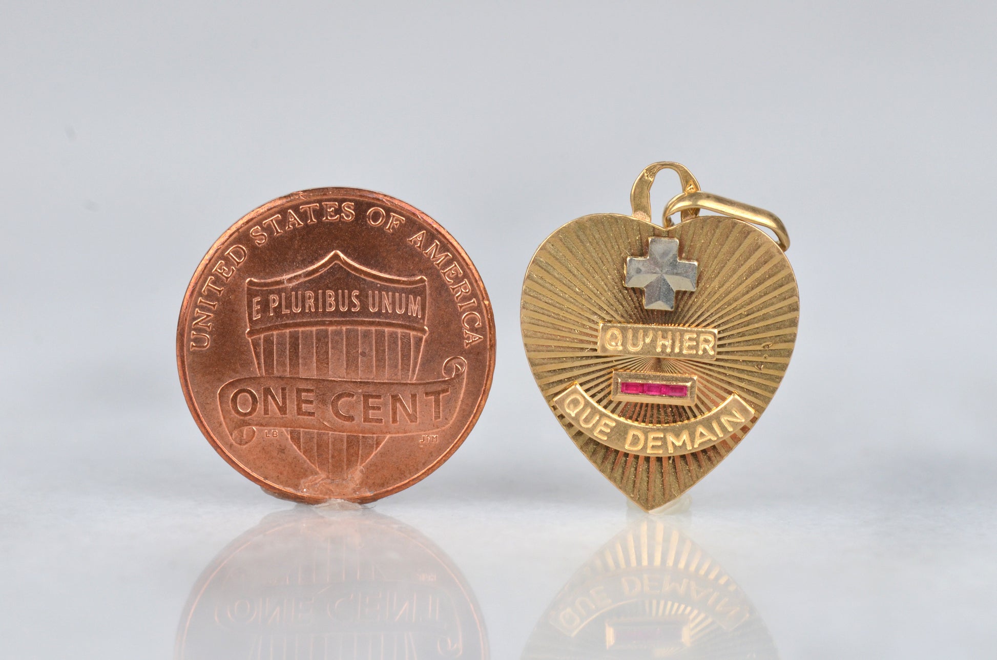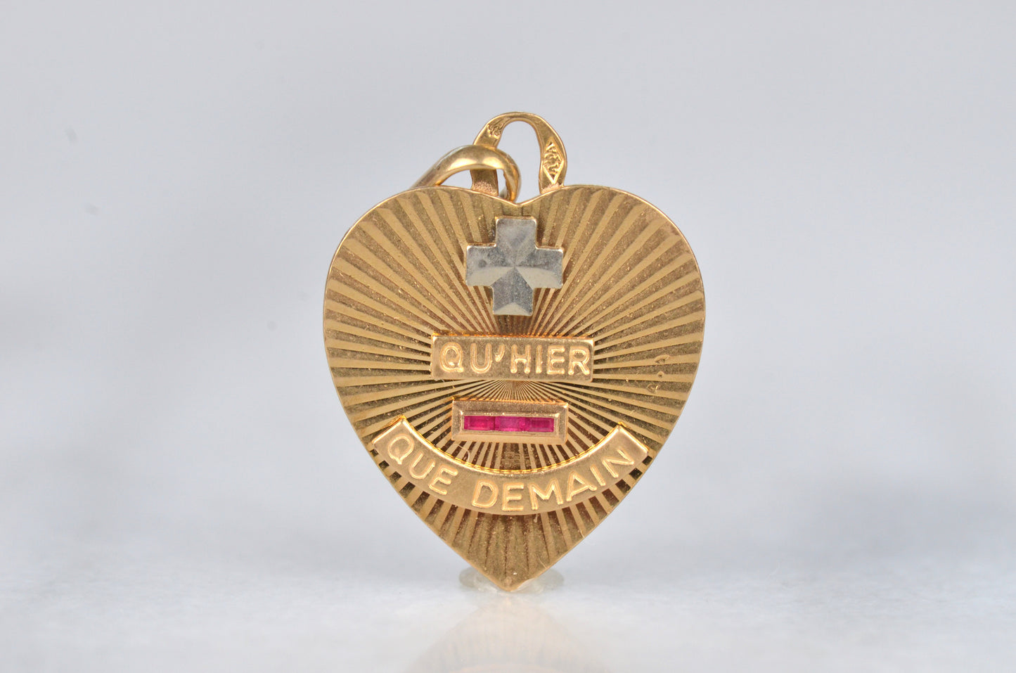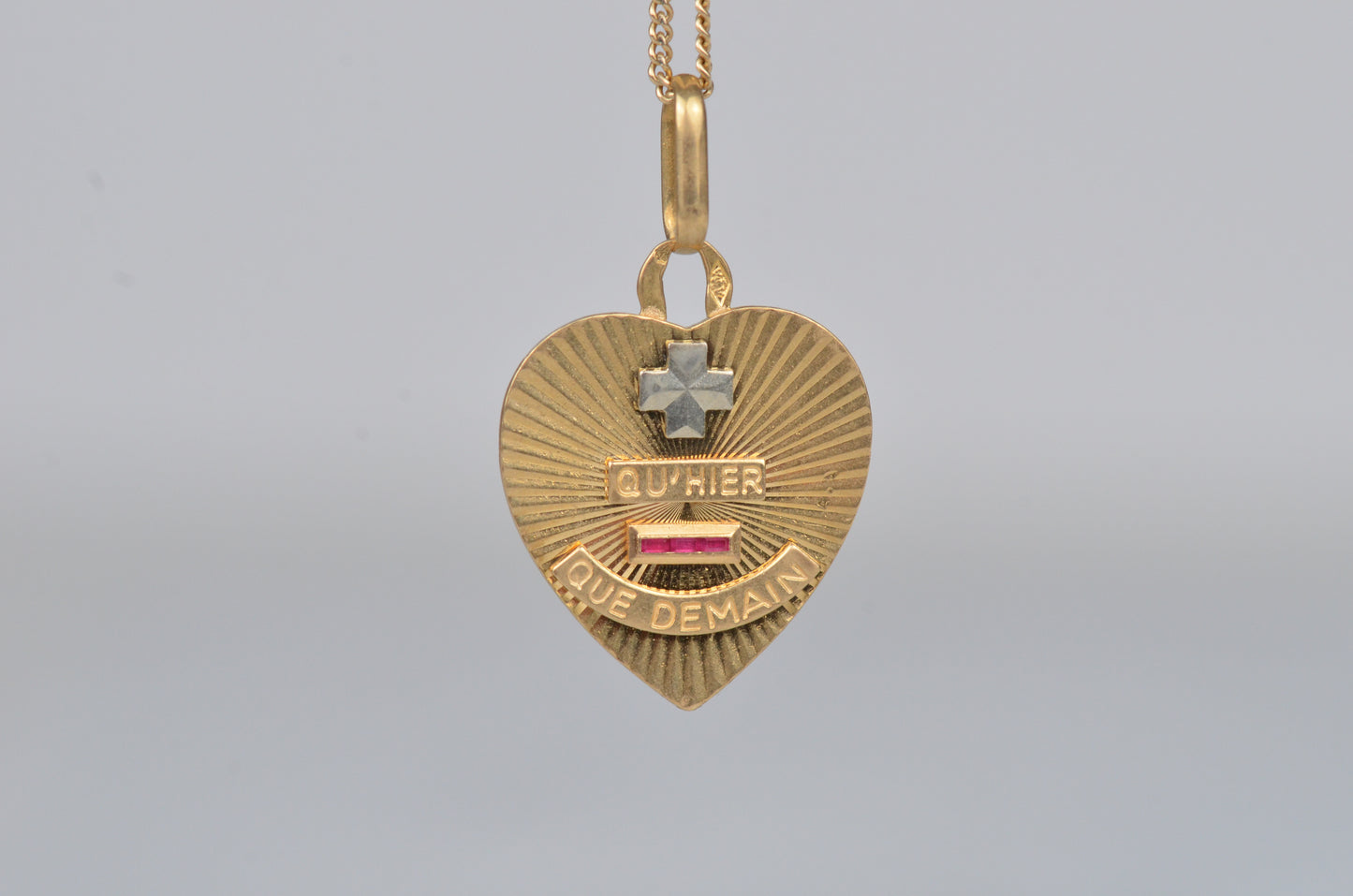 Beautiful vintage French love token, in a romantic heart shape with synthetic ruby details. Created by Alphonse Augis and inspired by a letter poet Rosemonde Gérard wrote to her husband, the writer Edmond Rostand, the pendant features a rebus reading "+ qu'hier - que demain" for the lines,
