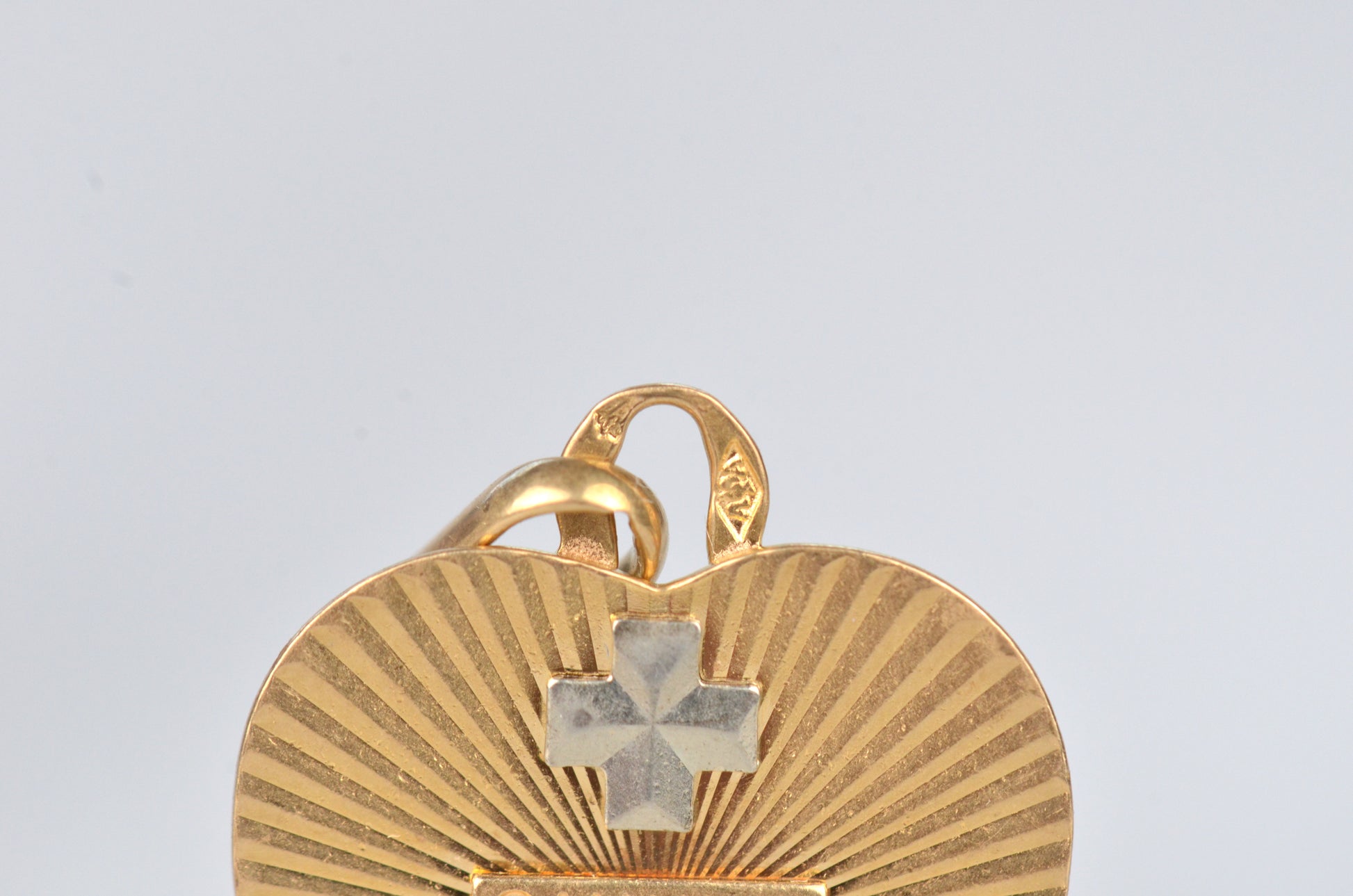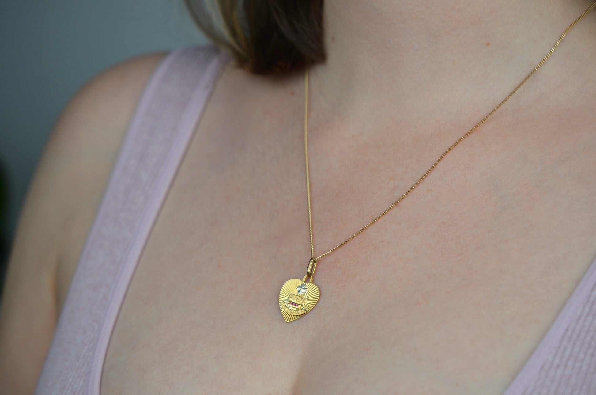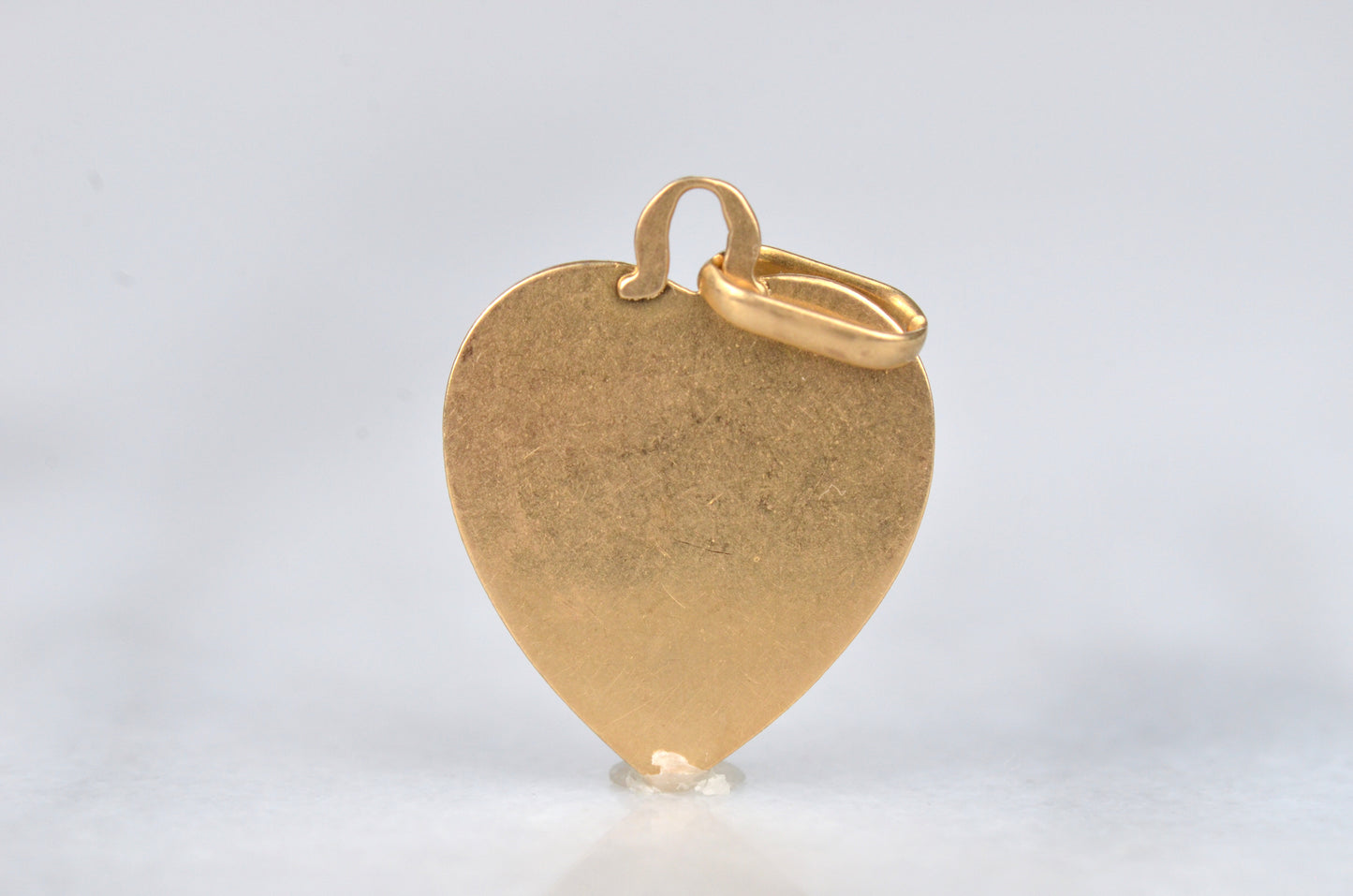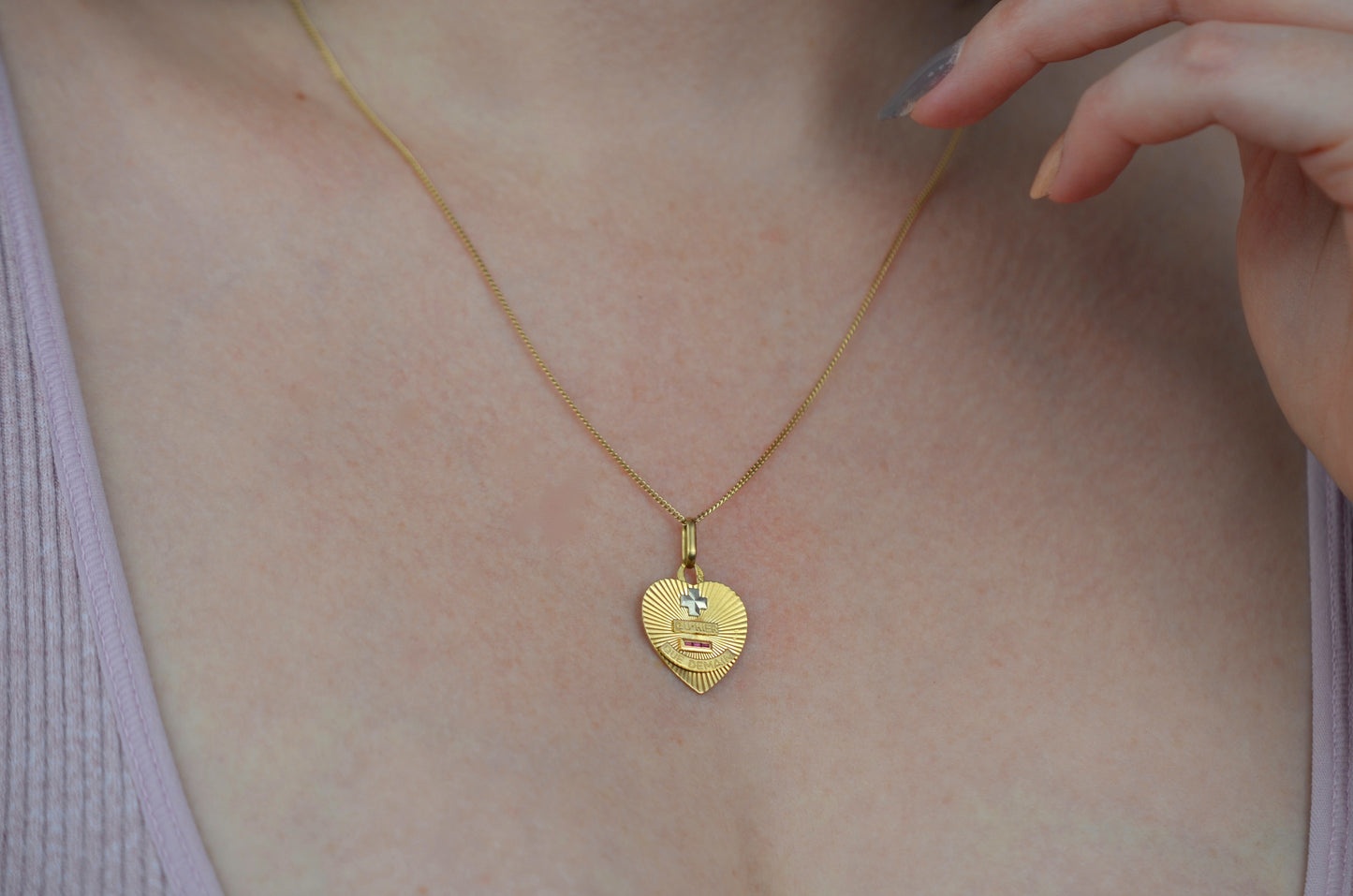 Beautiful vintage French love token, in a romantic heart shape with synthetic ruby details. Created by Alphonse Augis and inspired by a letter poet Rosemonde Gérard wrote to her husband, the writer Edmond Rostand, the pendant features a rebus reading "+ qu'hier - que demain" for the lines,