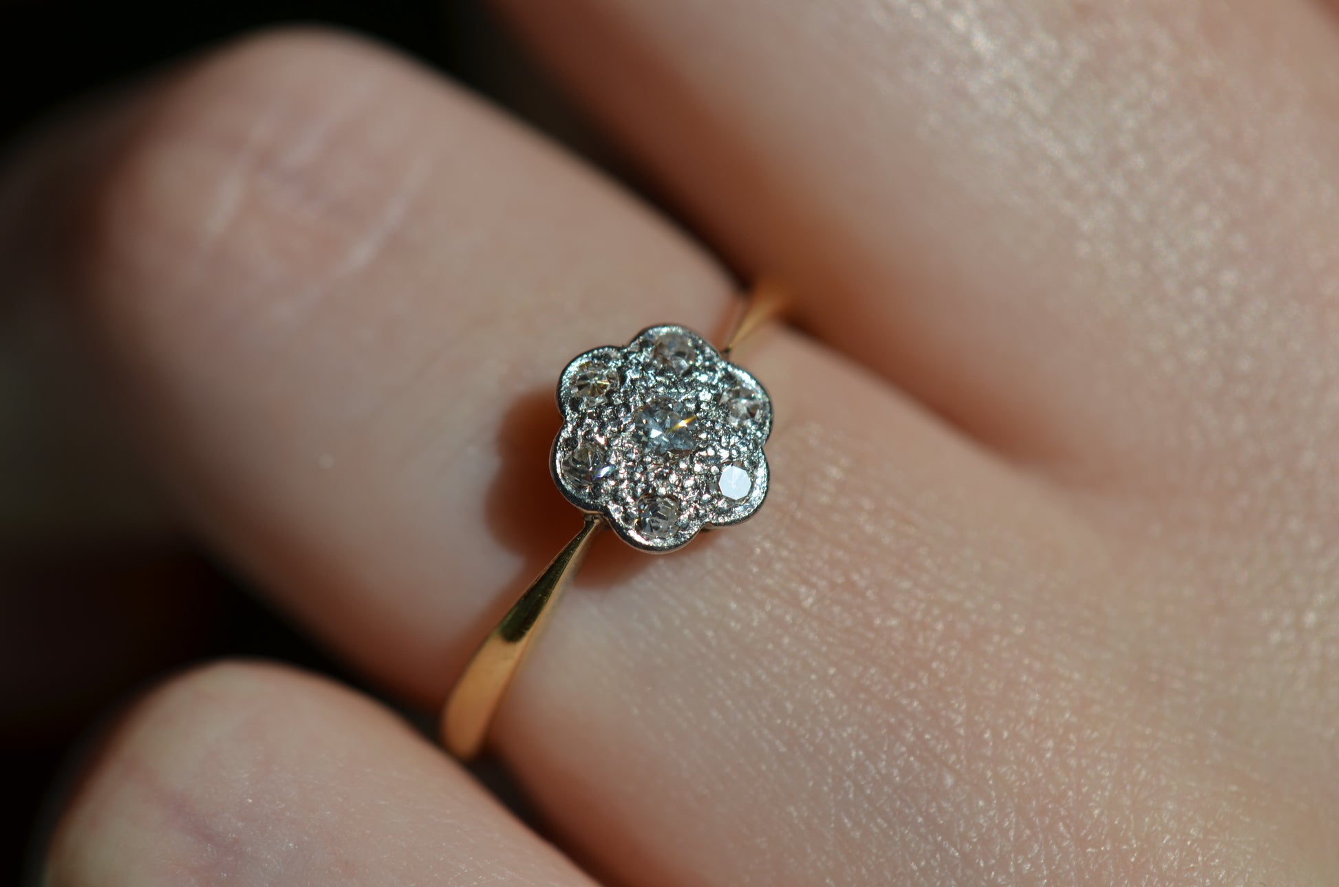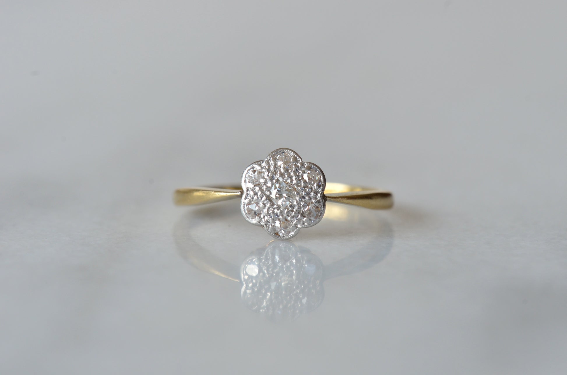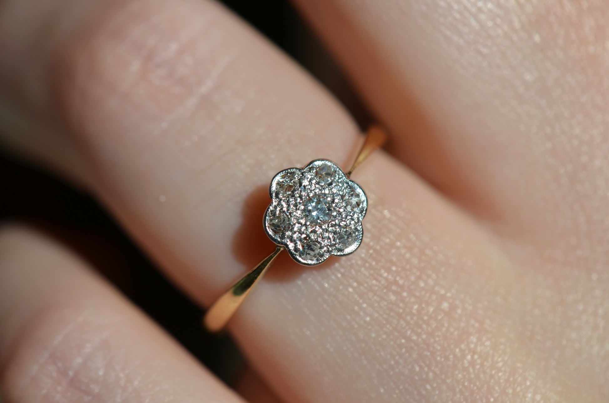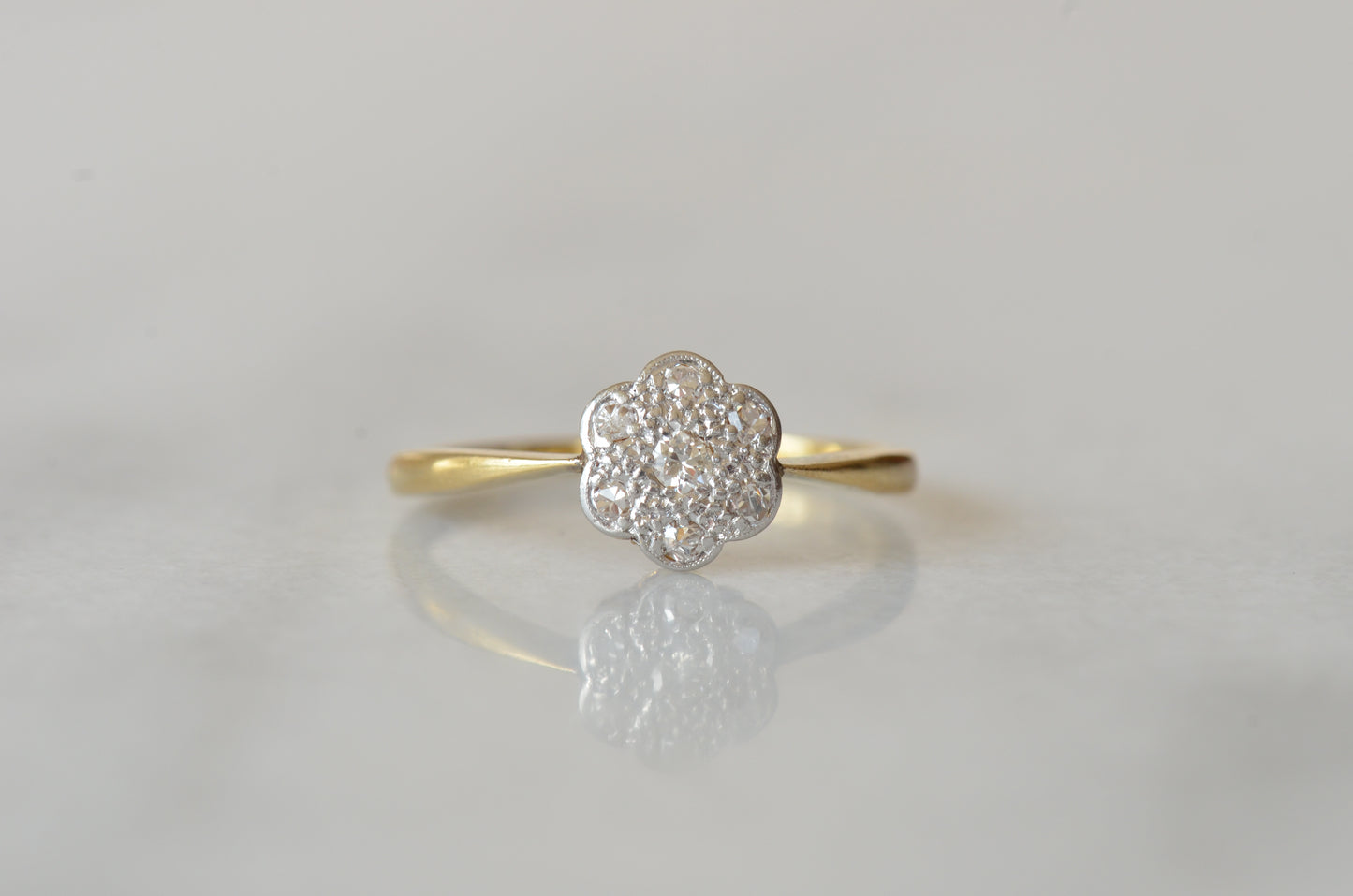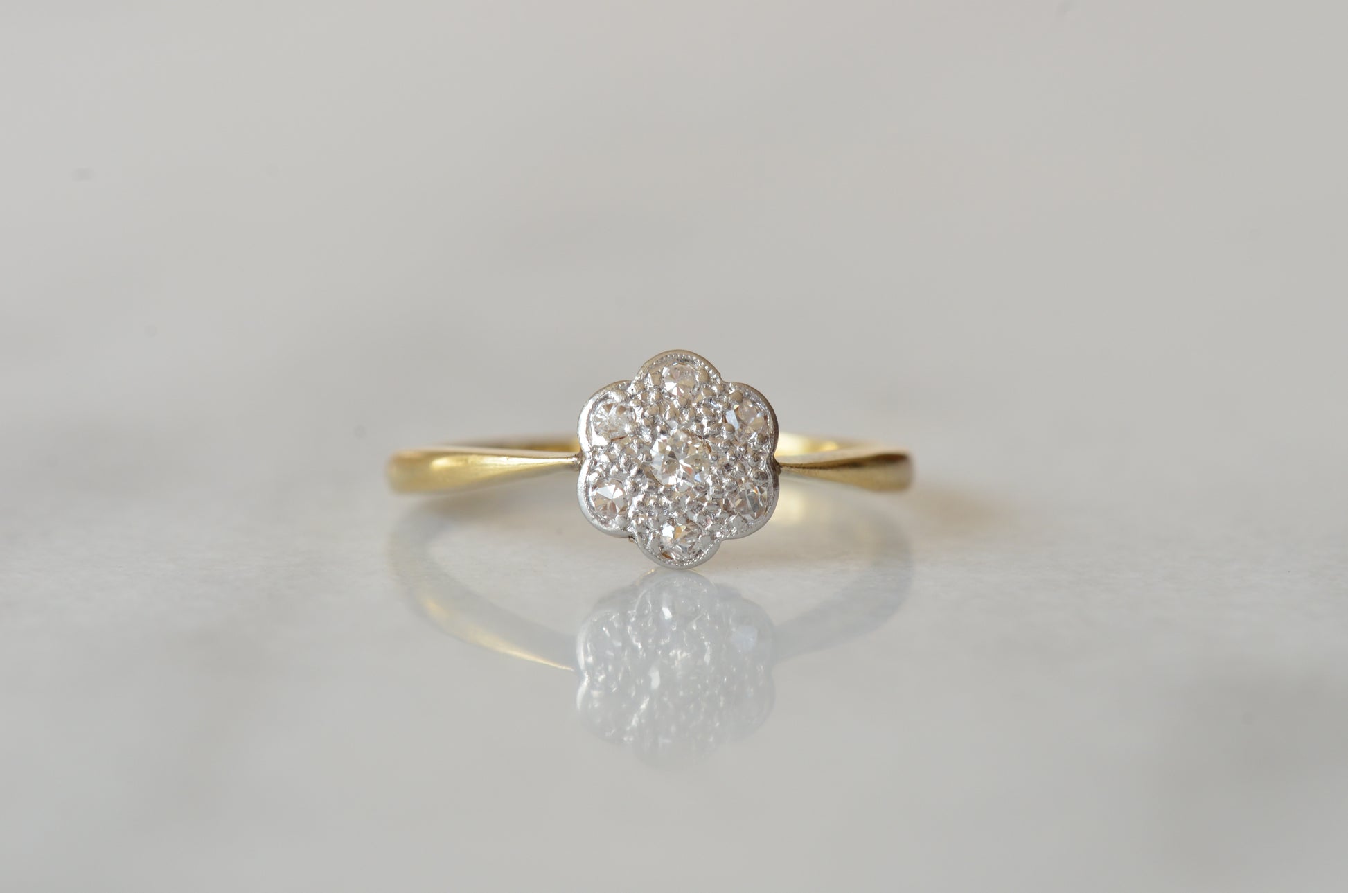 Daisy cluster rings were popular in the Edwardian and Art Deco periods, and looking back to Victorians' love of symbolism, the daisy has long be representative of a simple, pure love and innocence. Consider as well Fitzgerald's glamorous and tragic heroine Daisy Buchanan, introduced to the world in 1925, and you'll see the continued popularity of the flower through the first half of the century. This particular ring appears to date a little later, likely to the 1930s.