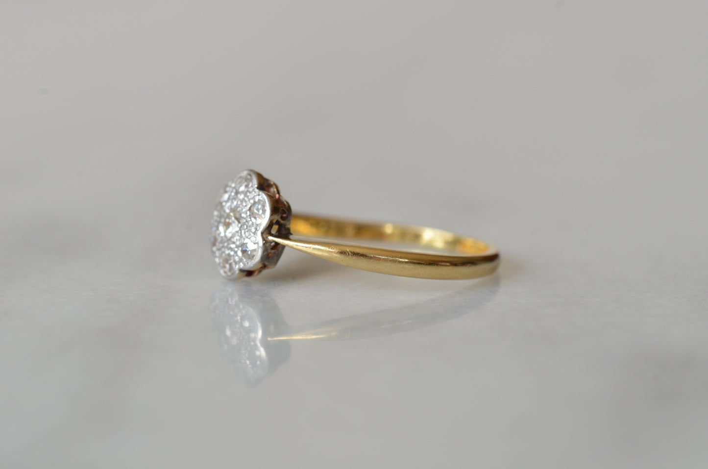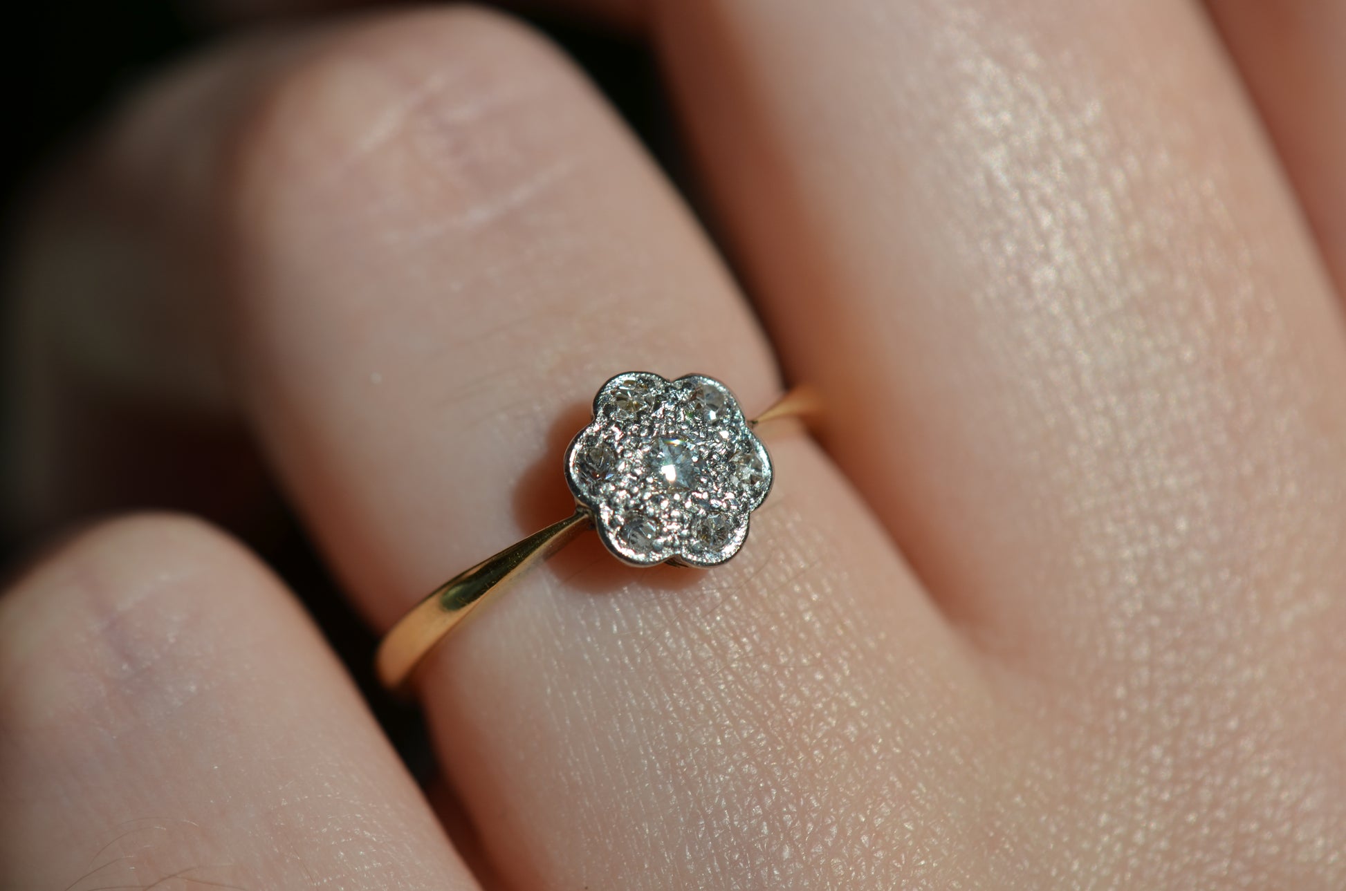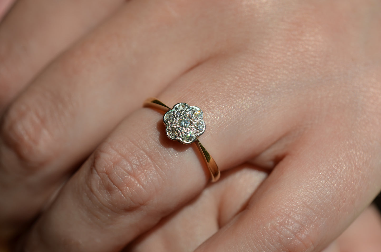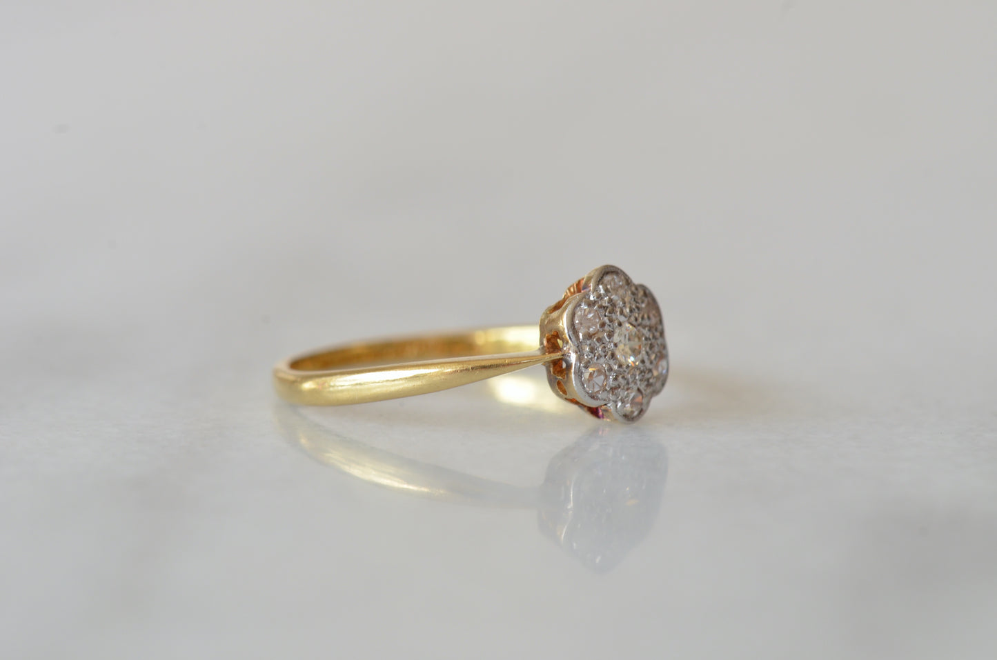 Daisy cluster rings were popular in the Edwardian and Art Deco periods, and looking back to Victorians' love of symbolism, the daisy has long be representative of a simple, pure love and innocence. Consider as well Fitzgerald's glamorous and tragic heroine Daisy Buchanan, introduced to the world in 1925, and you'll see the continued popularity of the flower through the first half of the century. This particular ring appears to date a little later, likely to the 1930s.