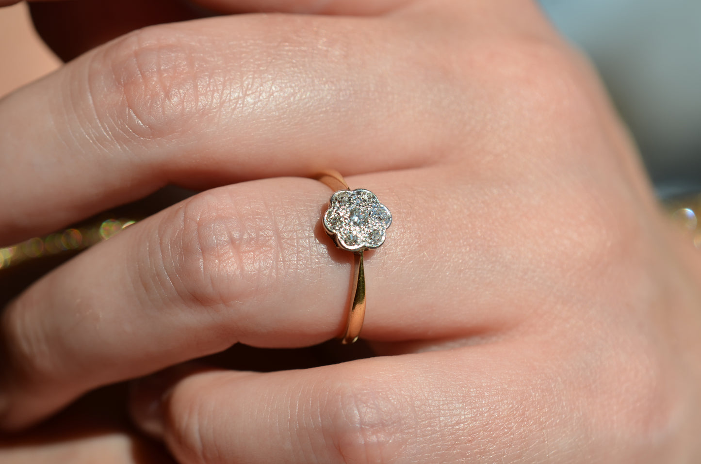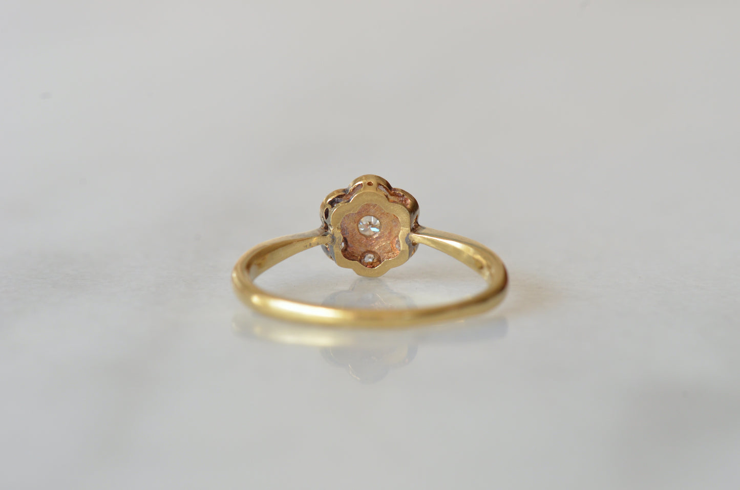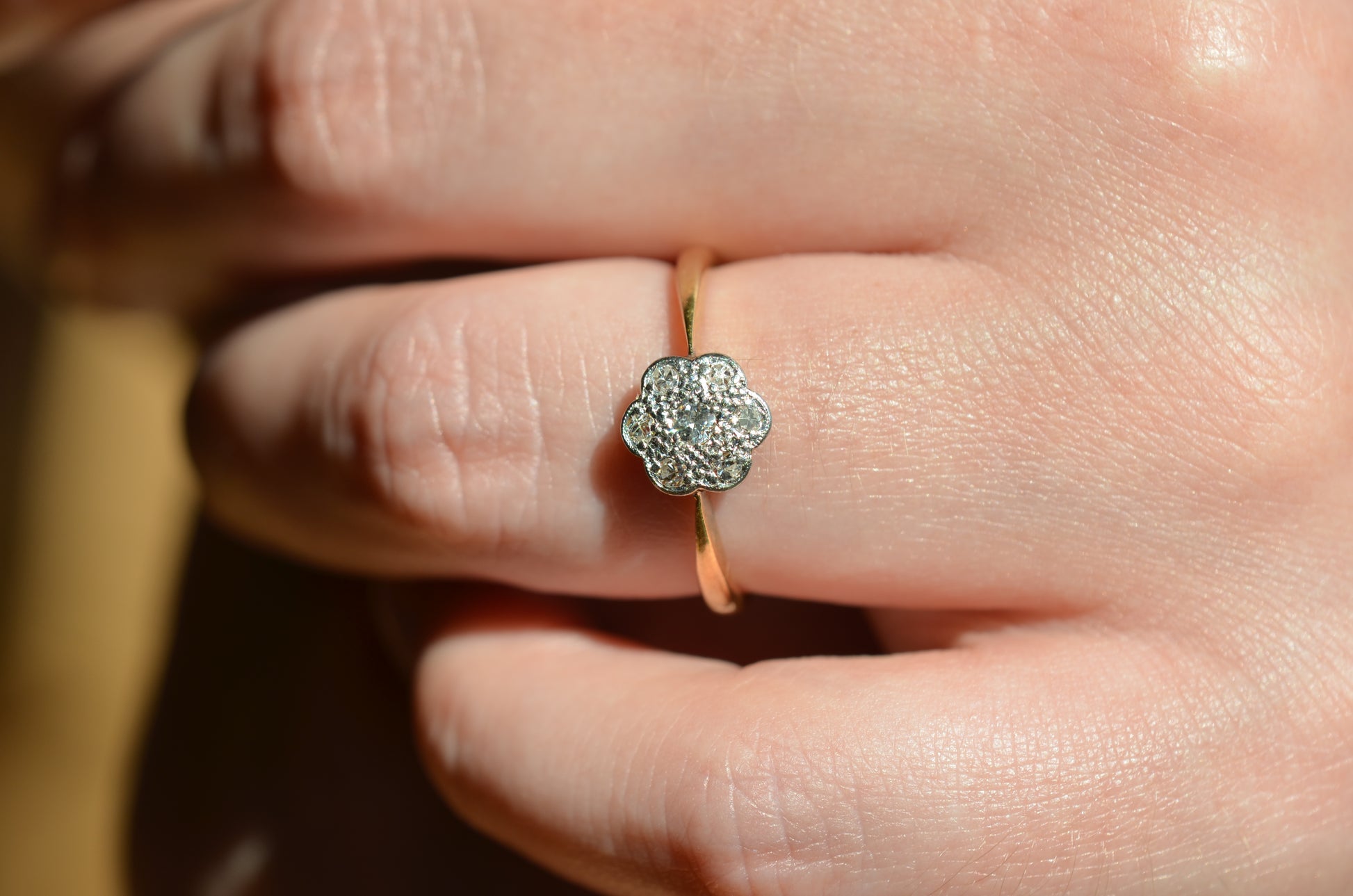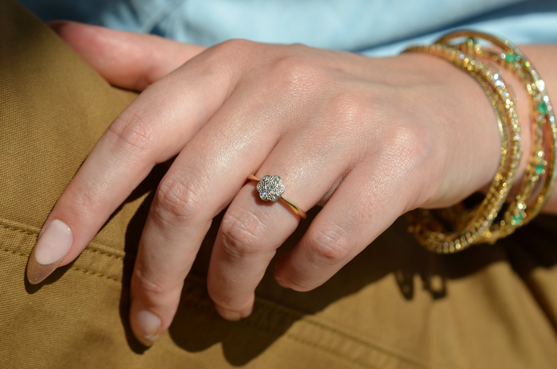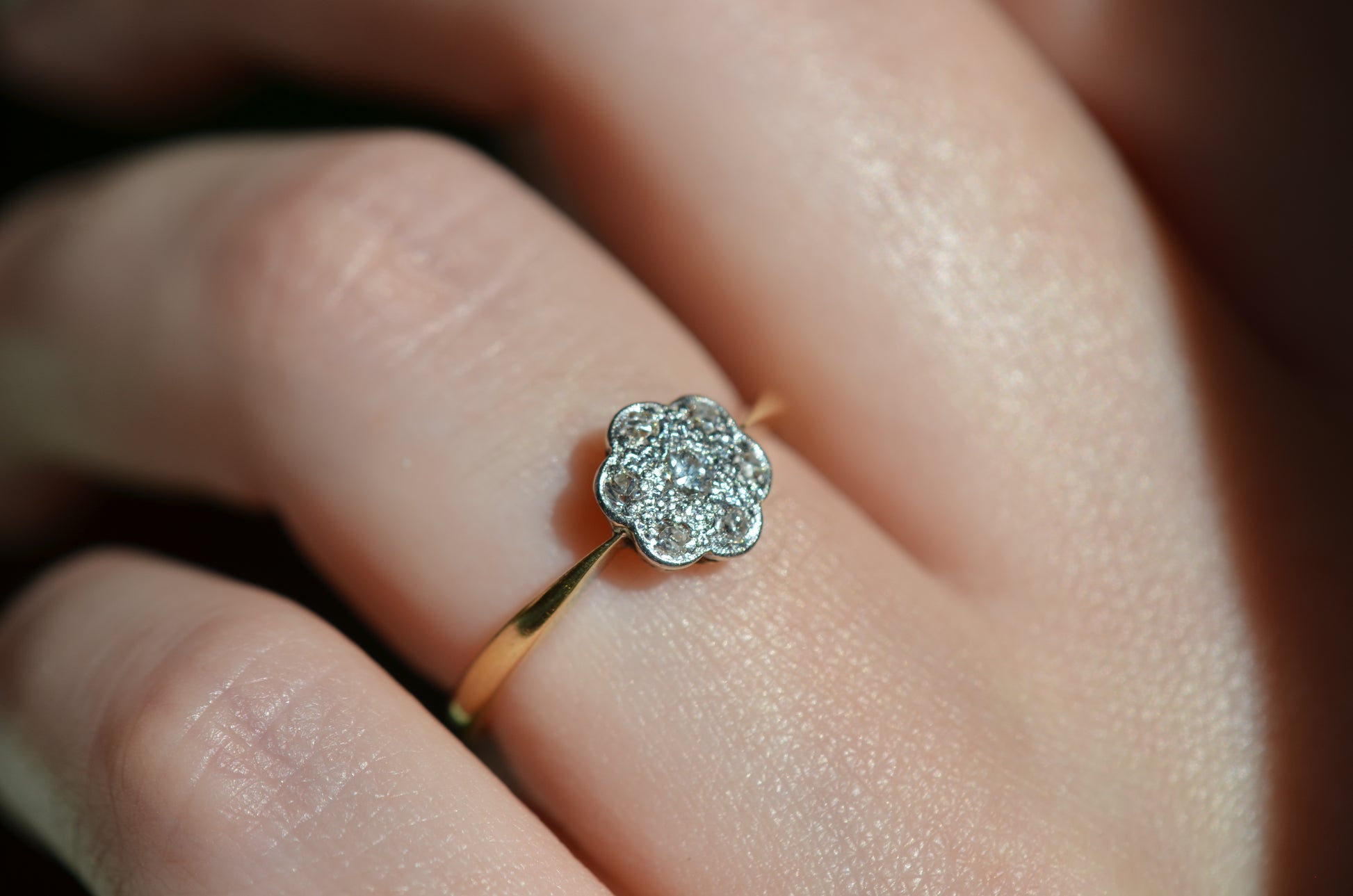Daisy cluster rings were popular in the Edwardian and Art Deco periods, and looking back to Victorians' love of symbolism, the daisy has long be representative of a simple, pure love and innocence. Consider as well Fitzgerald's glamorous and tragic heroine Daisy Buchanan, introduced to the world in 1925, and you'll see the continued popularity of the flower through the first half of the century. This particular ring appears to date a little later, likely to the 1930s.