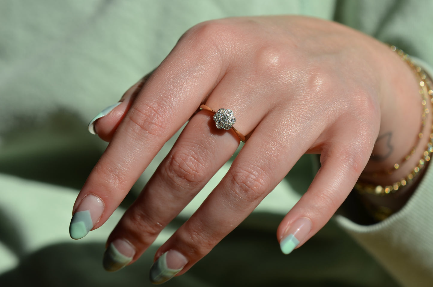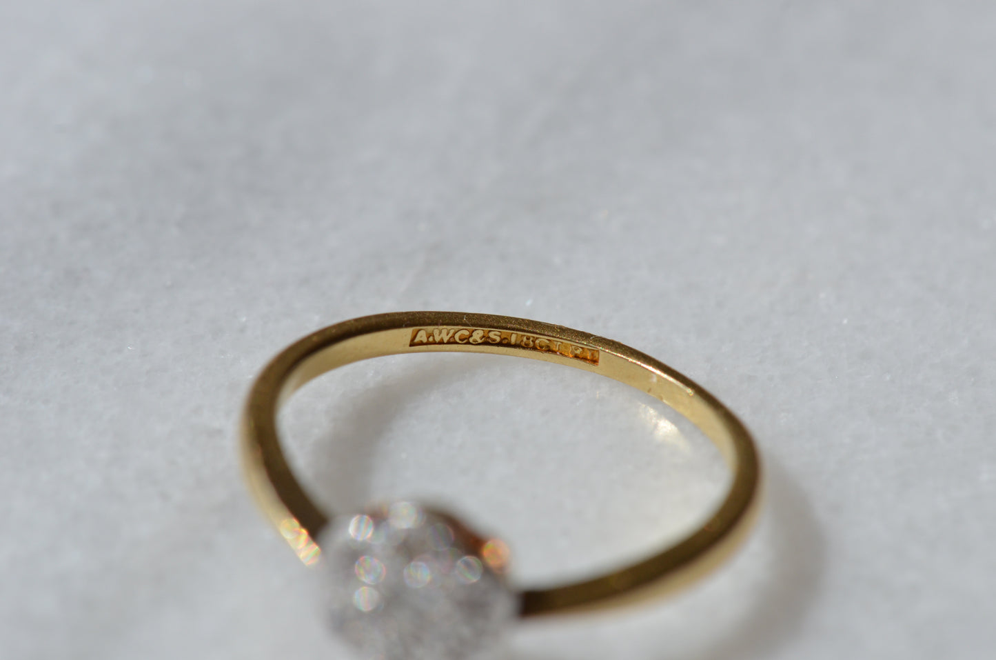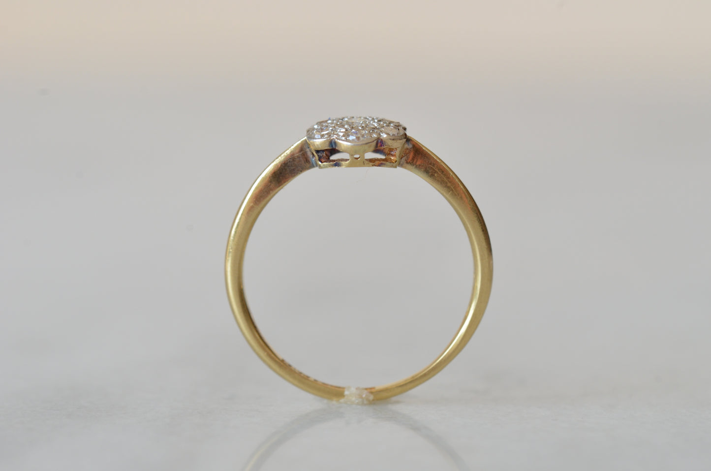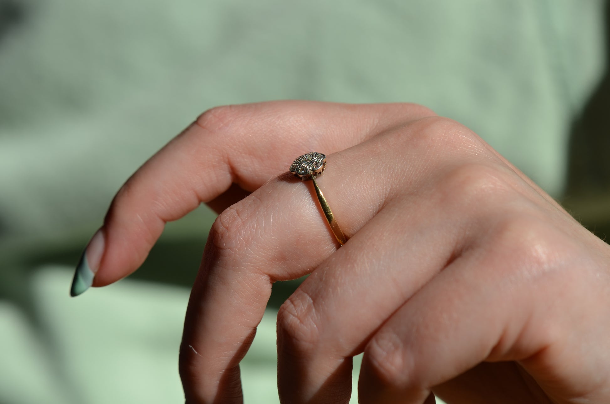 Daisy cluster rings were popular in the Edwardian and Art Deco periods, and looking back to Victorians' love of symbolism, the daisy has long be representative of a simple, pure love and innocence. Consider as well Fitzgerald's glamorous and tragic heroine Daisy Buchanan, introduced to the world in 1925, and you'll see the continued popularity of the flower through the first half of the century. This particular ring appears to date a little later, likely to the 1930s.