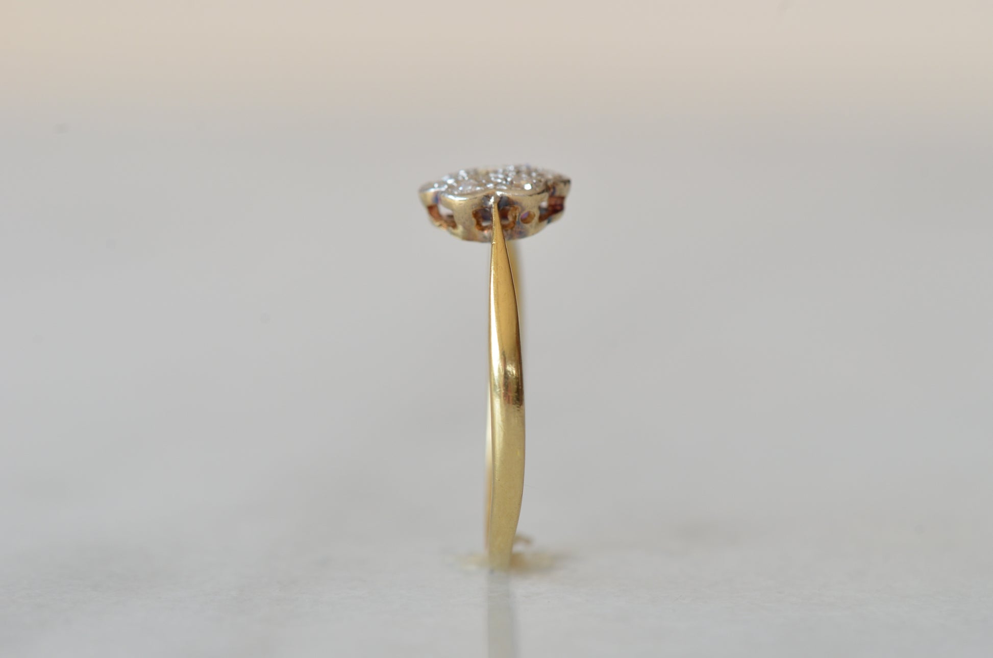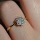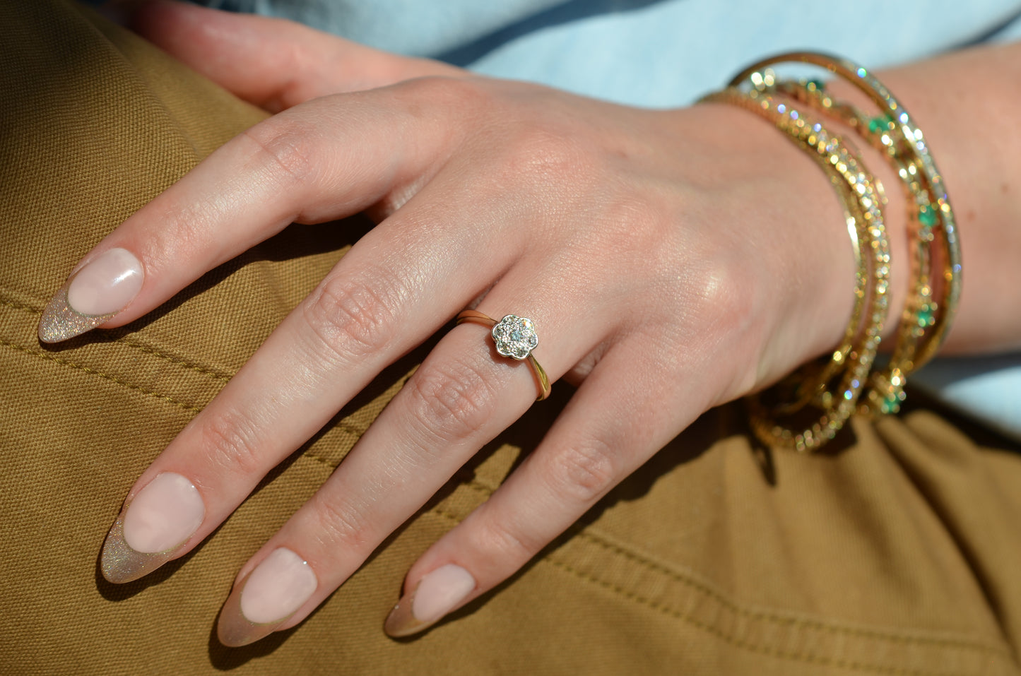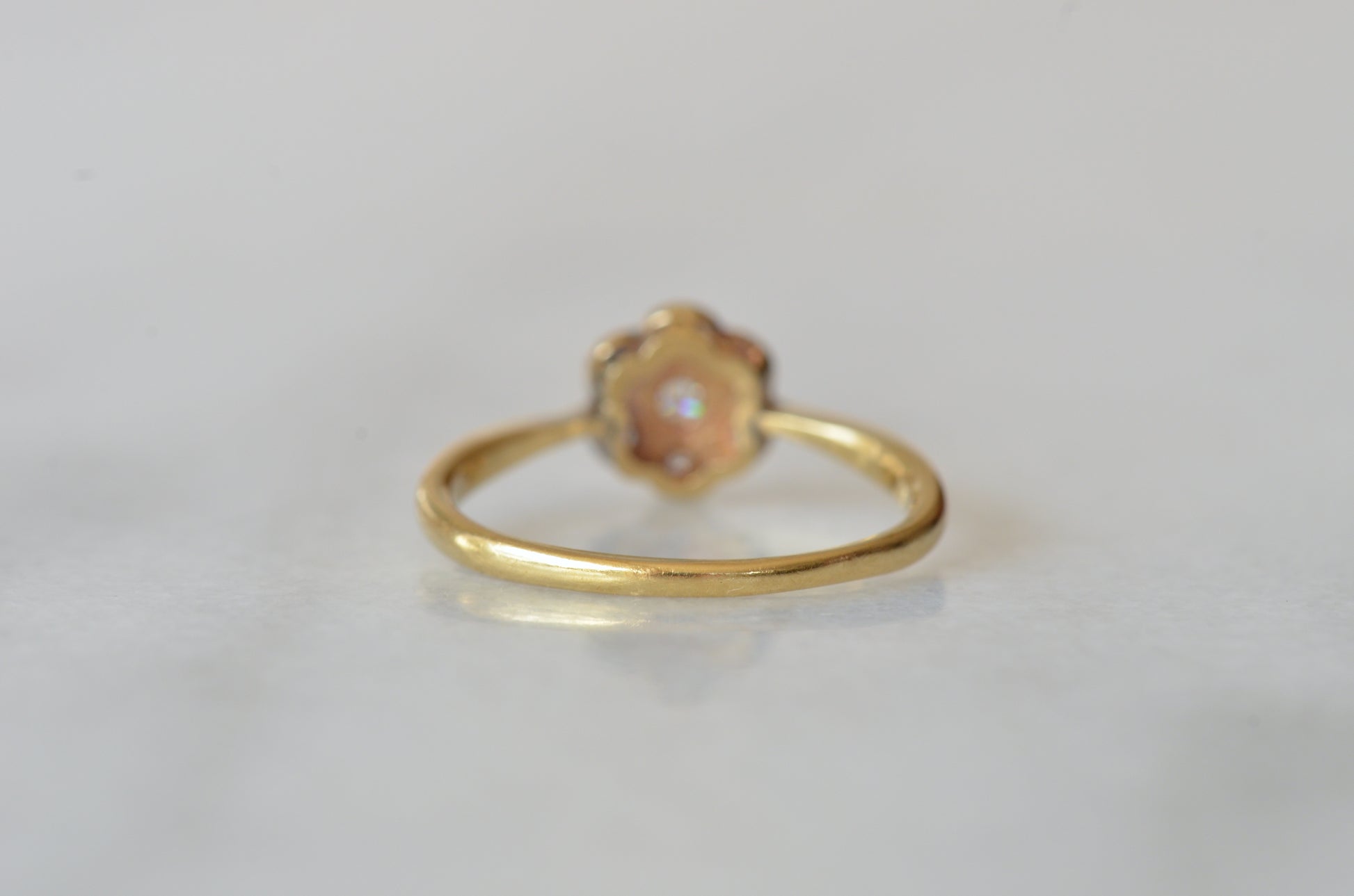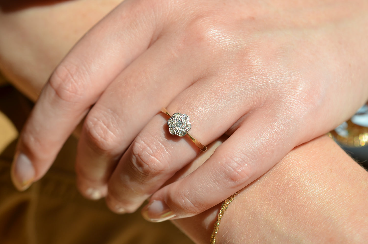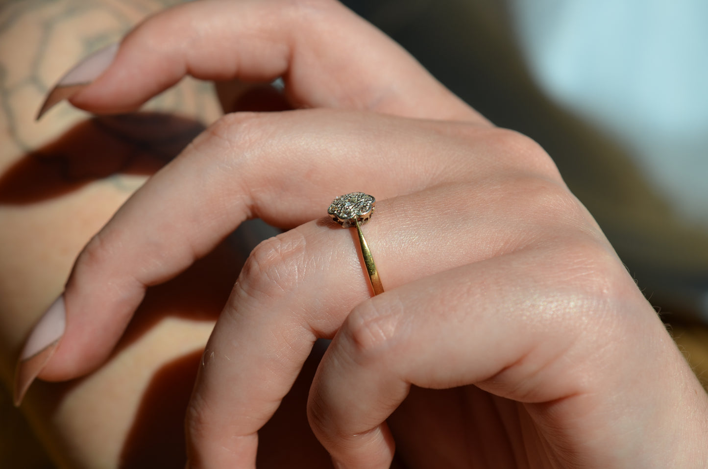 Daisy cluster rings were popular in the Edwardian and Art Deco periods, and looking back to Victorians' love of symbolism, the daisy has long be representative of a simple, pure love and innocence. Consider as well Fitzgerald's glamorous and tragic heroine Daisy Buchanan, introduced to the world in 1925, and you'll see the continued popularity of the flower through the first half of the century. This particular ring appears to date a little later, likely to the 1930s.