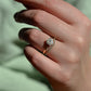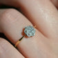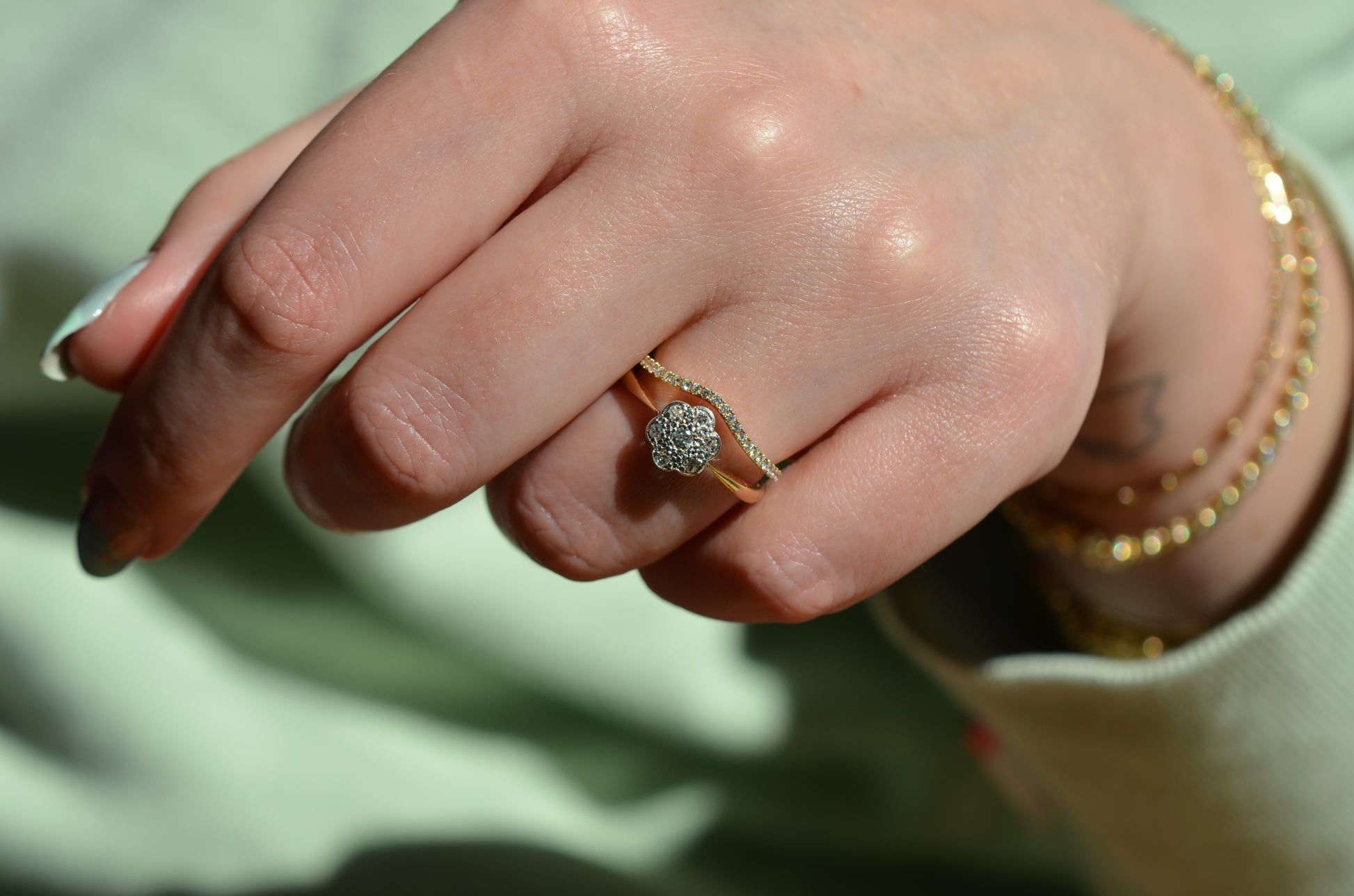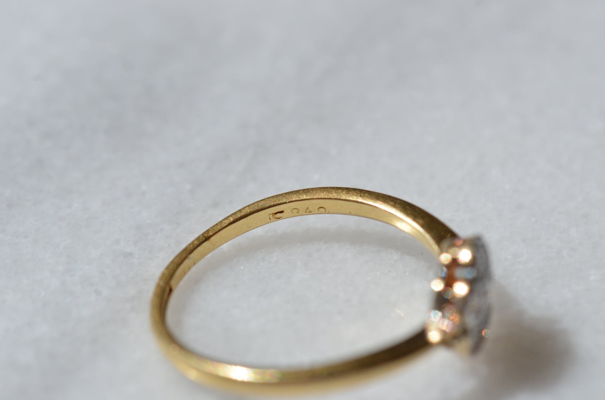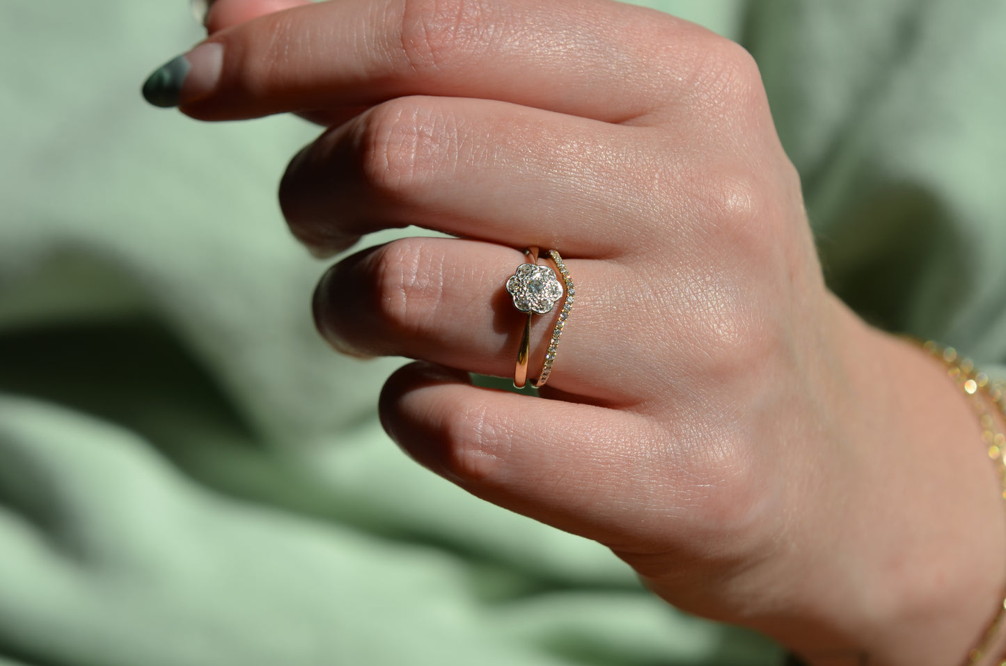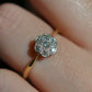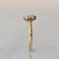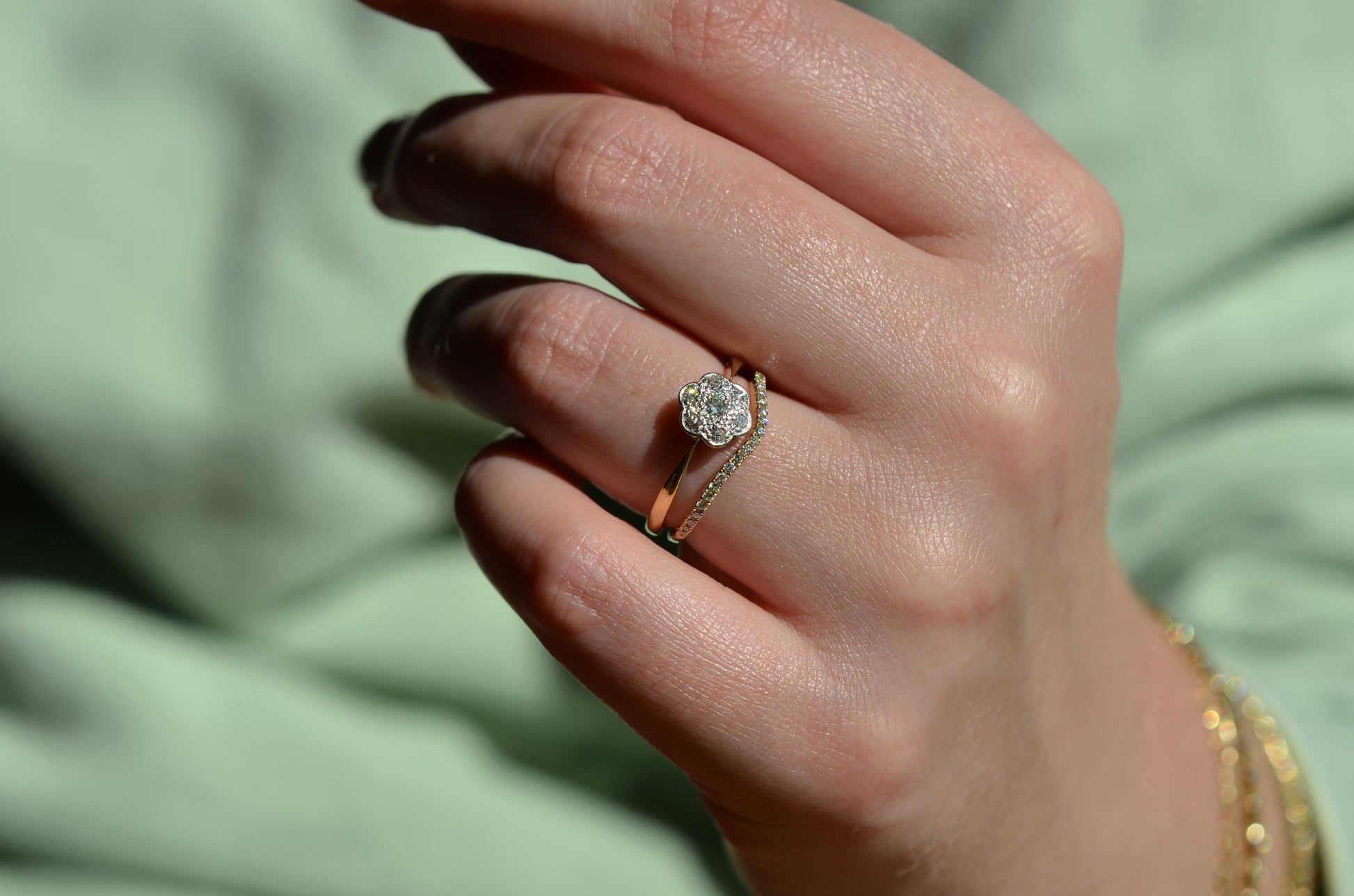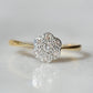 Daisy cluster rings were popular in the Edwardian and Art Deco periods, and looking back to Victorians' love of symbolism, the daisy has long be representative of a simple, pure love and innocence. Consider as well Fitzgerald's glamorous and tragic heroine Daisy Buchanan, introduced to the world in 1925, and you'll see the continued popularity of the flower through the first half of the century. This particular ring appears to date a little later, likely to the 1930s.