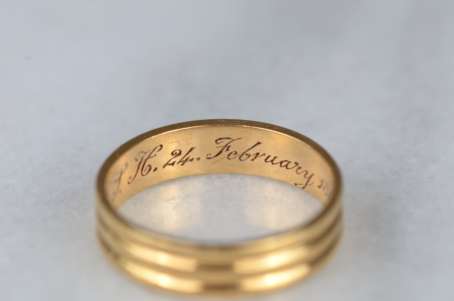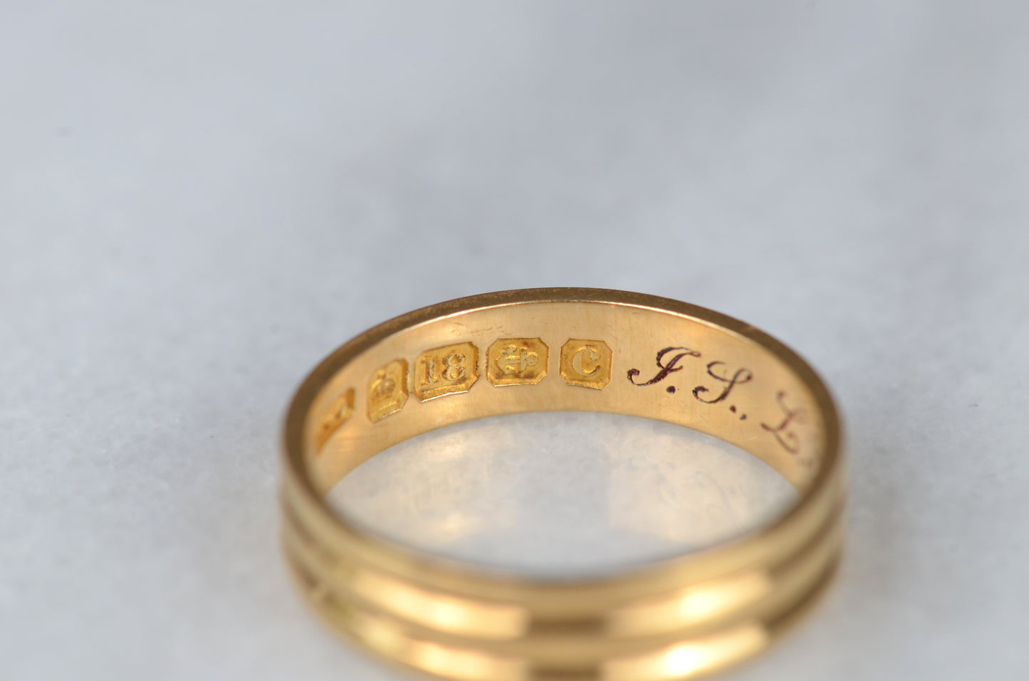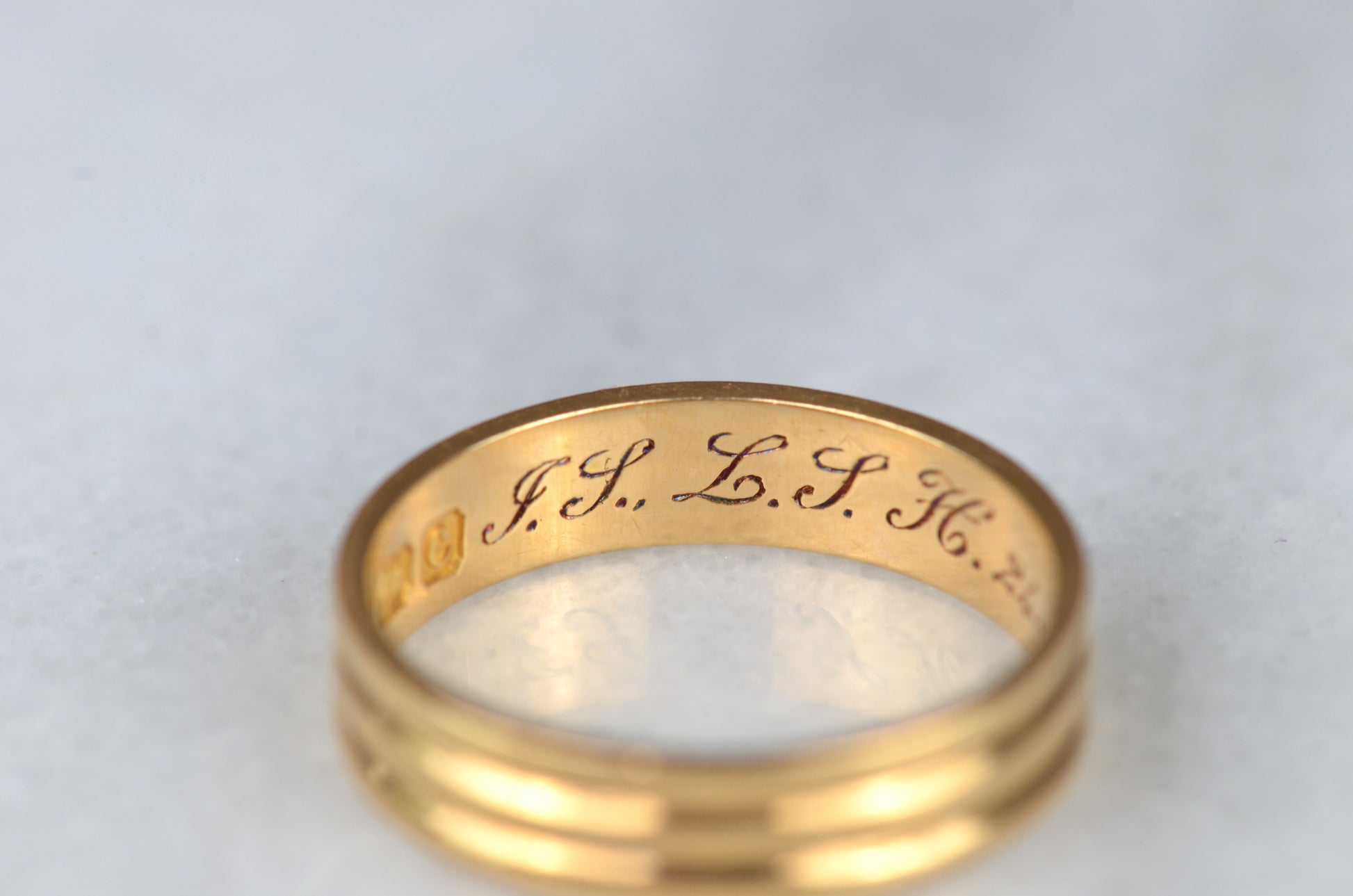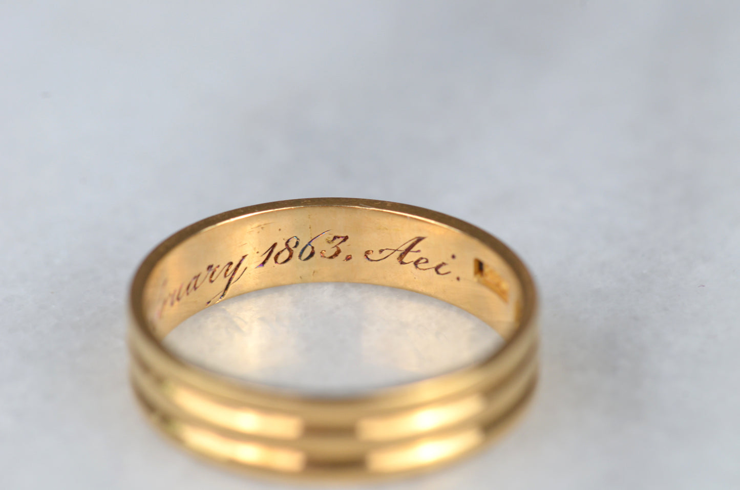• Inside of ring hand engraved I.S., L.S.H. 24 February 1863. Aei.