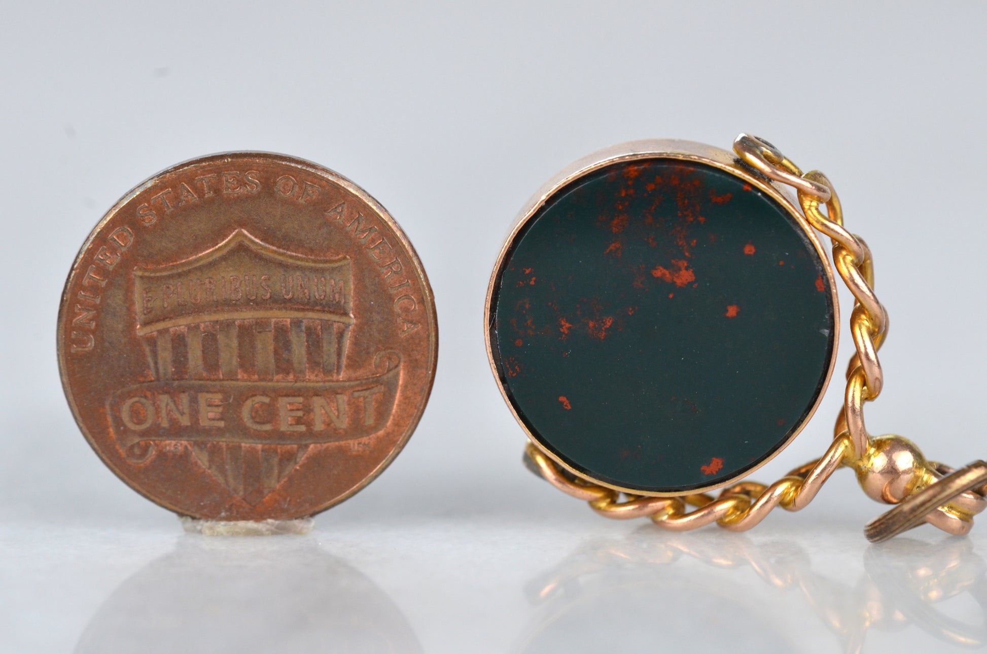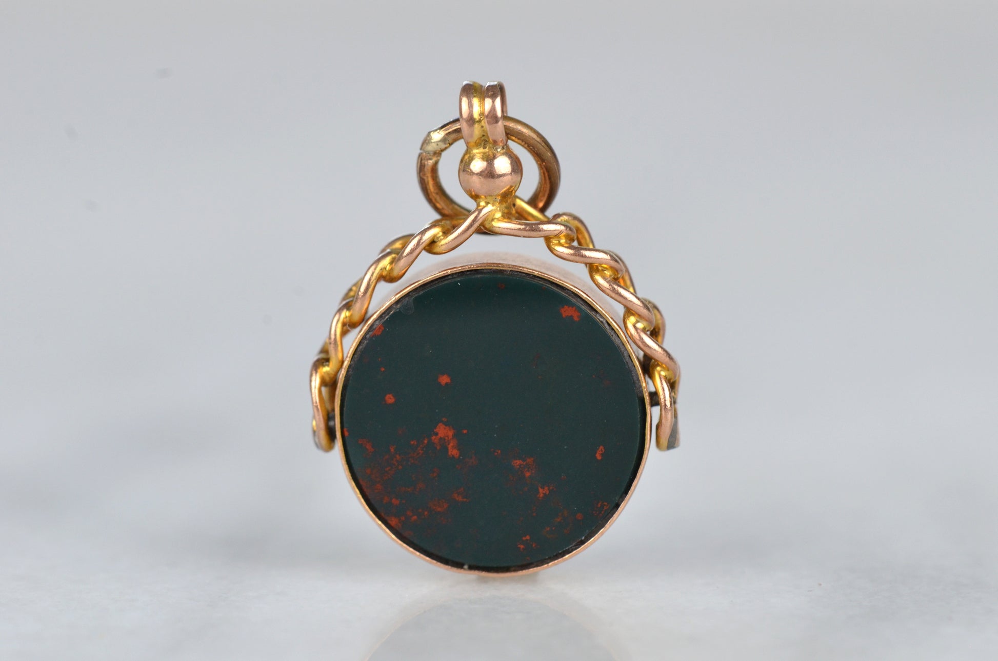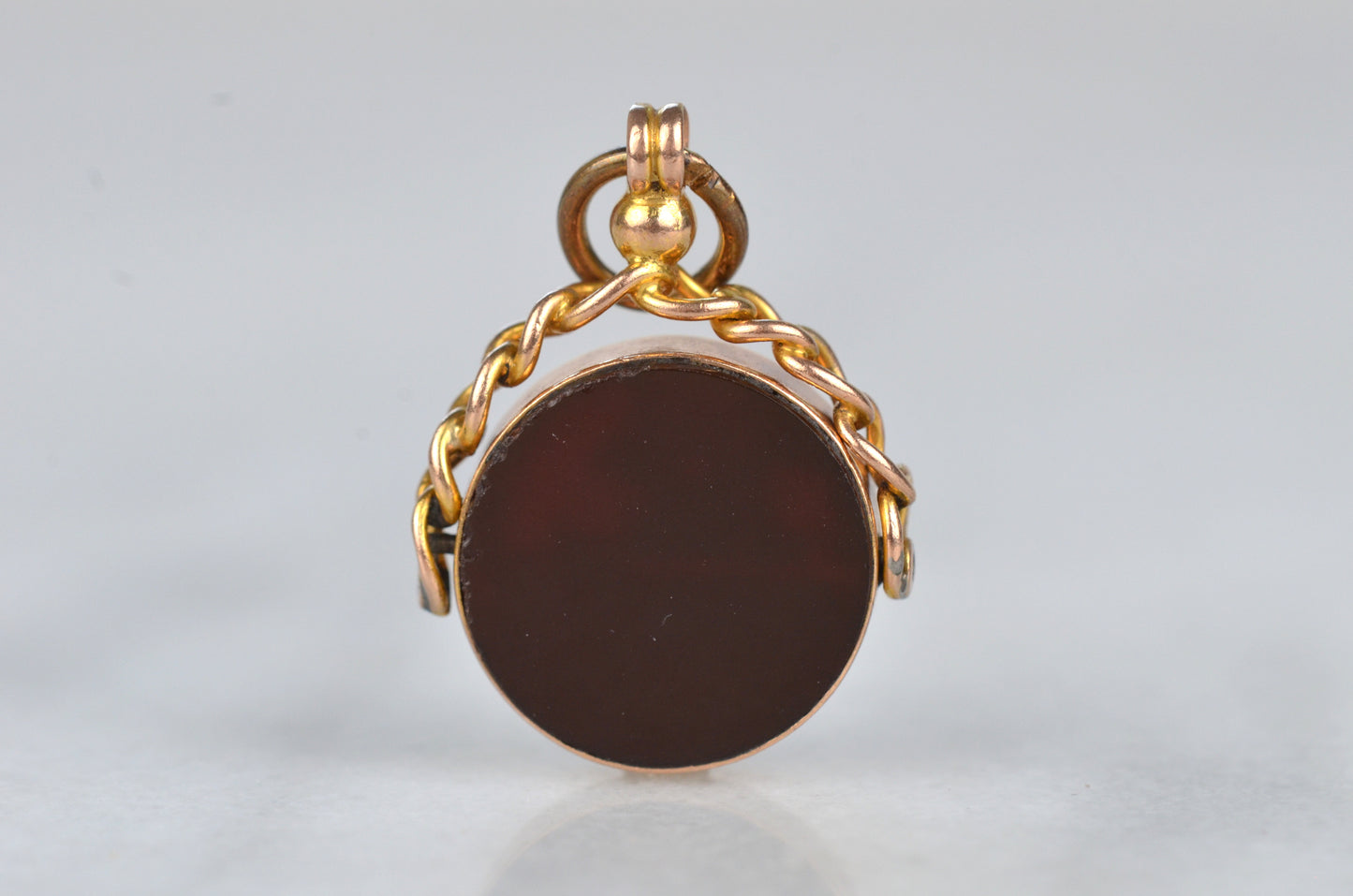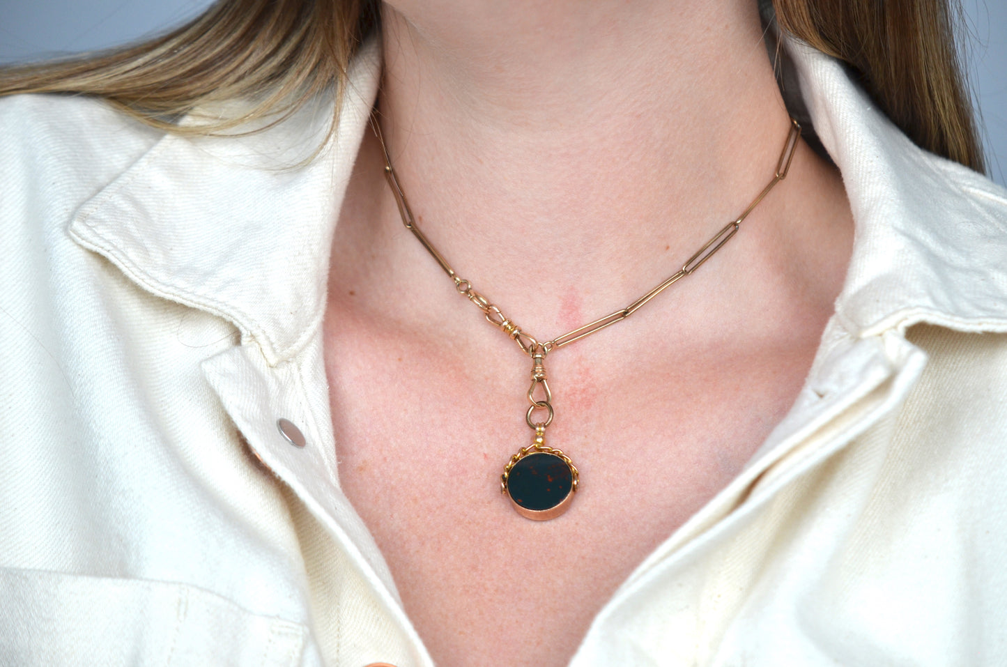 A warm and richly rendered spinner fob, featuring a charming chain detail and perfectly autumnal bloodstone and carnelian on opposing sides of the thick disc. Popular accessories in the Victorian and Edwardian eras, these fobs served the dual function of practicality and fashion. Worn on a long chain, a watch chain, or a chatelaine, the fobs could be used with sealing wax to close a letter but also served a decorative function, as evidenced by the many variations and stylistic flourishes across the medium. We love them as a bold pendant (especially on a heavy antique chain).