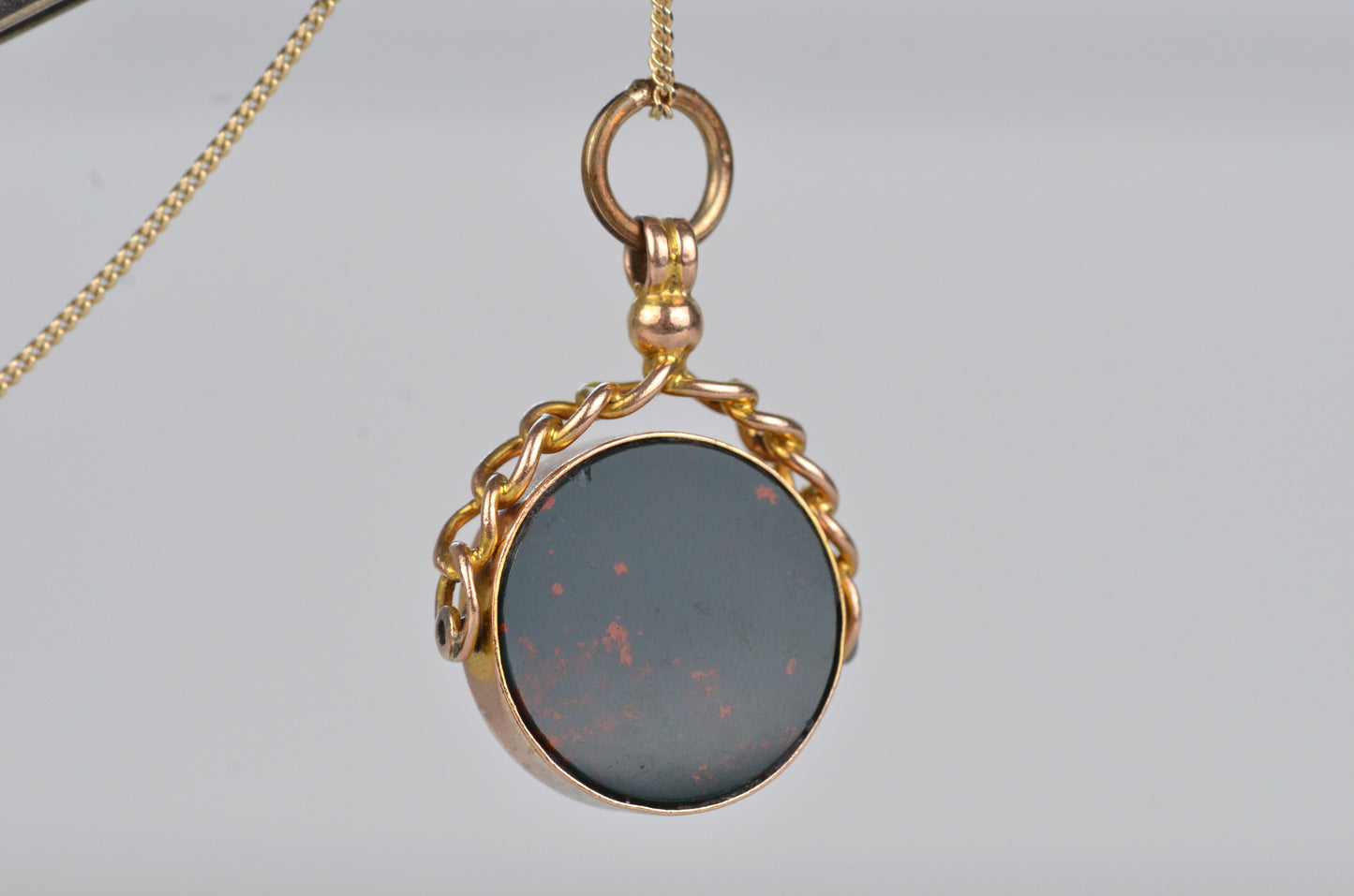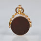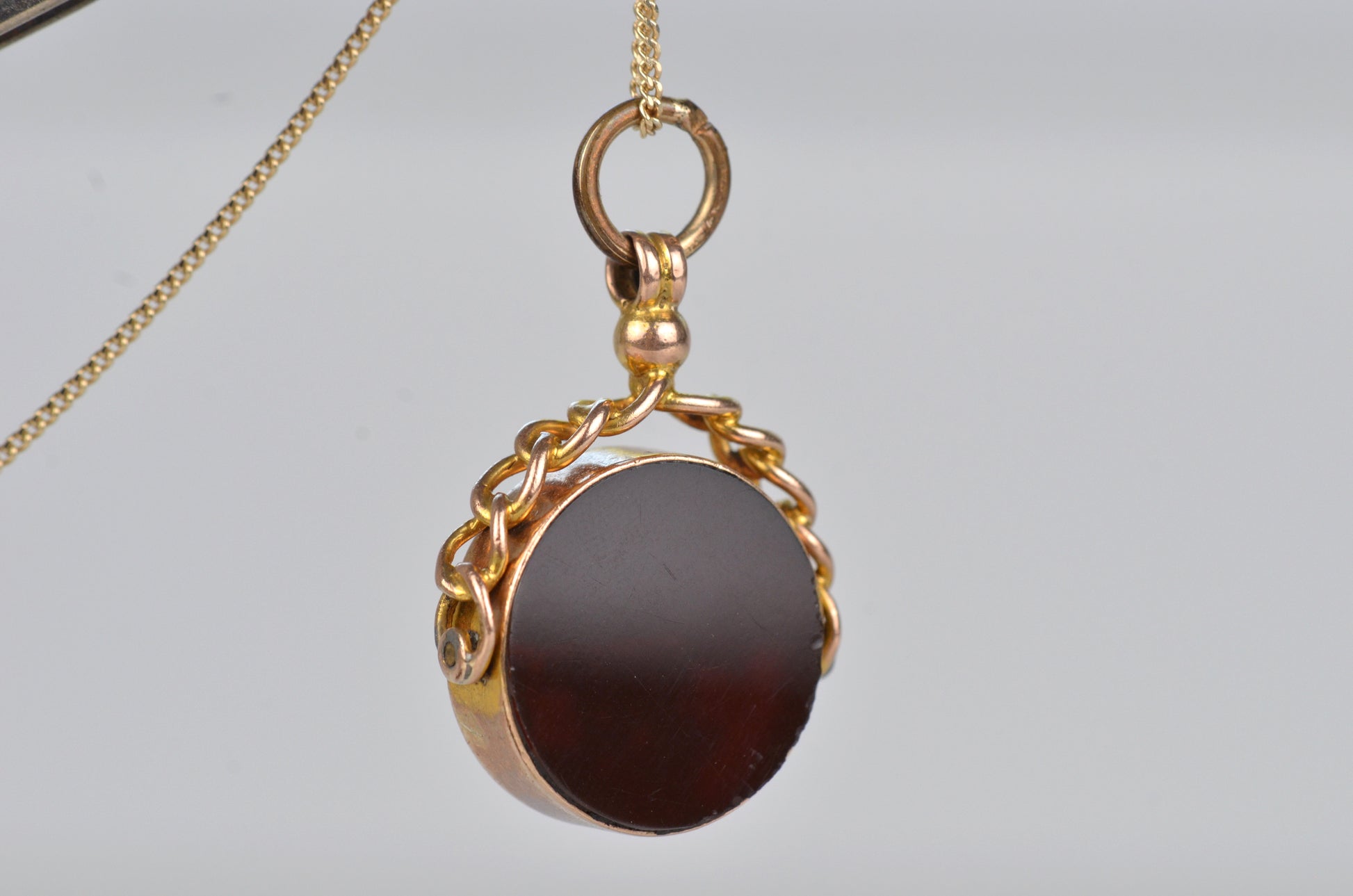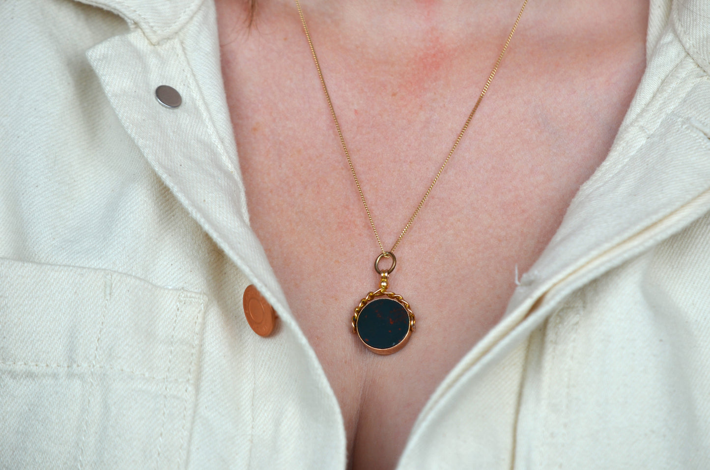 A warm and richly rendered spinner fob, featuring a charming chain detail and perfectly autumnal bloodstone and carnelian on opposing sides of the thick disc. Popular accessories in the Victorian and Edwardian eras, these fobs served the dual function of practicality and fashion. Worn on a long chain, a watch chain, or a chatelaine, the fobs could be used with sealing wax to close a letter but also served a decorative function, as evidenced by the many variations and stylistic flourishes across the medium. We love them as a bold pendant (especially on a heavy antique chain).