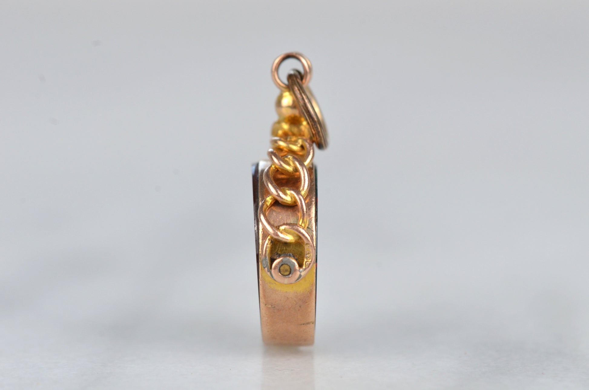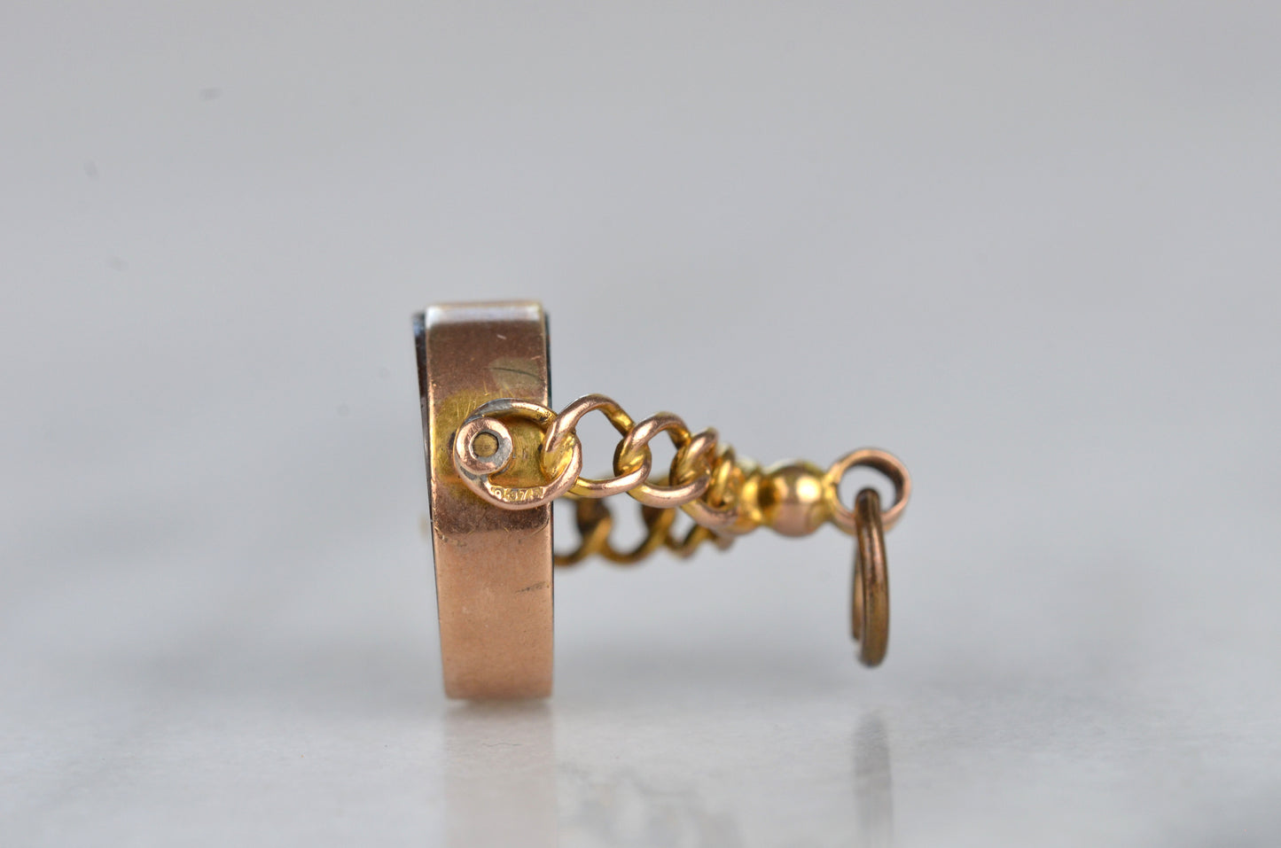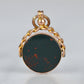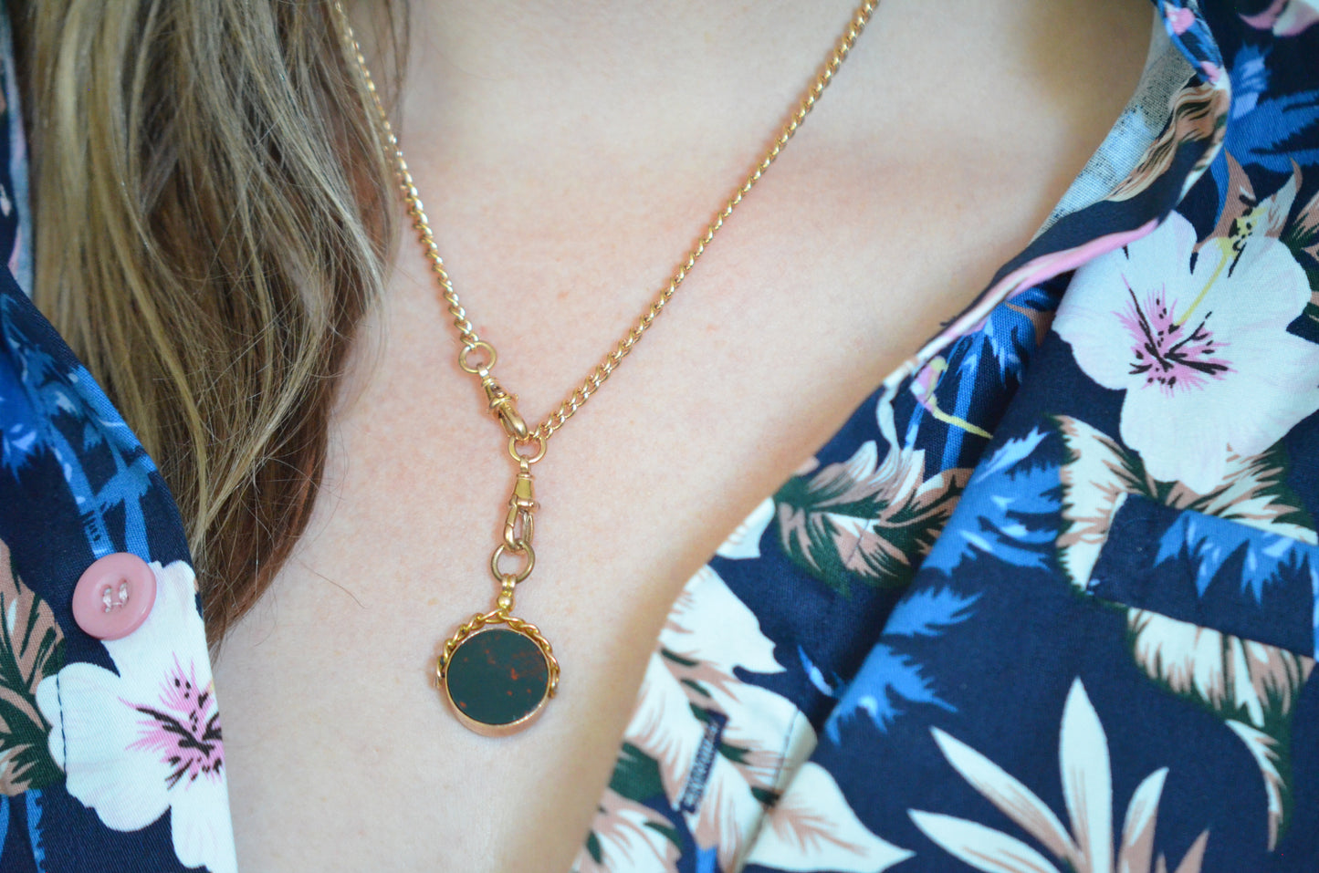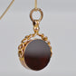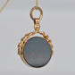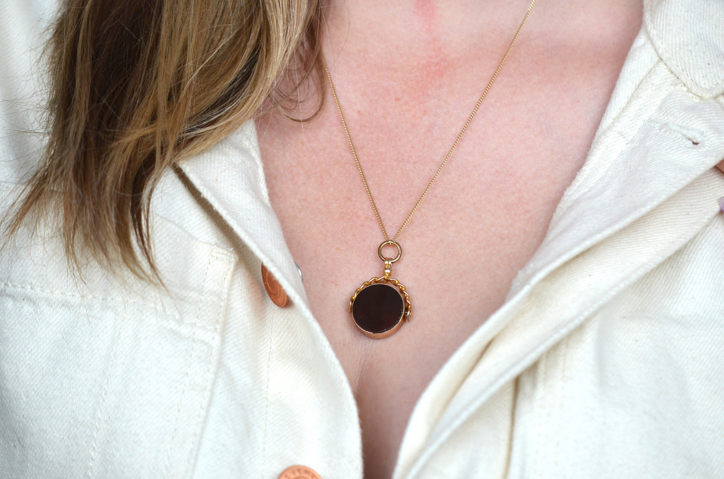 A warm and richly rendered spinner fob, featuring a charming chain detail and perfectly autumnal bloodstone and carnelian on opposing sides of the thick disc. Popular accessories in the Victorian and Edwardian eras, these fobs served the dual function of practicality and fashion. Worn on a long chain, a watch chain, or a chatelaine, the fobs could be used with sealing wax to close a letter but also served a decorative function, as evidenced by the many variations and stylistic flourishes across the medium. We love them as a bold pendant (especially on a heavy antique chain).
