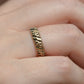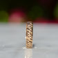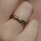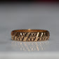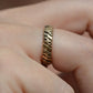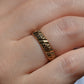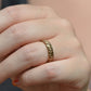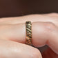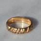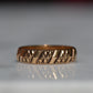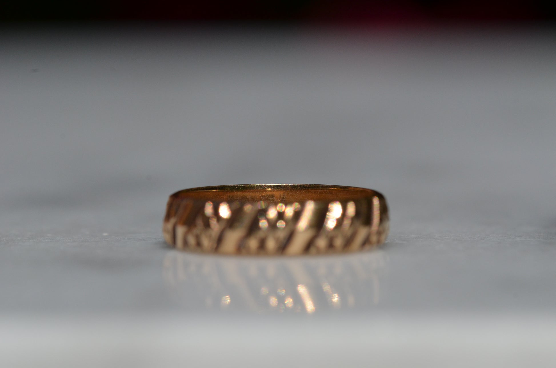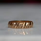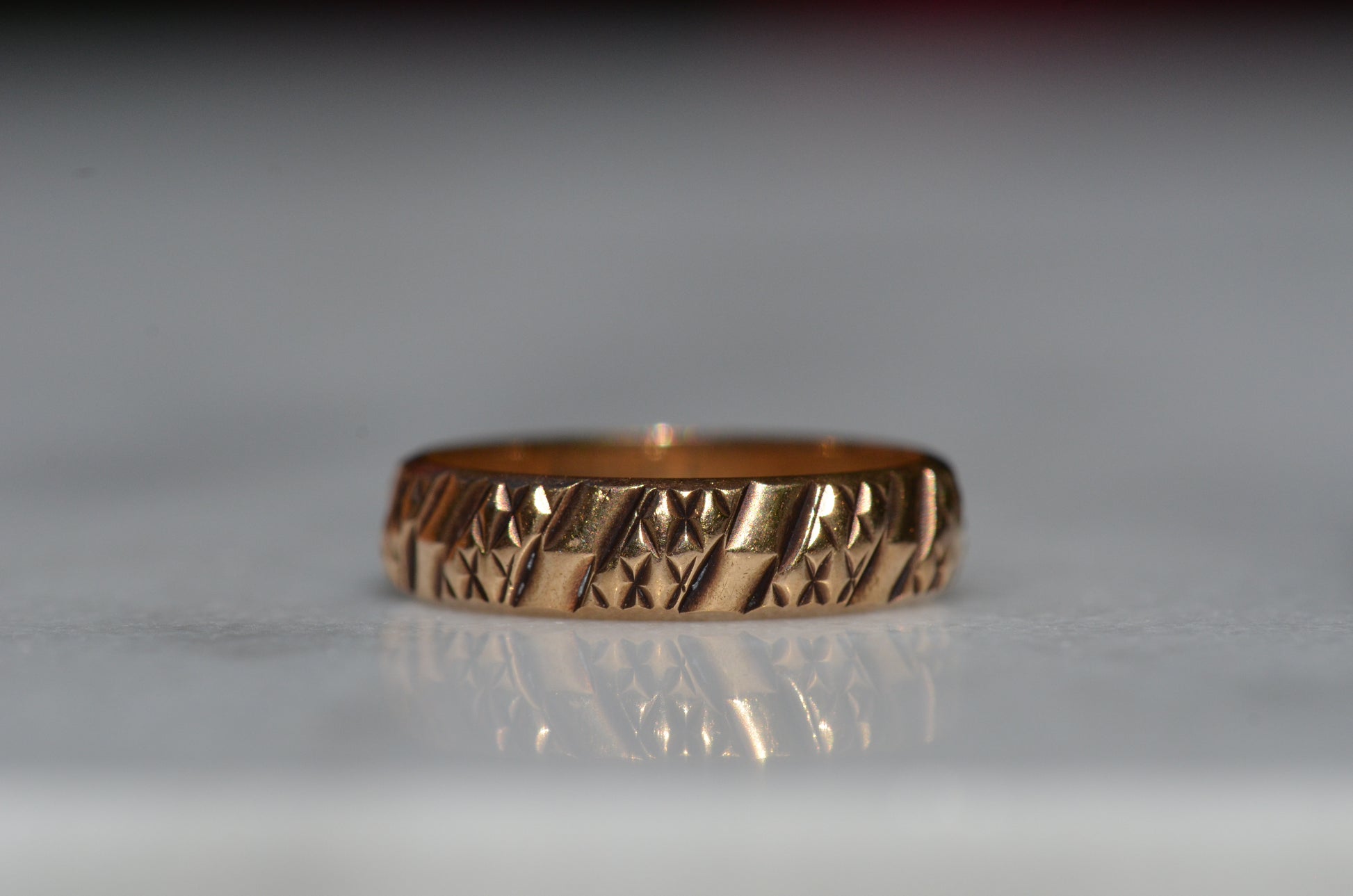 A bold and beautiful band, crafted in warm 9k gold that's developed a fine patina with age - the real star of the show is the deftly chased pattern applied all over the ring, creating a cascade of stars and rays that catch and reflect the light. The width and intricate pattern create a statement, while the simplicity of materials means you never have to fuss with this ring.