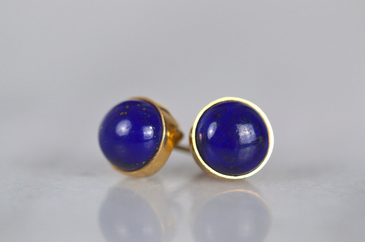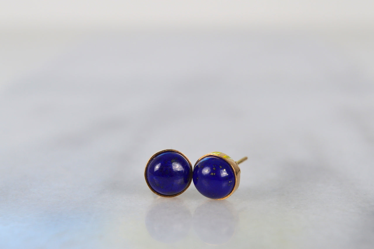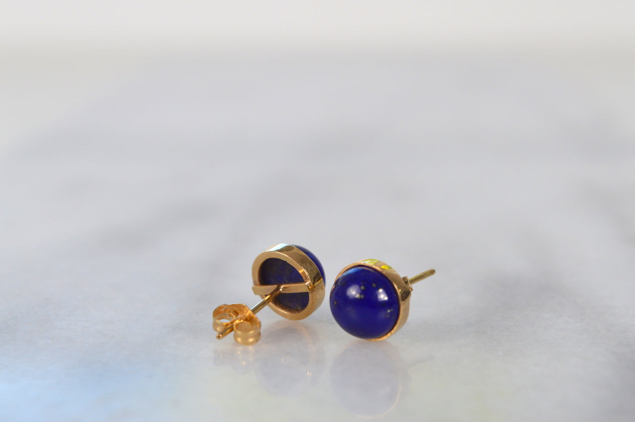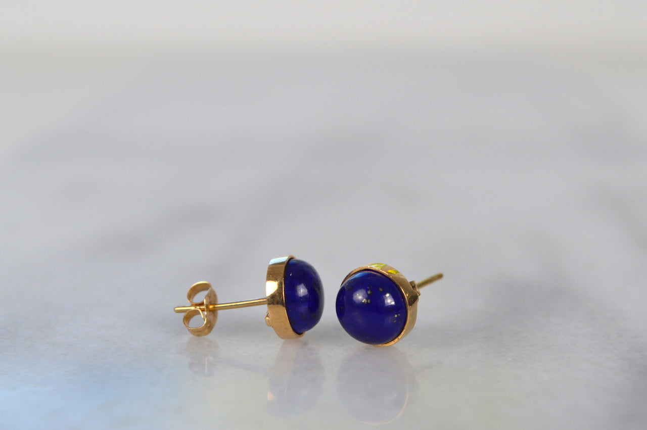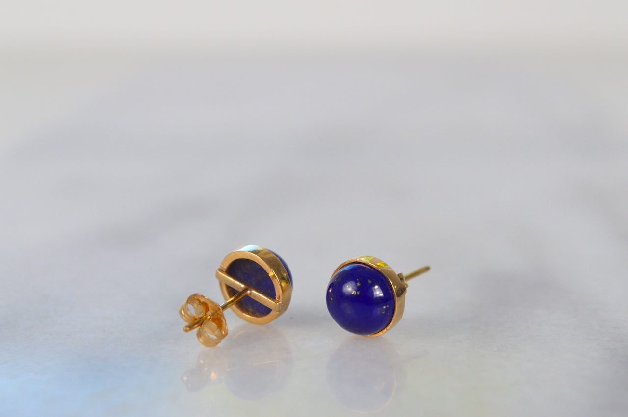 Deep ultramarine blue flecked with golden pyrite are perfectly enhanced by a warm gold bezel in these dreamy button-like studs. We love the rich hues as stand-alone earrings or as part of a glamorous yet easygoing ear stack.