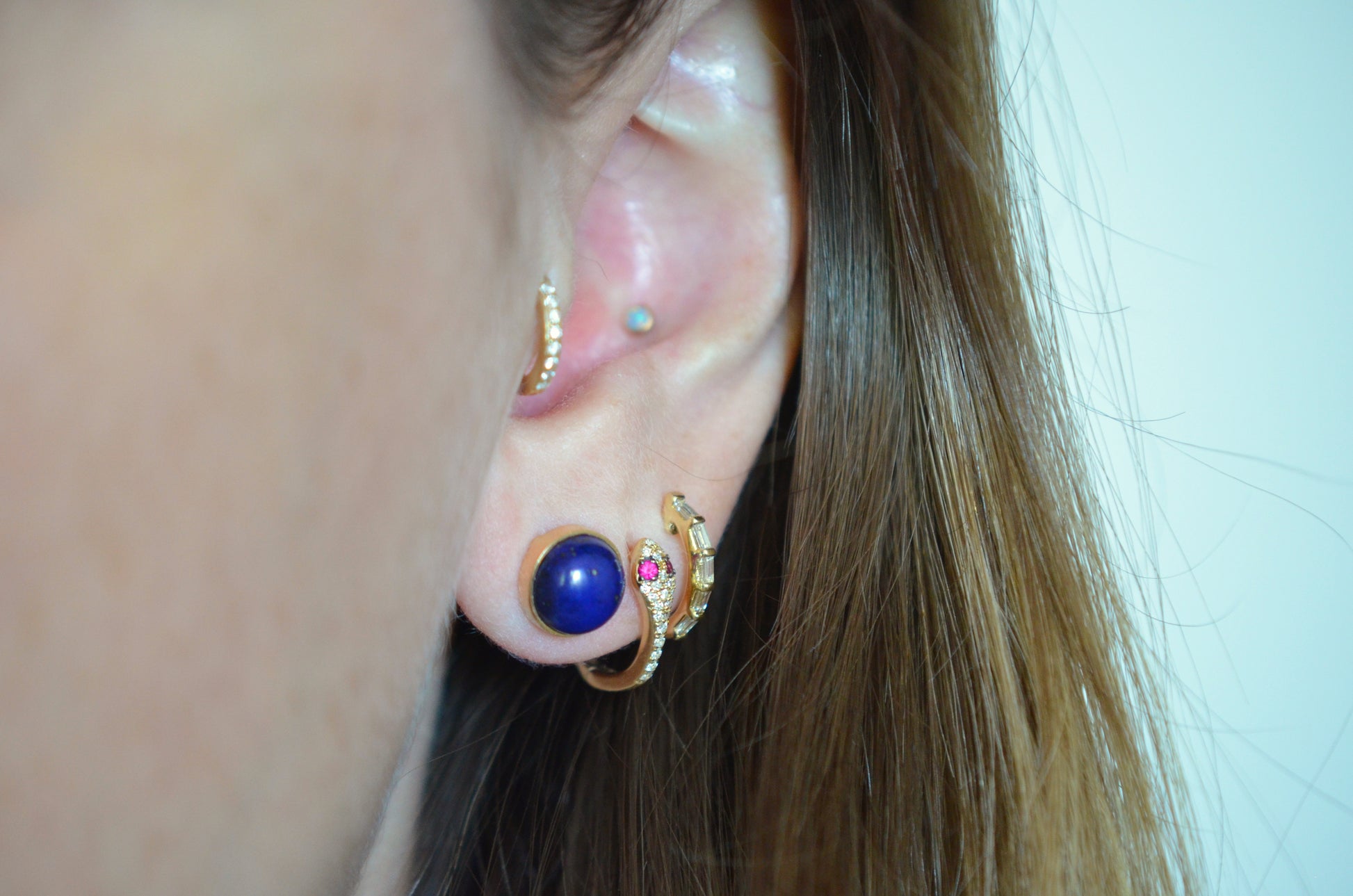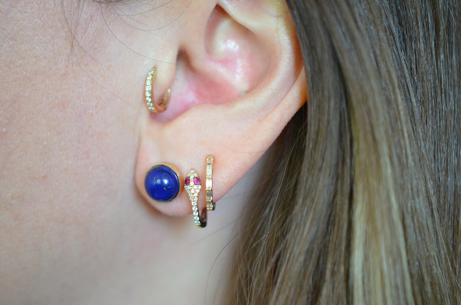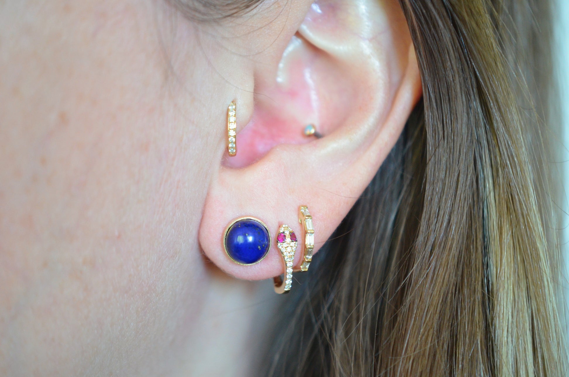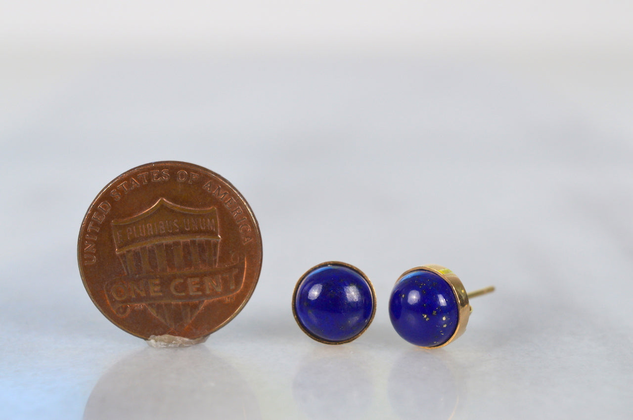 Deep ultramarine blue flecked with golden pyrite are perfectly enhanced by a warm gold bezel in these dreamy button-like studs. We love the rich hues as stand-alone earrings or as part of a glamorous yet easygoing ear stack.