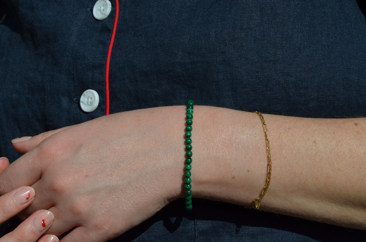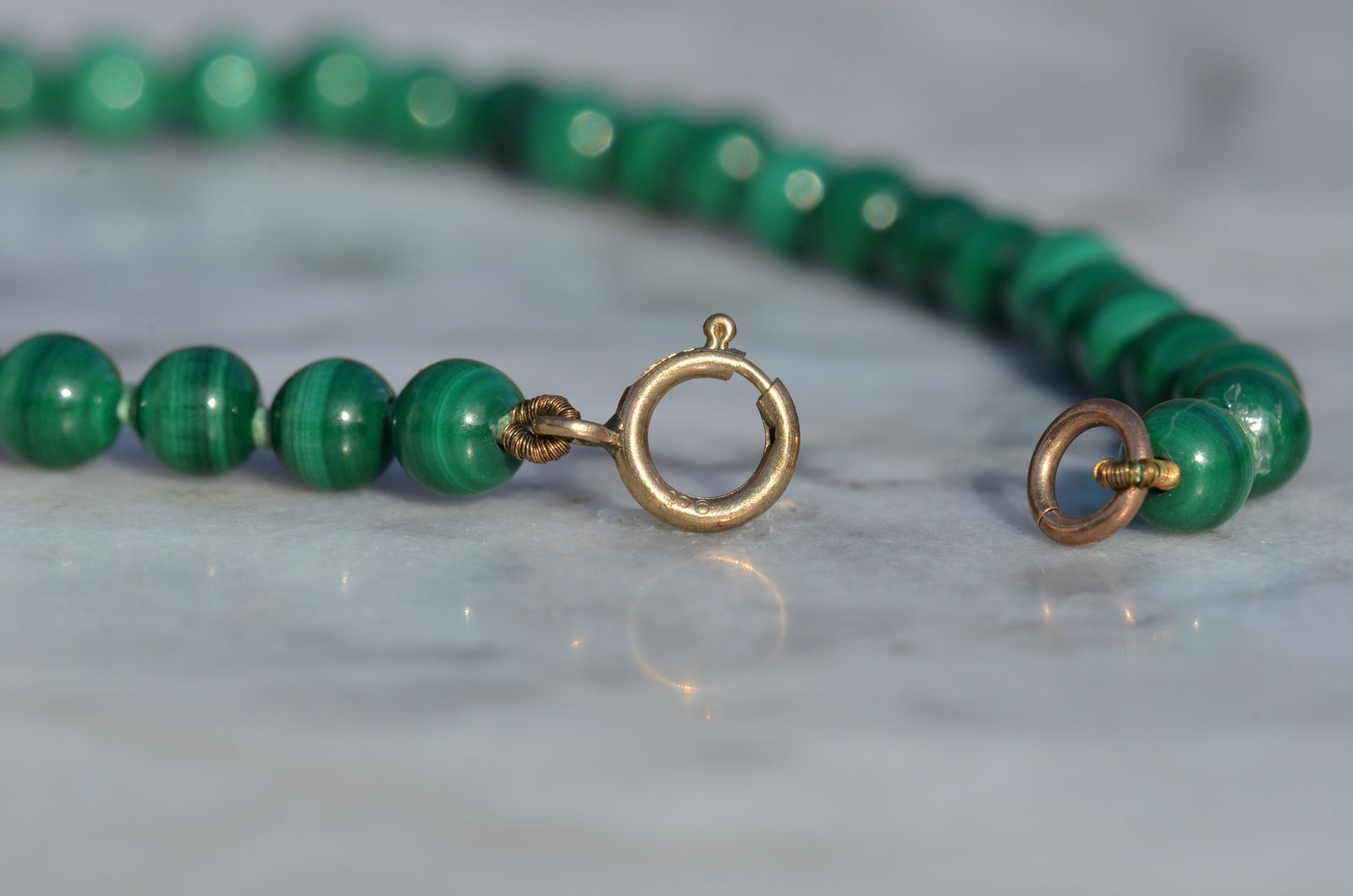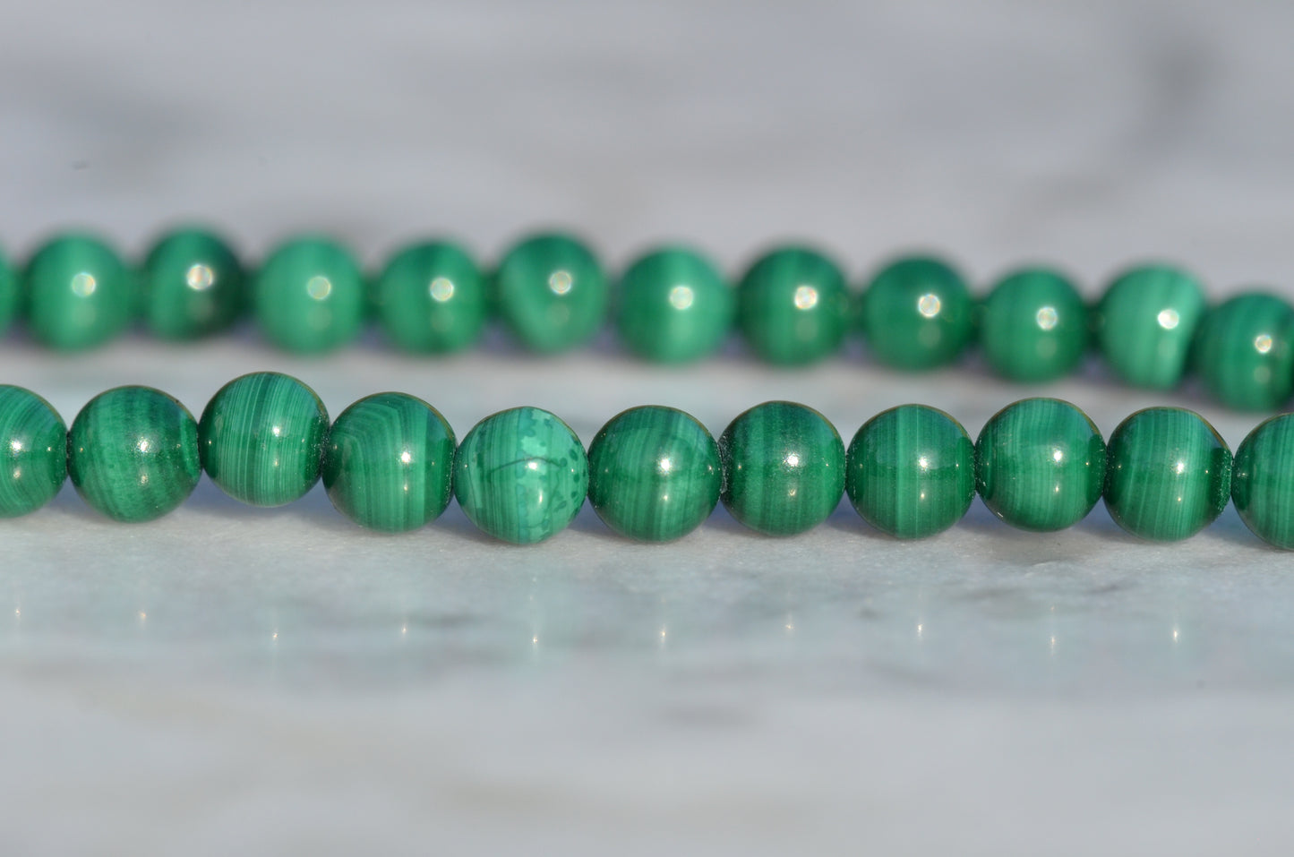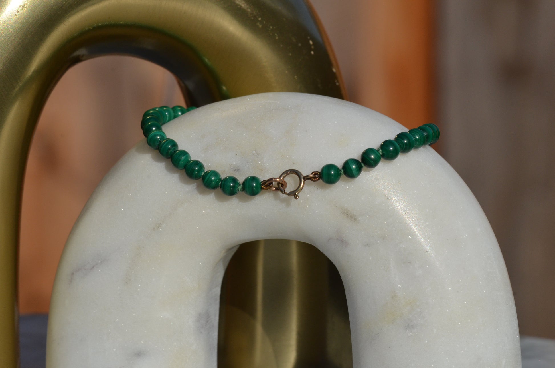 There is something so dreamy about the specific, defined banding of malachite - at once earthy and otherworldly, with an oh-so-subtle sheen. Round beads perfectly play up the concentric rings of variated green hues, a feature of the mineral's growth habit - as the rough gemstone forms it takes what's called a botryoidal shape, with attached spheres reminiscent of a bunch of grapes.