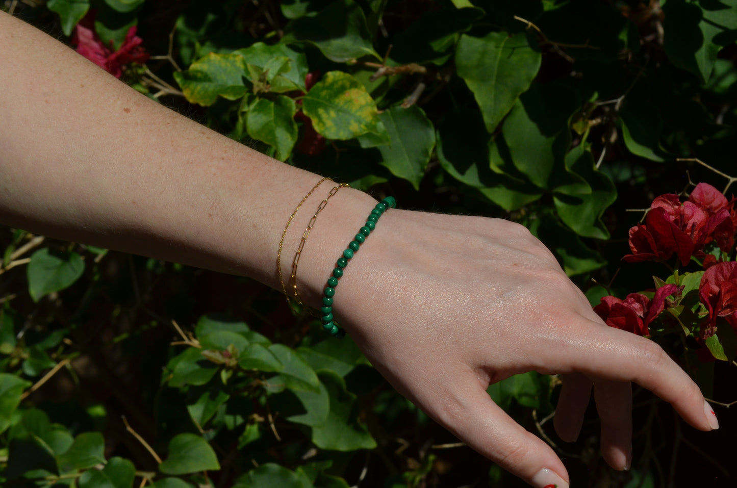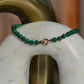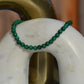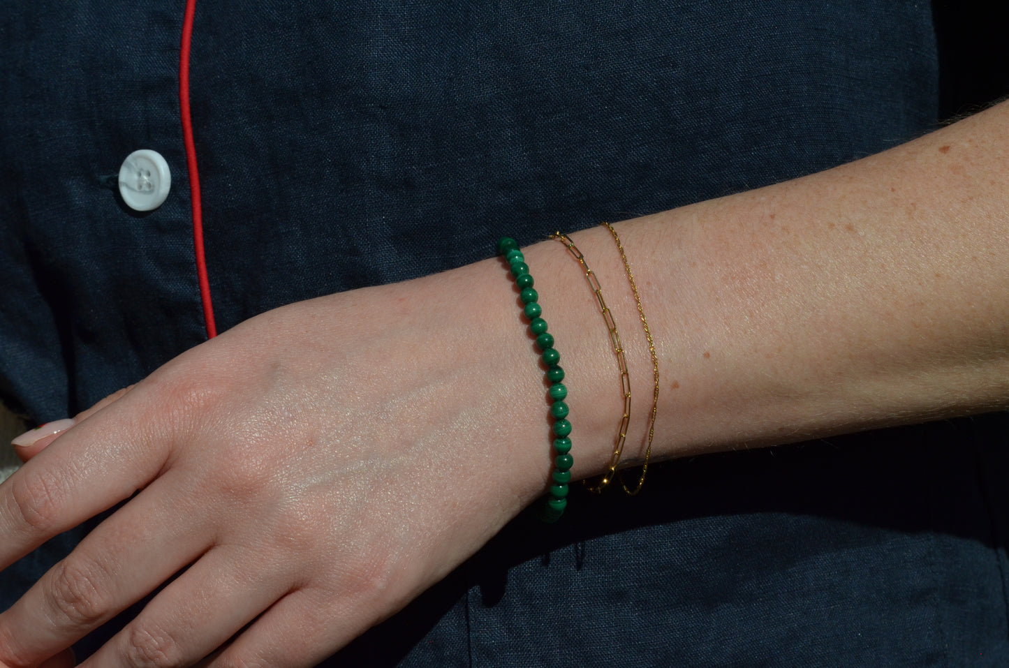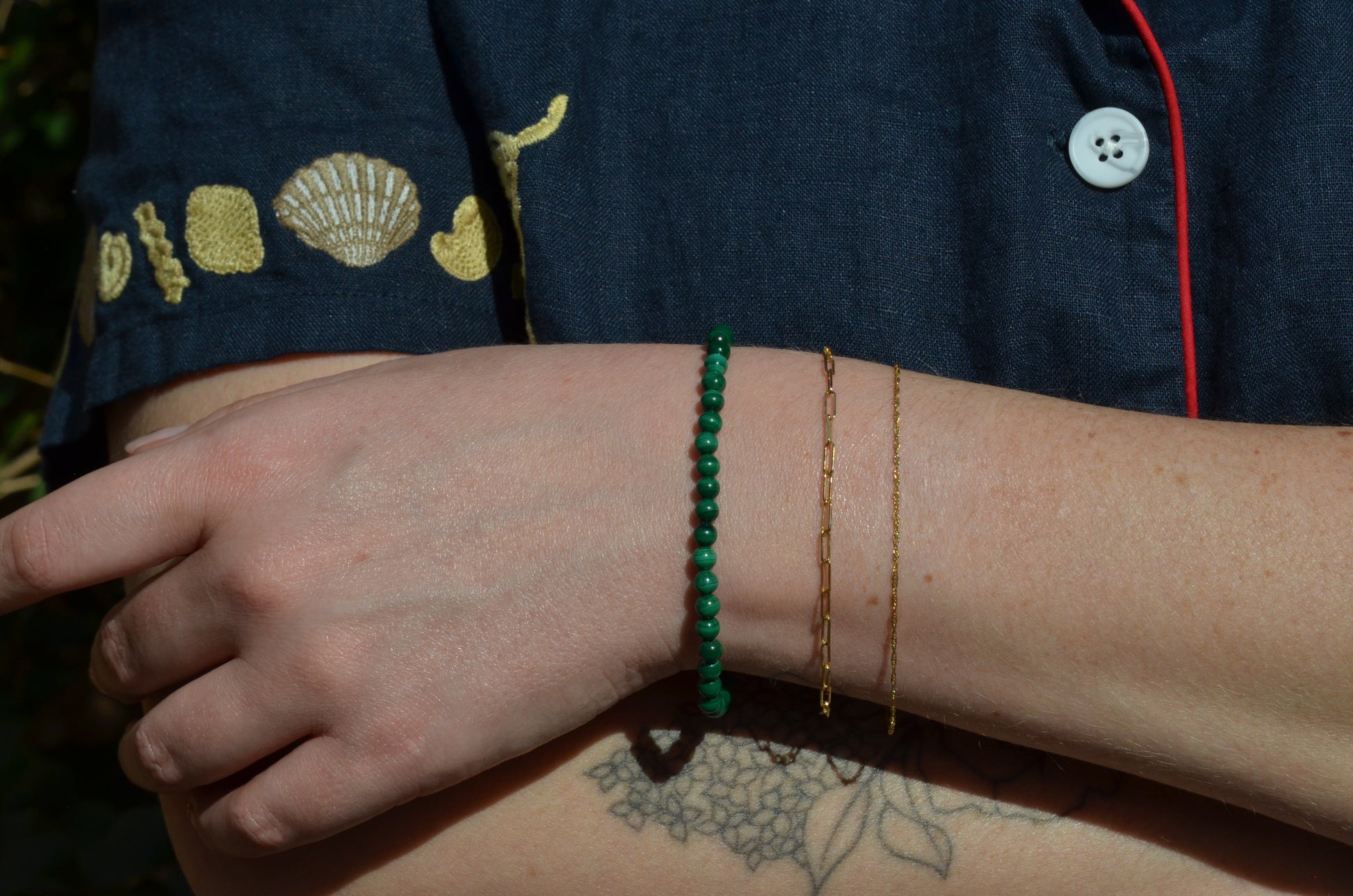 There is something so dreamy about the specific, defined banding of malachite - at once earthy and otherworldly, with an oh-so-subtle sheen. Round beads perfectly play up the concentric rings of variated green hues, a feature of the mineral's growth habit - as the rough gemstone forms it takes what's called a botryoidal shape, with attached spheres reminiscent of a bunch of grapes.