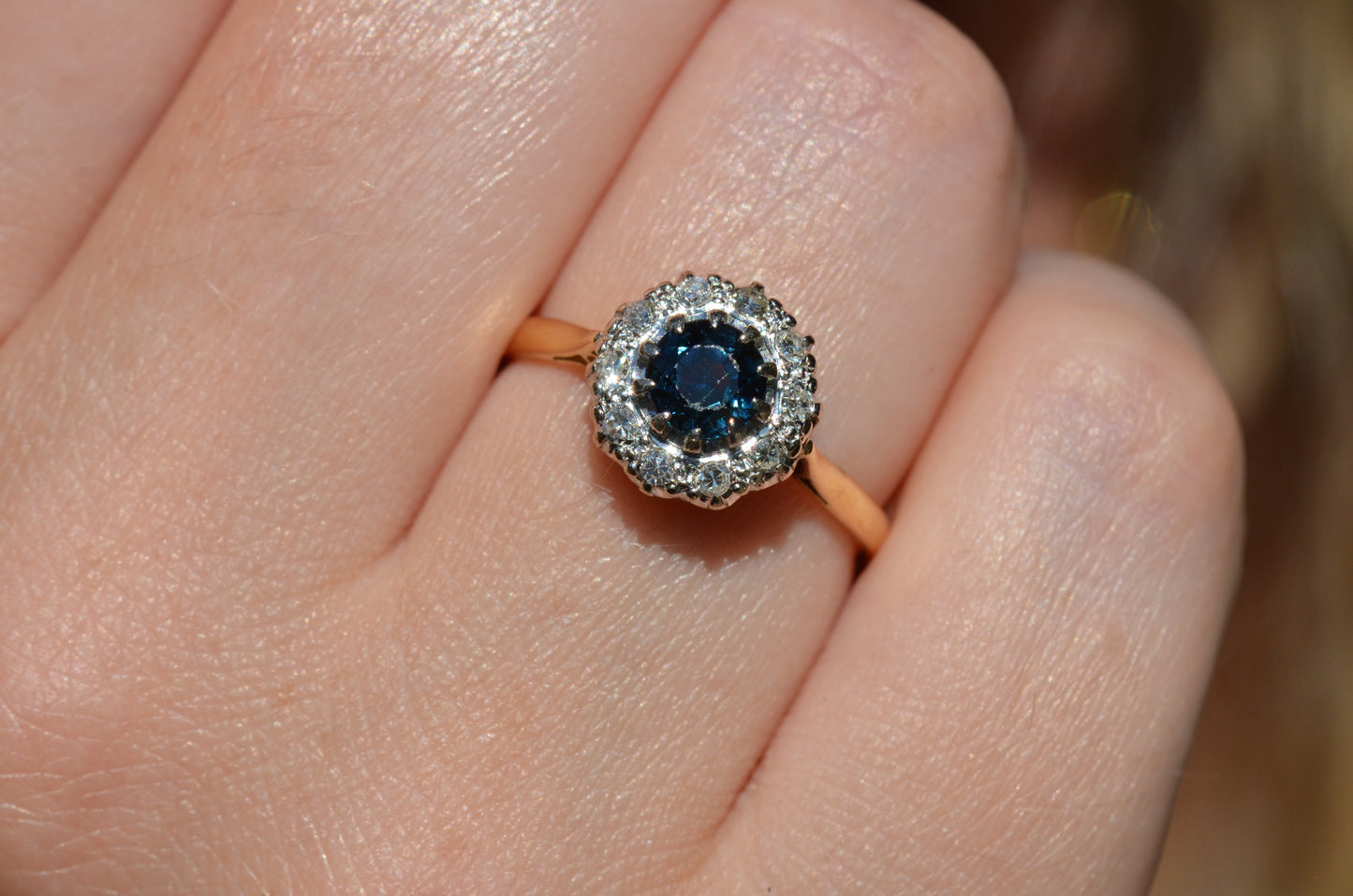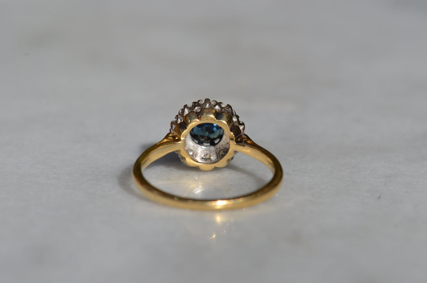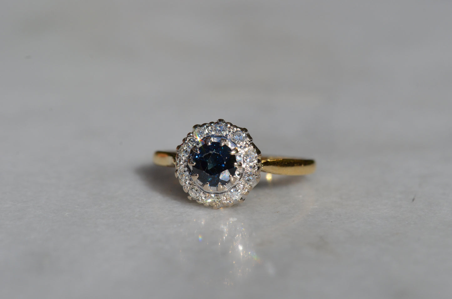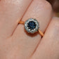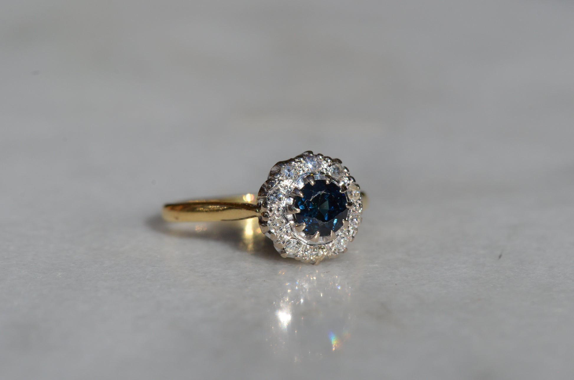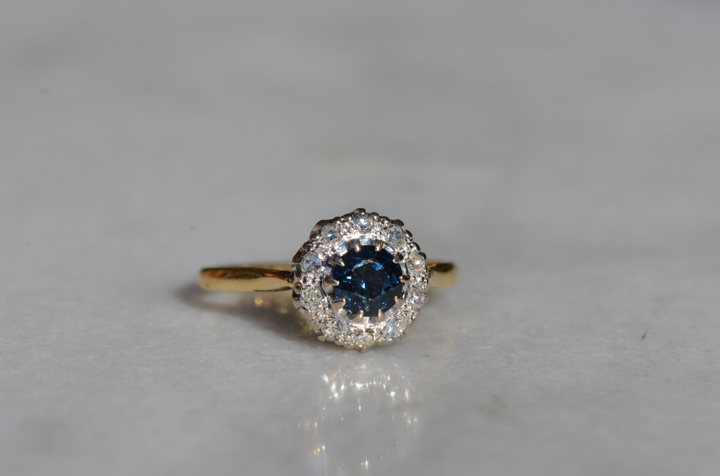 A dreamy vintage halo ring featuring a vivid blue sapphire nestled into a crown of twinkling diamonds - a ring fit for a princess and a style associated with one (or two) in particular. The mercurial sapphire at the centre of the ring vacillates between a deep-sea hue and shades of greenish-blue when the light strikes it just right. The diamonds wink from a setting that is lightly scalloped - a subtle bridge between a daisy and a halo - and perfectly set off by a warm yellow gold band.