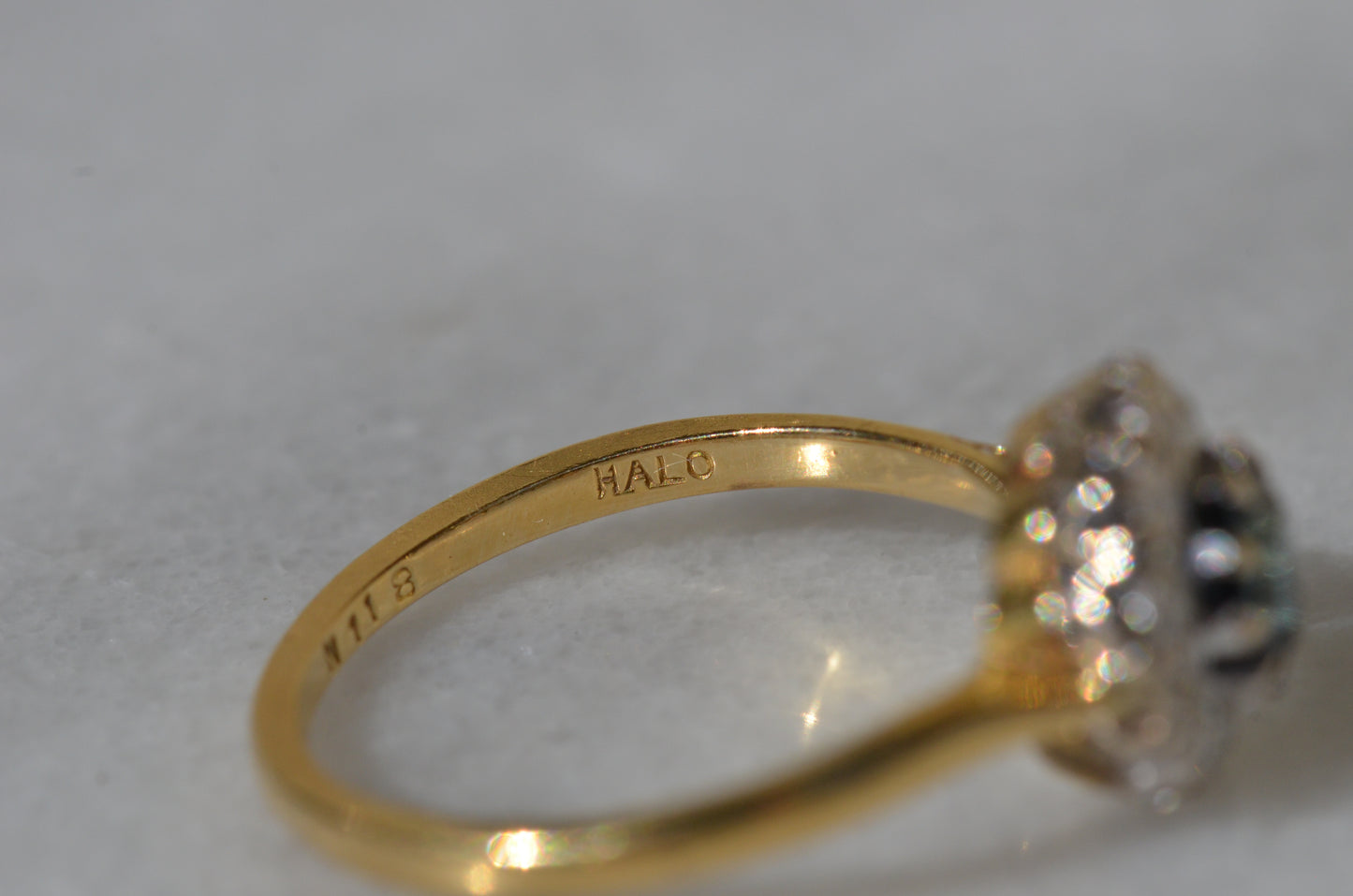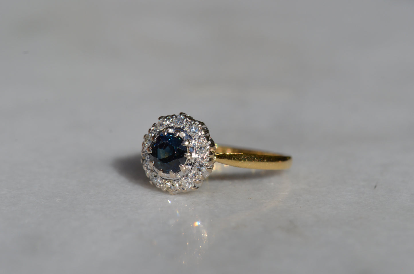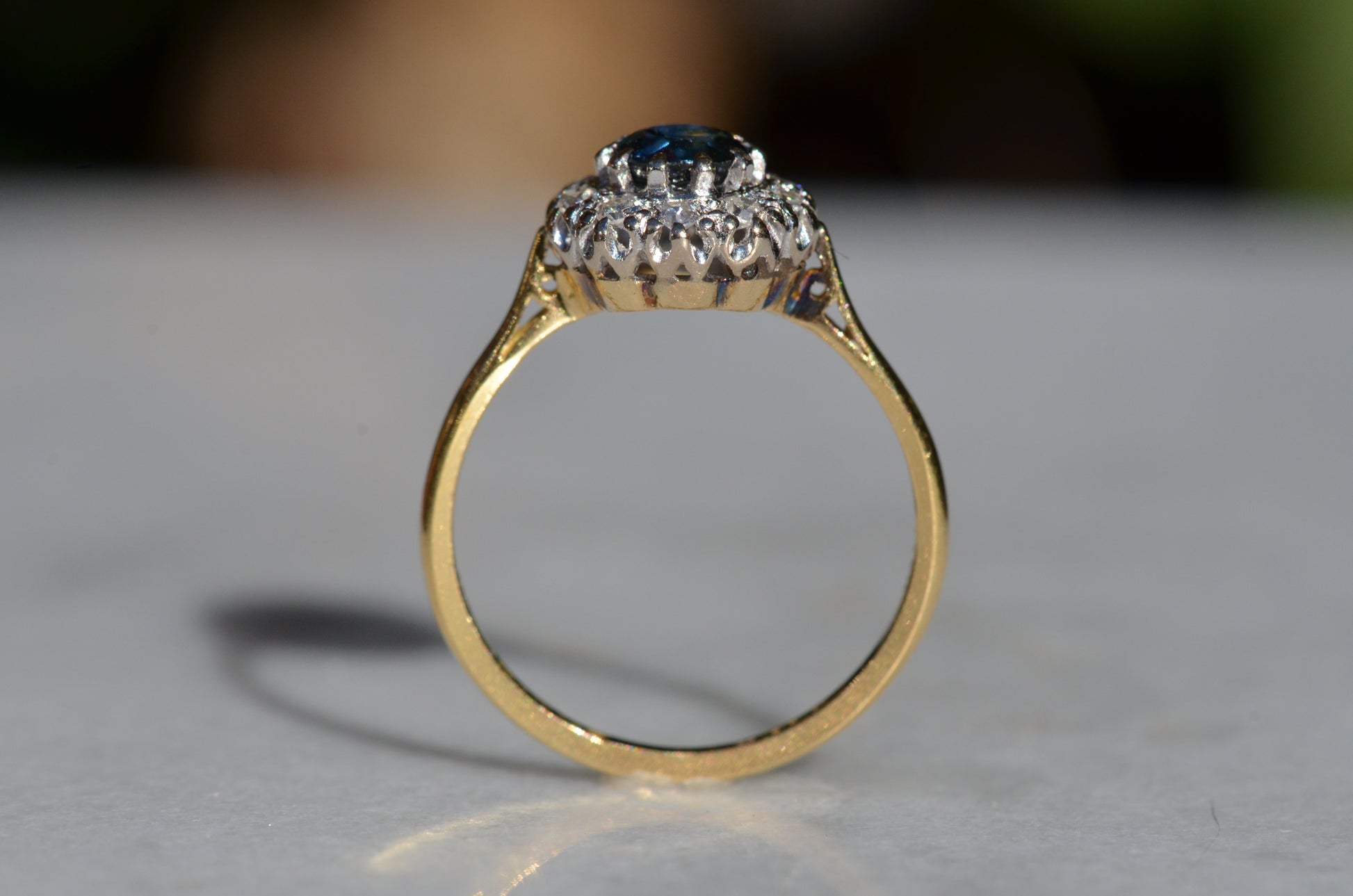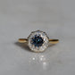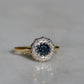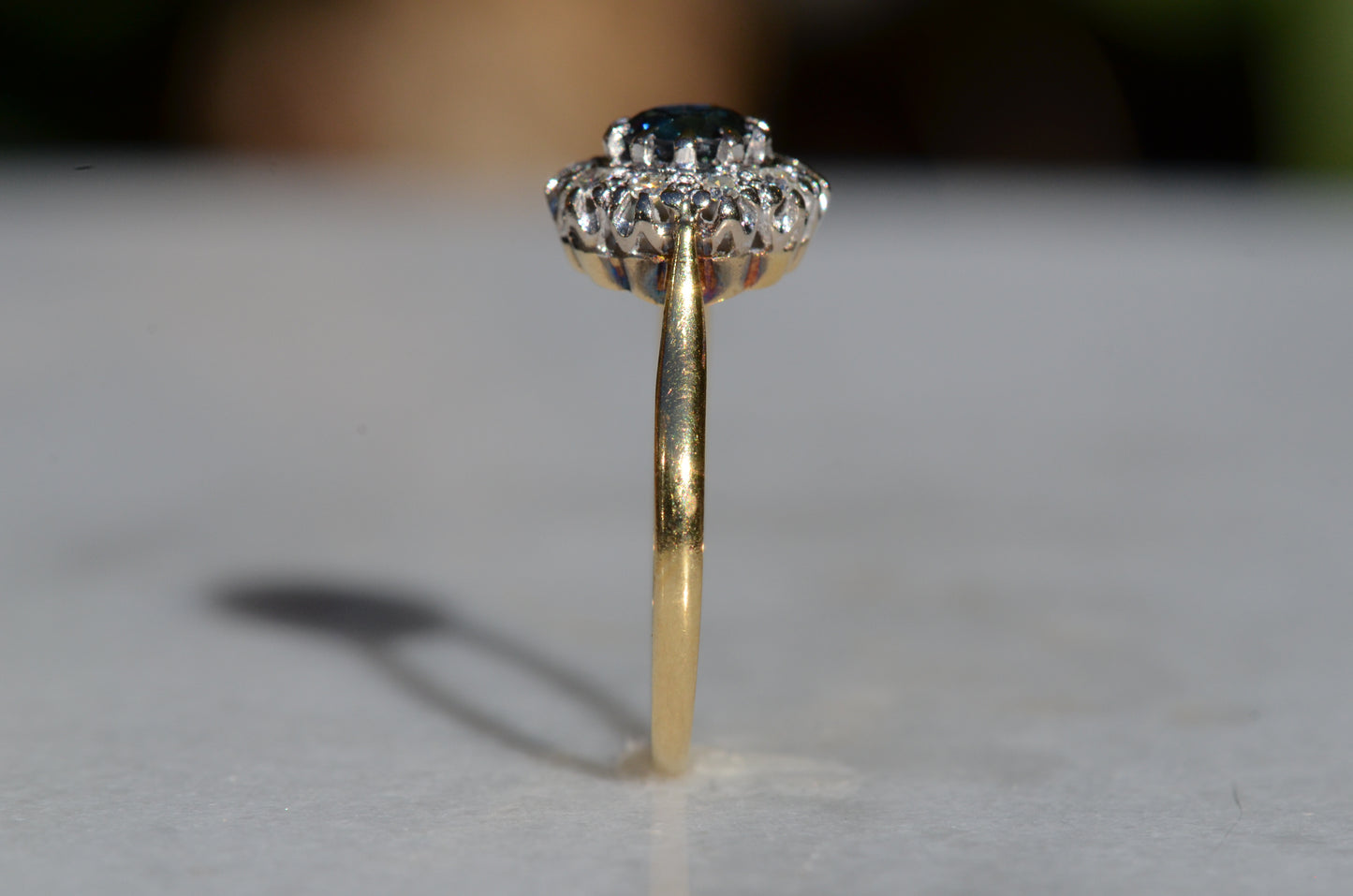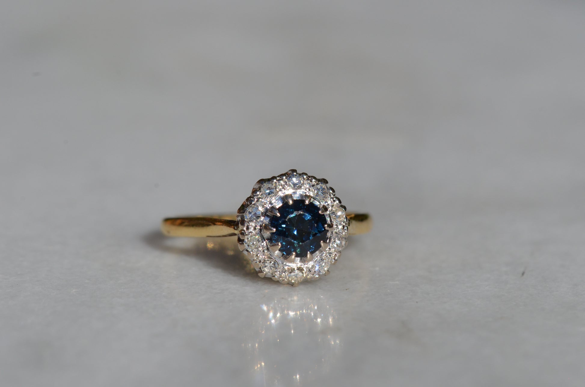 A dreamy vintage halo ring featuring a vivid blue sapphire nestled into a crown of twinkling diamonds - a ring fit for a princess and a style associated with one (or two) in particular. The mercurial sapphire at the centre of the ring vacillates between a deep-sea hue and shades of greenish-blue when the light strikes it just right. The diamonds wink from a setting that is lightly scalloped - a subtle bridge between a daisy and a halo - and perfectly set off by a warm yellow gold band.
