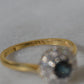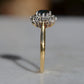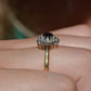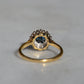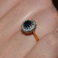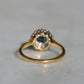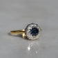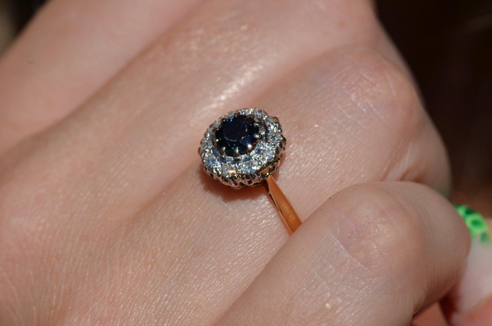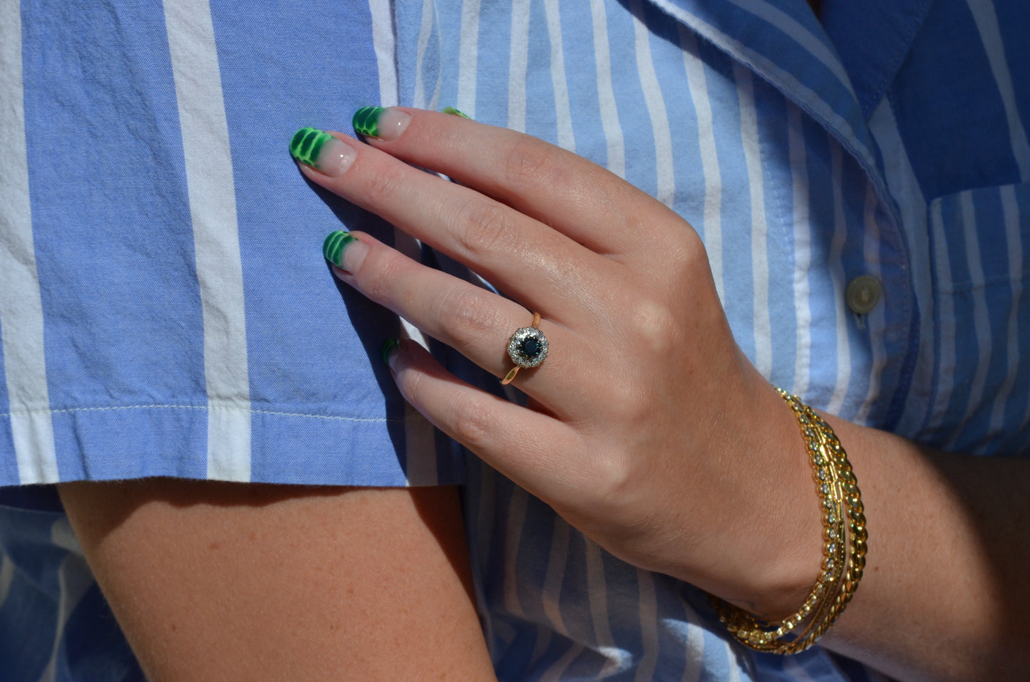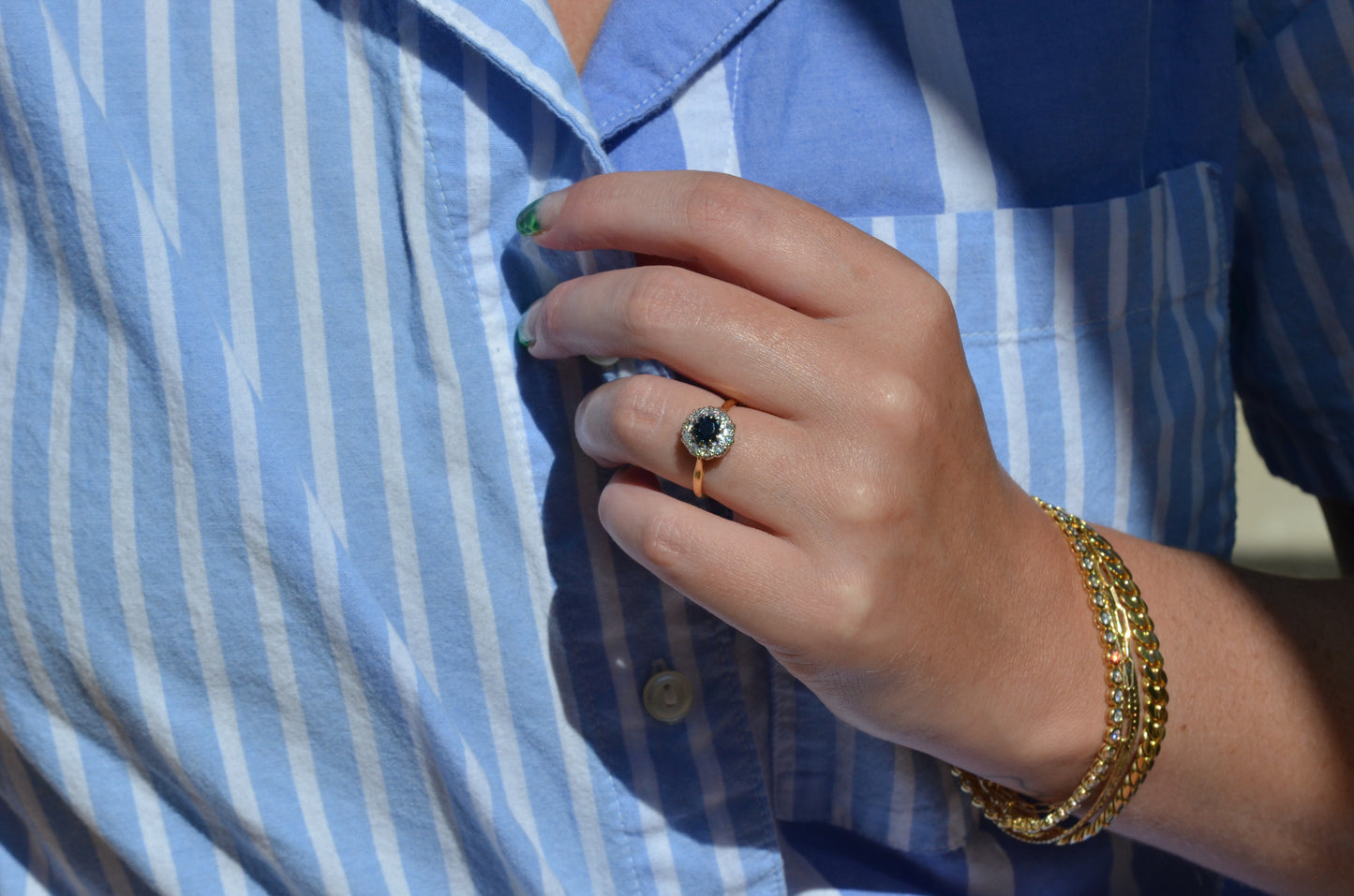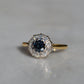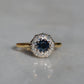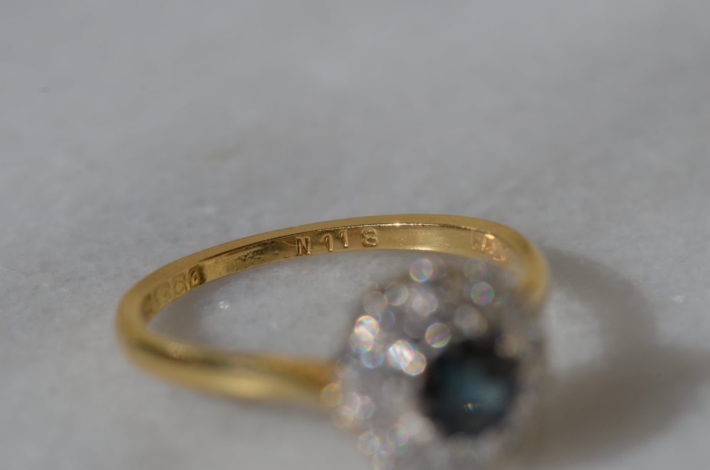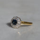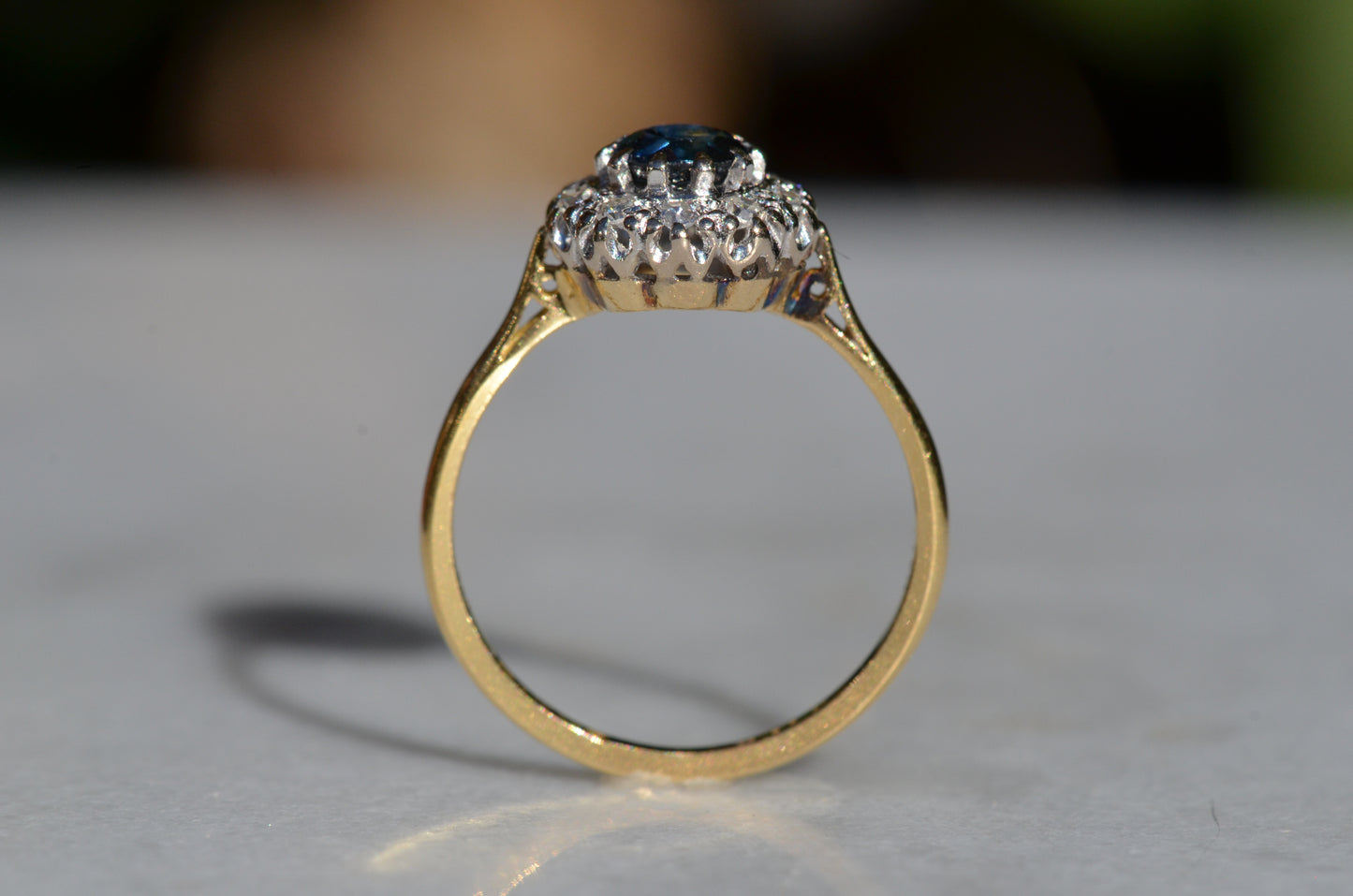 A dreamy vintage halo ring featuring a vivid blue sapphire nestled into a crown of twinkling diamonds - a ring fit for a princess and a style associated with one (or two) in particular. The mercurial sapphire at the centre of the ring vacillates between a deep-sea hue and shades of greenish-blue when the light strikes it just right. The diamonds wink from a setting that is lightly scalloped - a subtle bridge between a daisy and a halo - and perfectly set off by a warm yellow gold band.