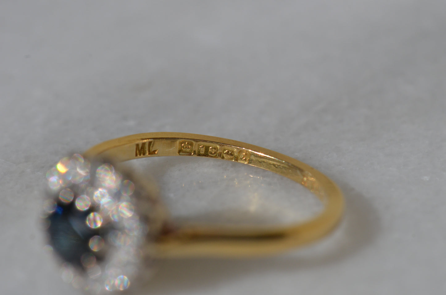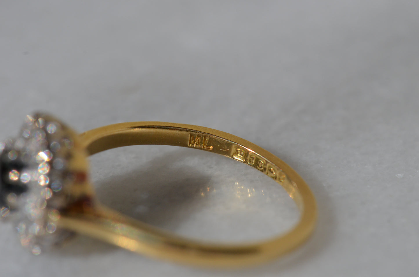 • 18k yellow and white gold, stamped and tested, with full British hallmarks for Birmingham 1960, maker's mark ML and stamp "Halo"