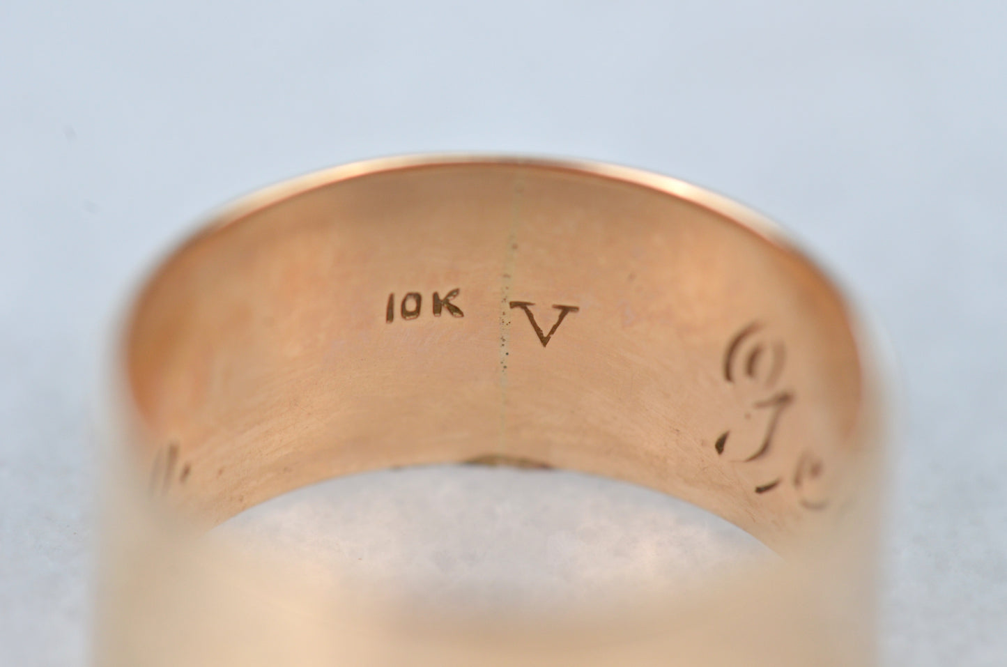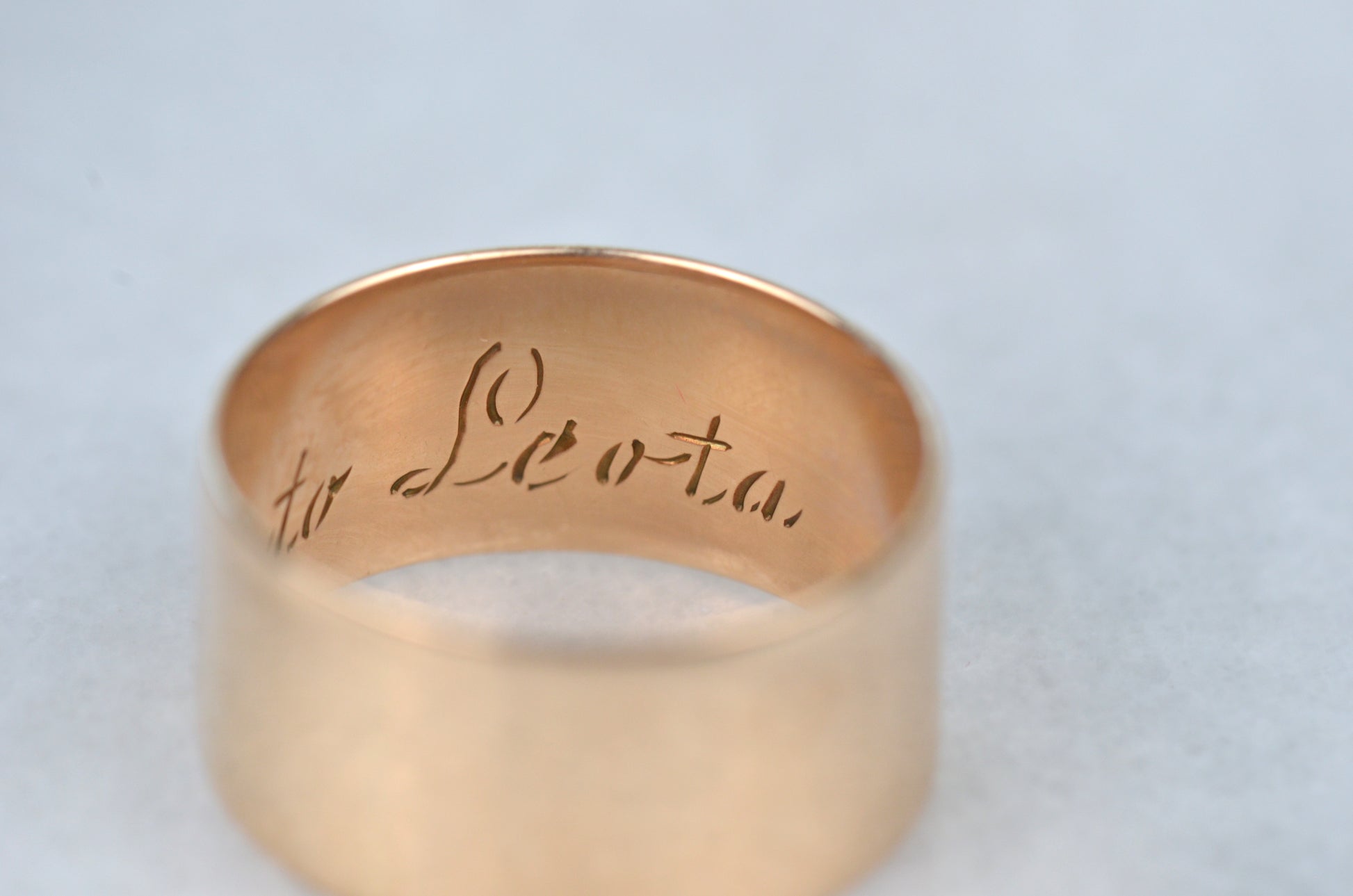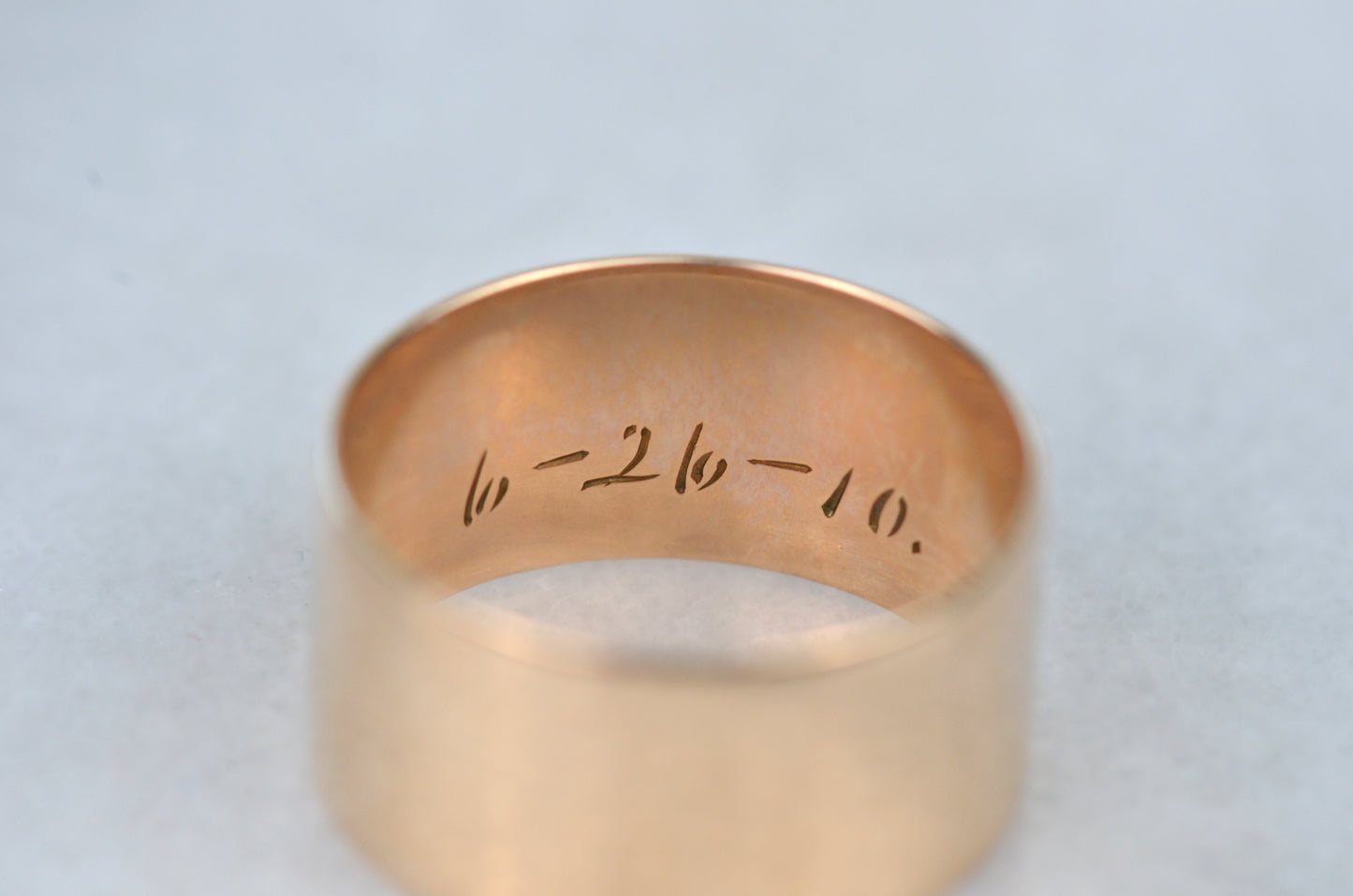 We love the bold and effortlessly glamorous look of an antique cigar band, but we can't deny that the real win here is a romantic engraving hidden inside. The high shine of this band will catch eyes, but the inside with melt hearts: Geo to Leota 6-26-10. On a June Sunday fresh into a whirlwind new century, two lovers commit to one another - and how fortunate are we to still bear witness to that more than one hundred years later.