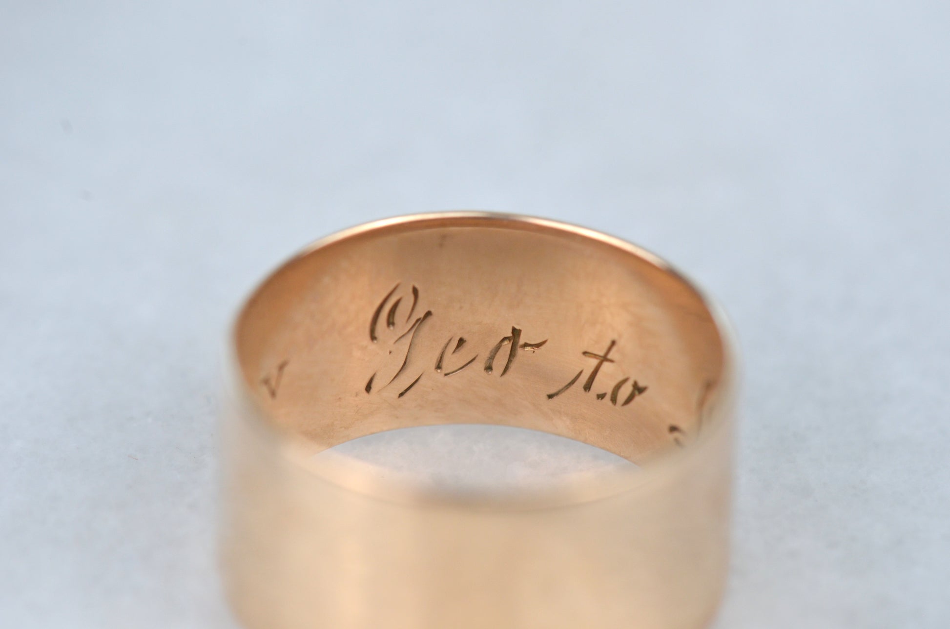 Very good antique condition with wear in line with age and use, including minor loss of definition to engraving and subtle evidence of past resizing; outside of band has been repolished at some point.
