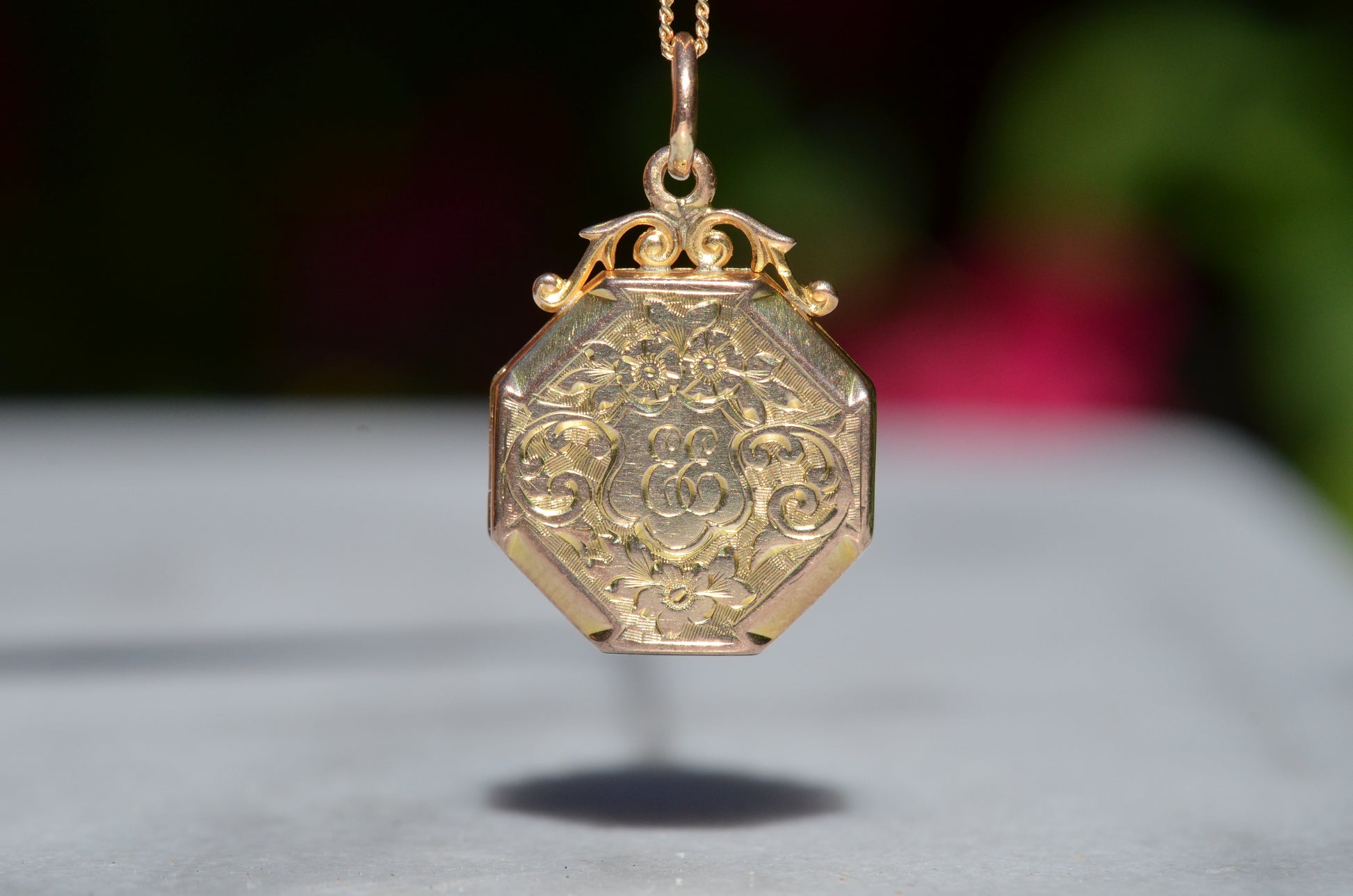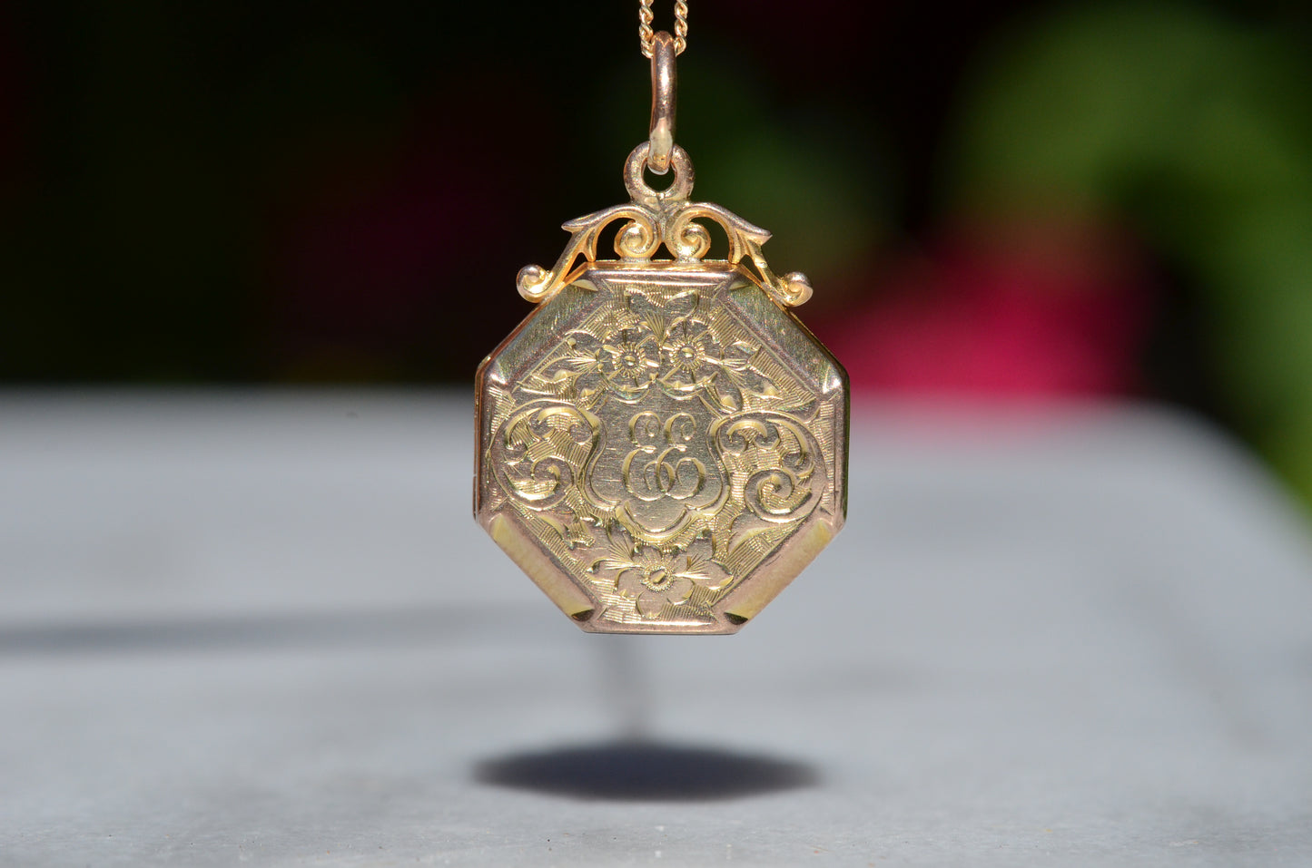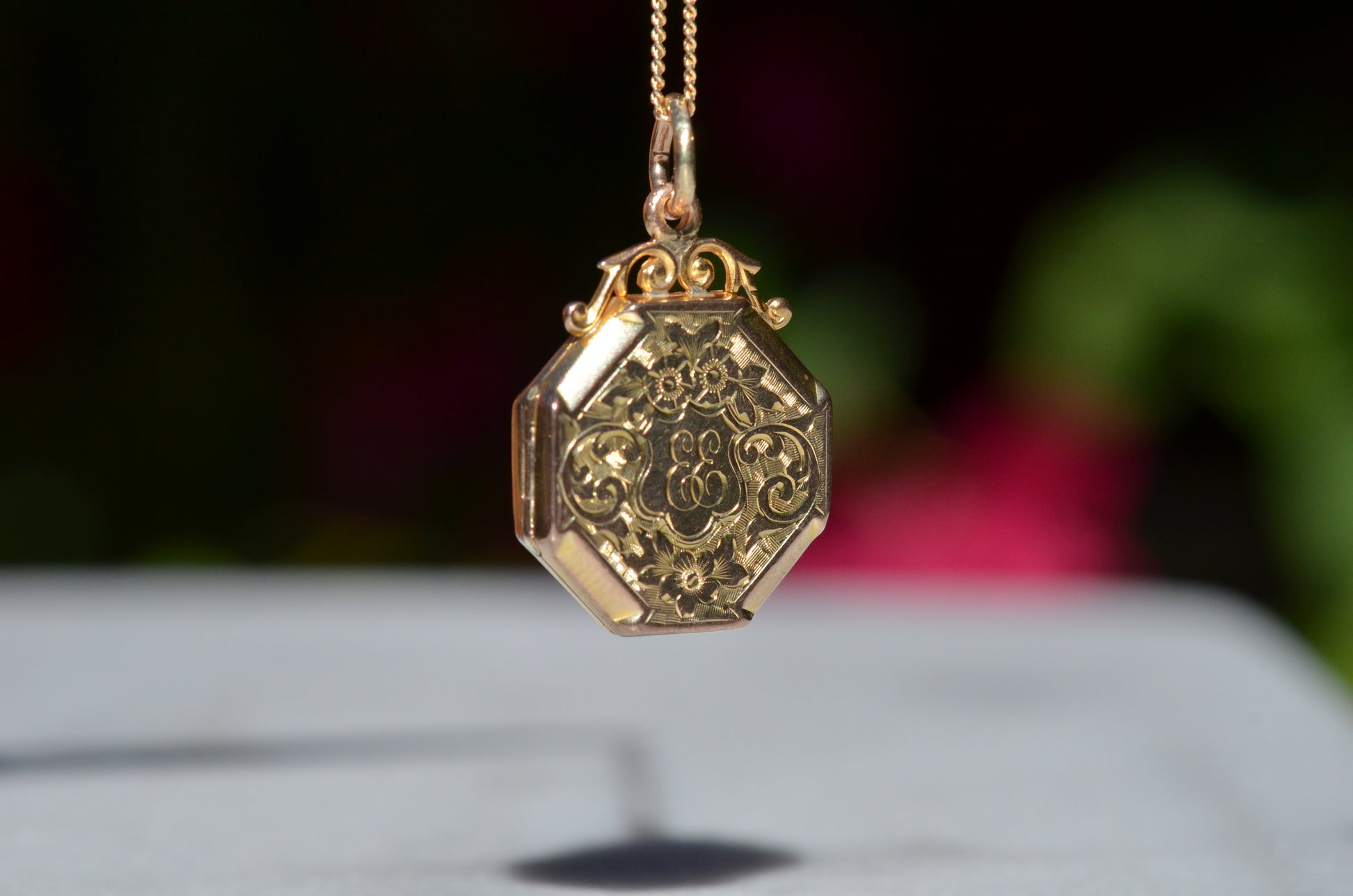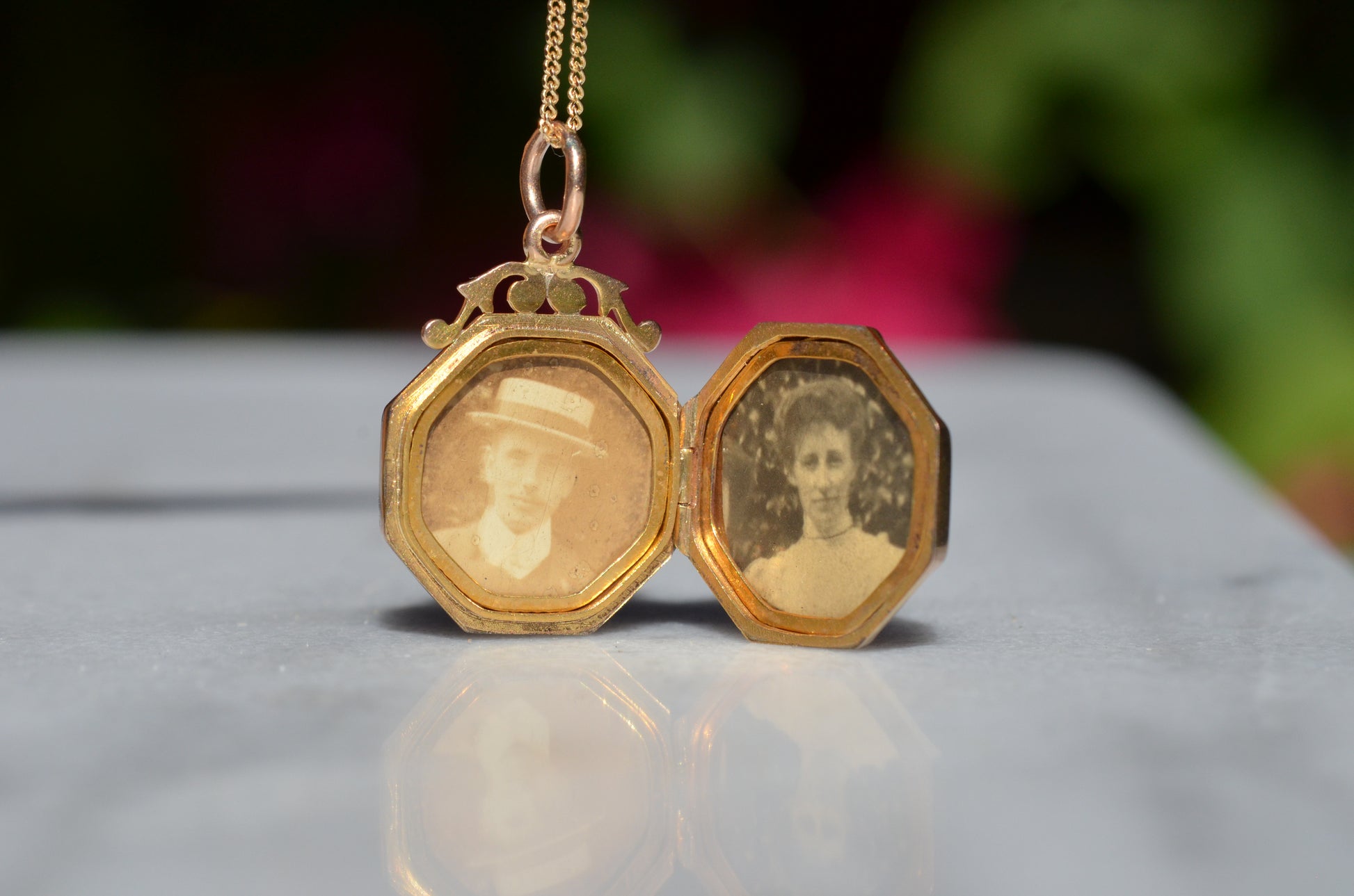 Lockets have been around in some form or another for hundreds of years. They emerged from jewels that might be more accurately described as vessels - meant to hold perfumes or tinctures or herbs. The locket as a holder of keepsakes - portraits (photographic or earlier), hair, and the like - rose in popularity in the 19th century and has been particularly popular during wartimes ever since, as a way to hold close to you those who are physically far. This piece ups the sentimental ante with a face decorated in forget me not flowers, a shield-shaped panel engraved with the initials "EE," and a facing pair of photos of a young man and woman.