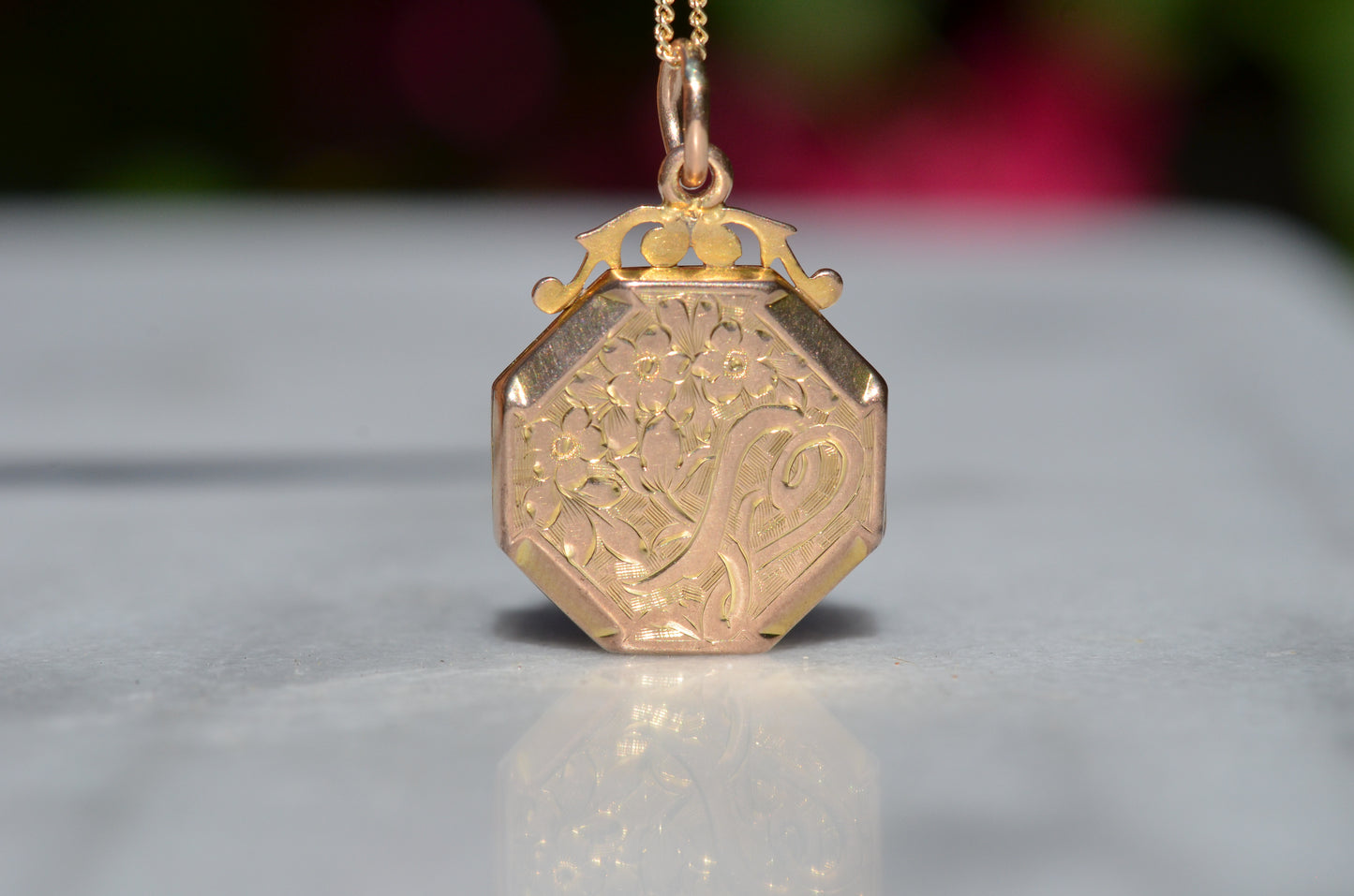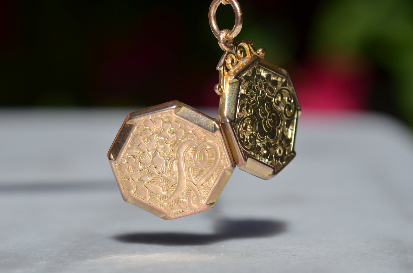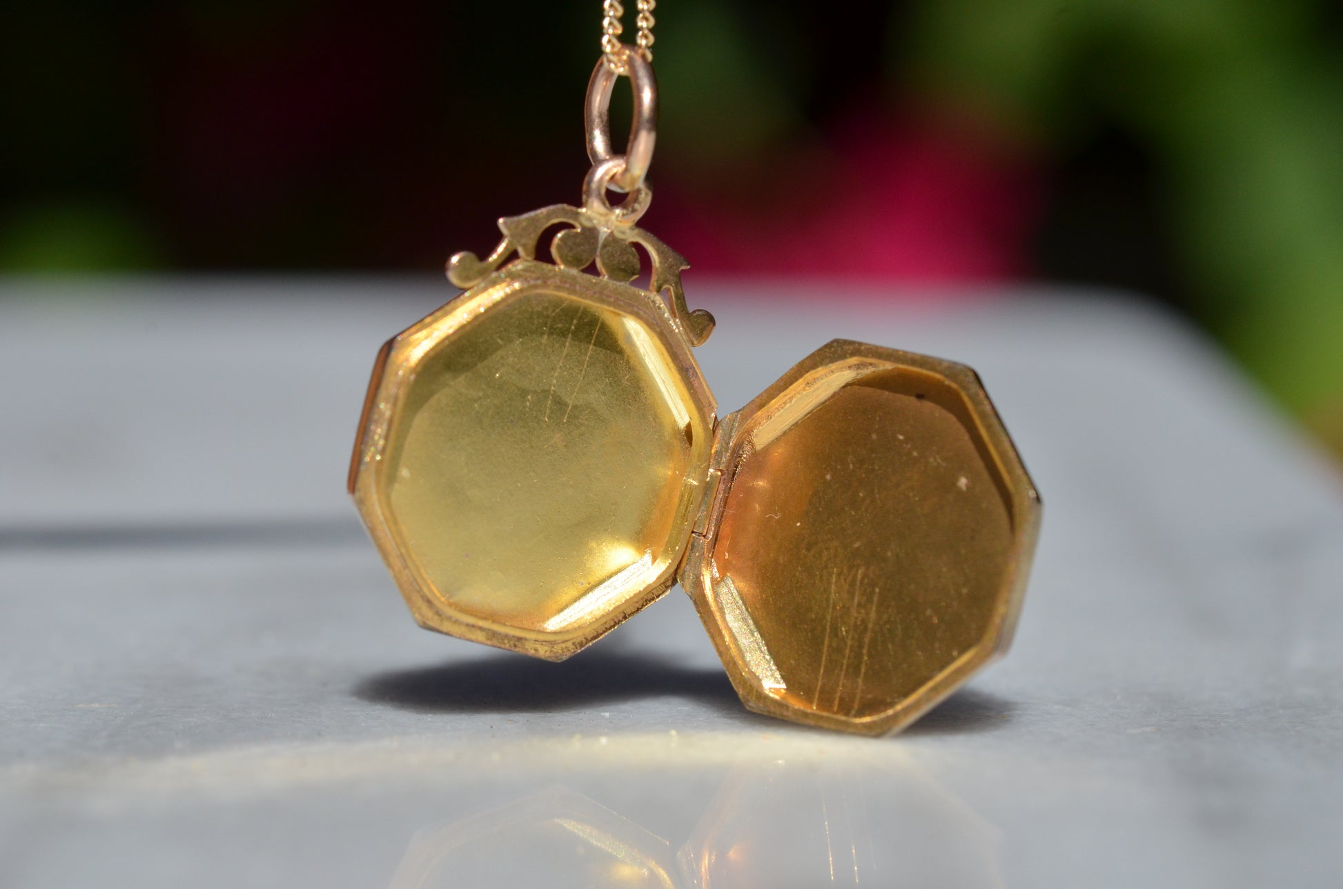• 9k yellow gold back and front (a sheet of gold applied on both the front and back of the locket over a base metal frame), unstamped but tested