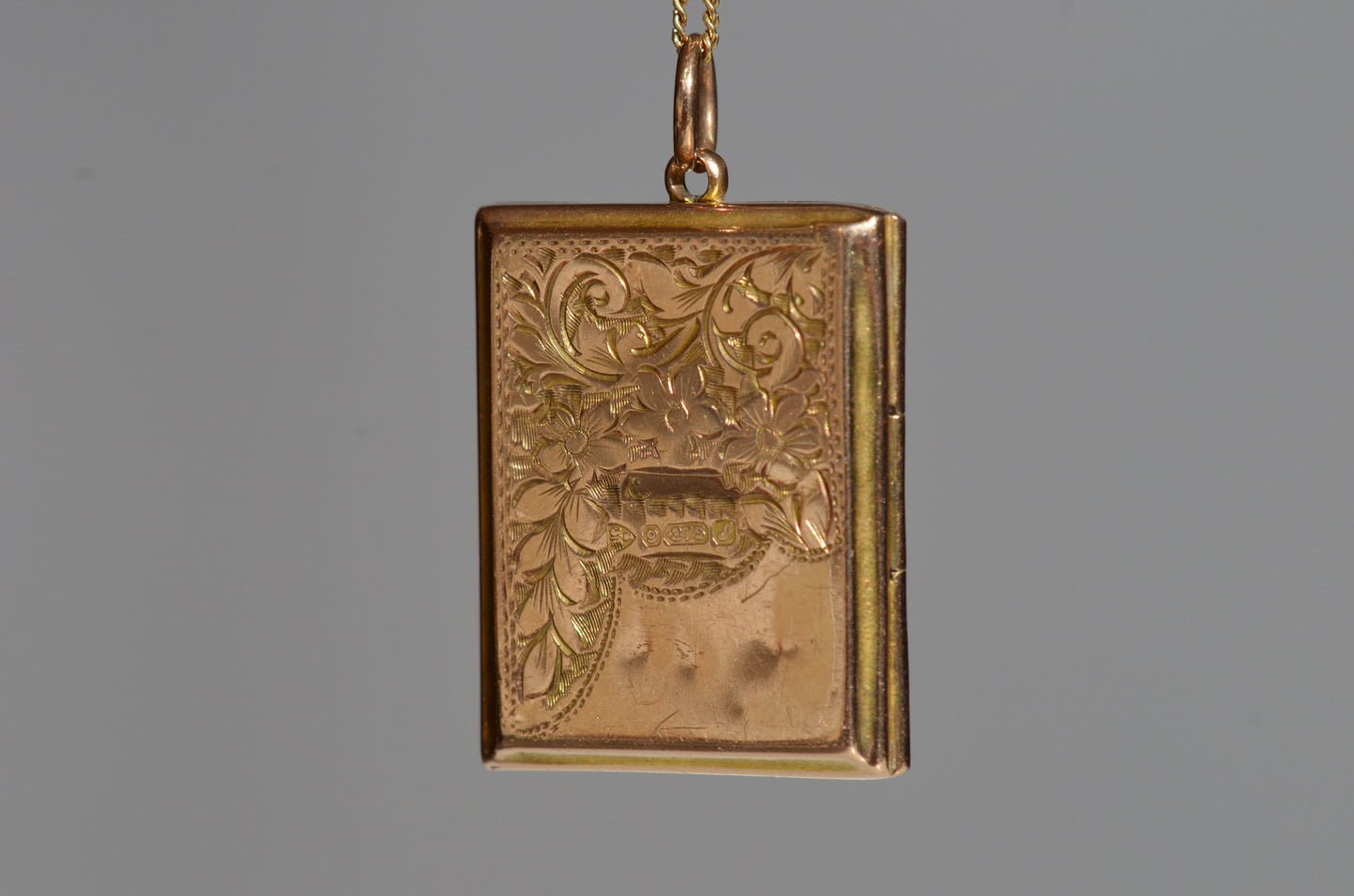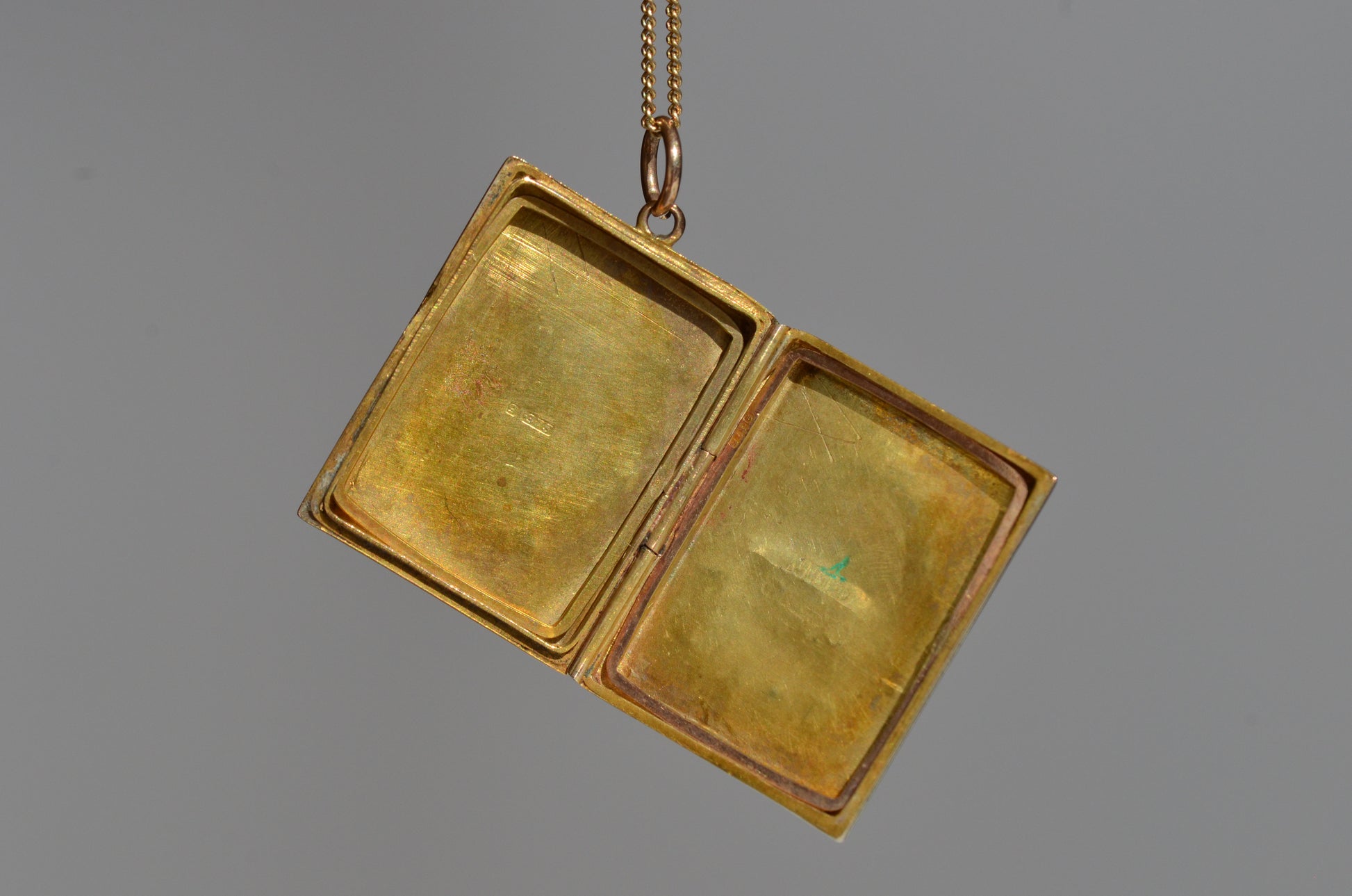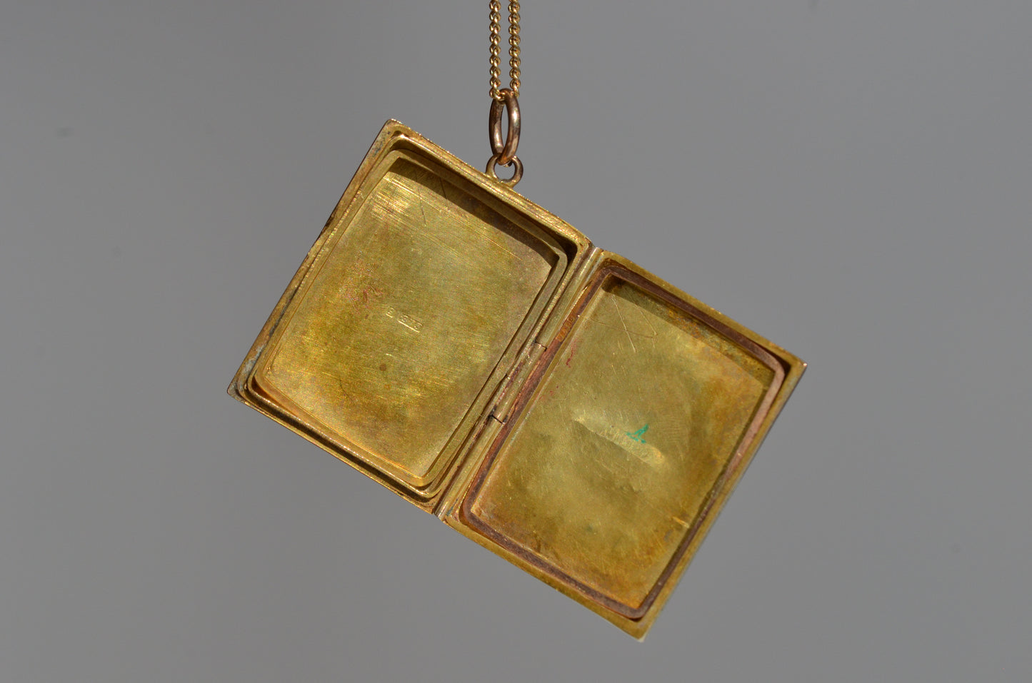 • 9k yellow gold, stamped and tested, with British hallmarks on backside for Chester 1909, and inside and both frames also stamped 9k