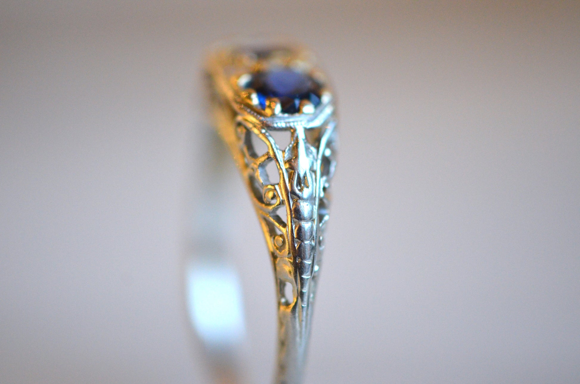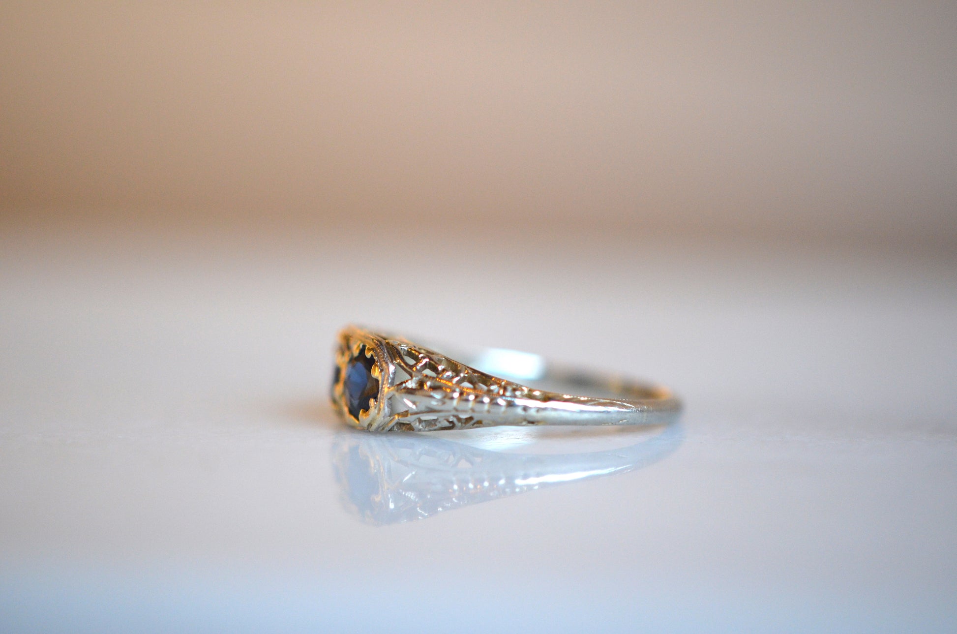 Soft and delicate swirls of white gold cradle two deep blue sapphires in this charming Art Deco ring. Twin stone rings like this are often called "toi et moi" rings - french for "you and me," with a stone represented the giver and the receiver each.