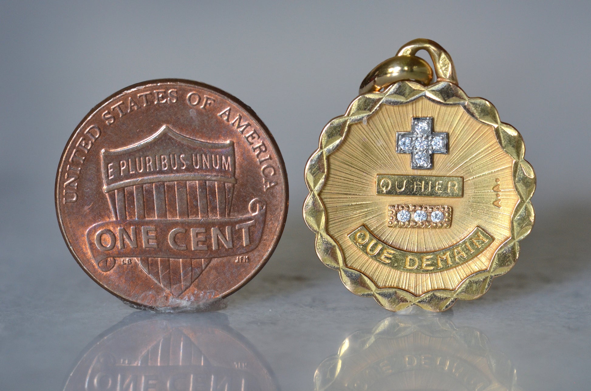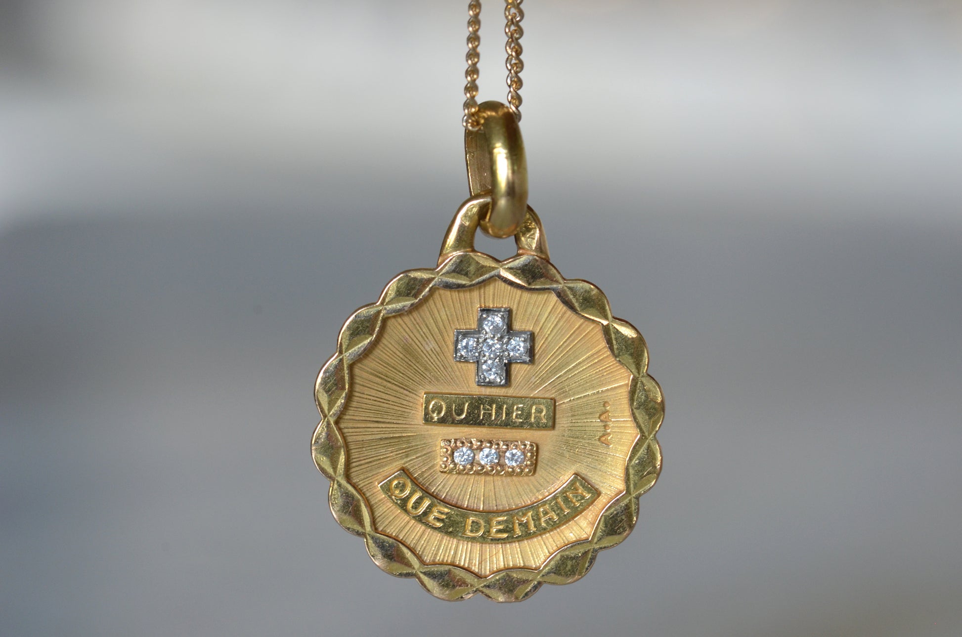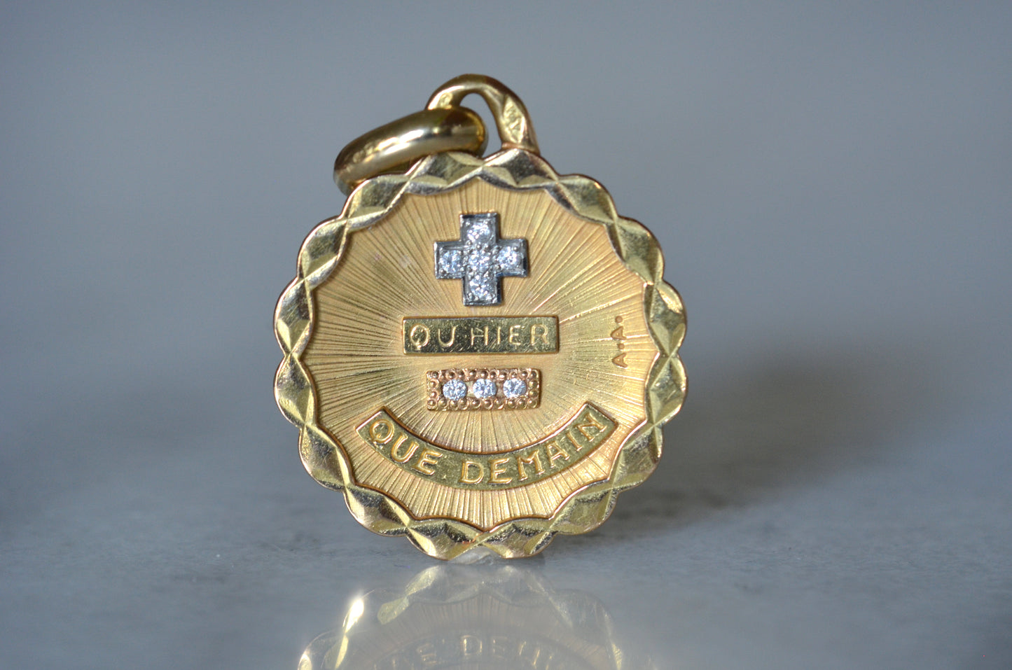 A beautiful vintage French love token, with contrasting white gold "+" sign and softly scalloped edge. Created by Alphonse Augis and inspired by a letter poet Rosemonde Gérard wrote to her husband, the writer Edmond Rostand, the pendant features a rebus reading "+ qu'hier - que demain" for the lines,