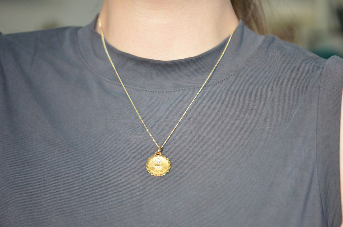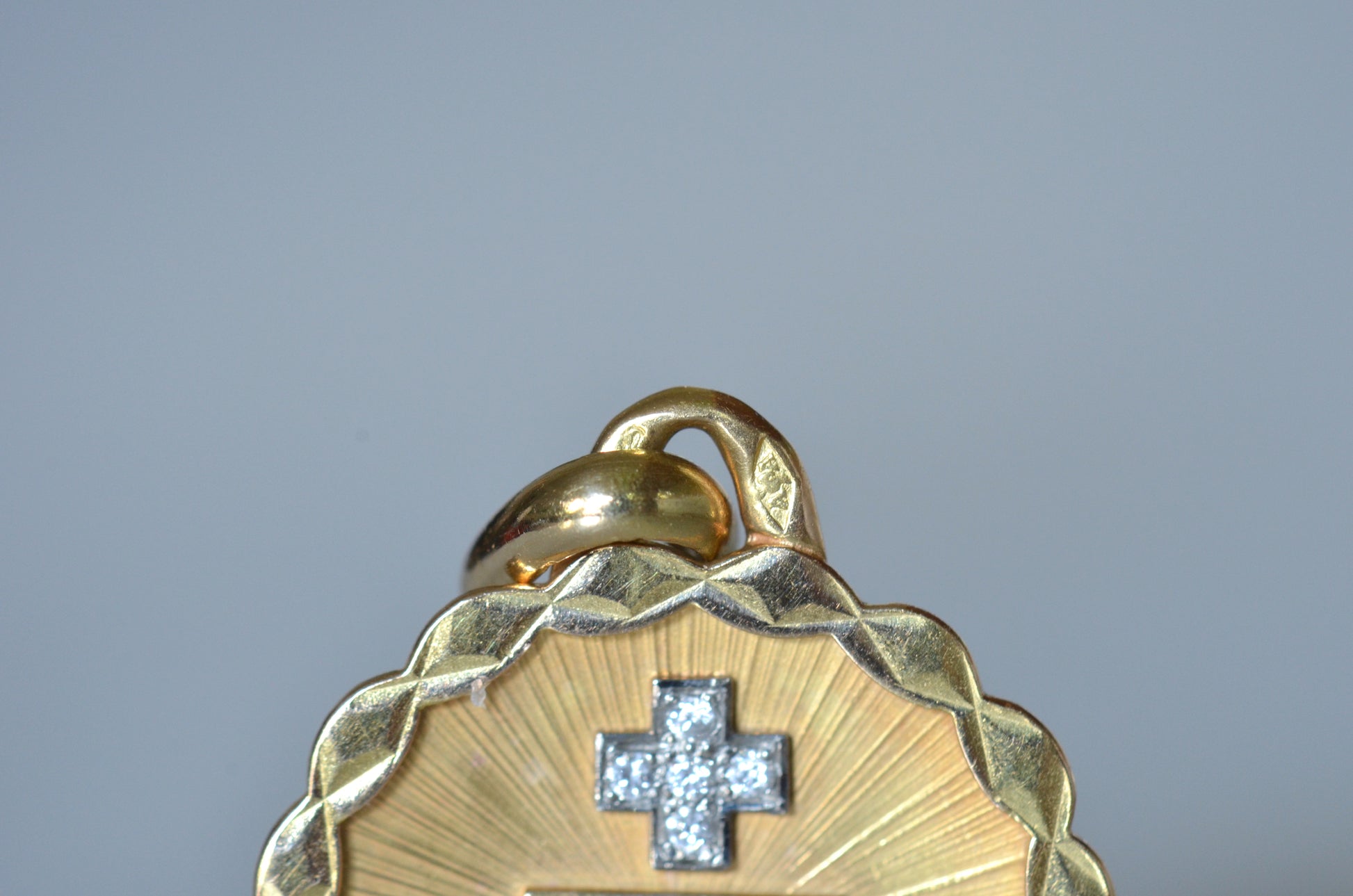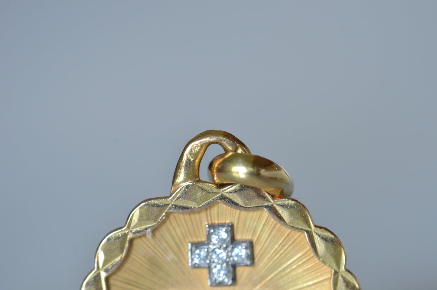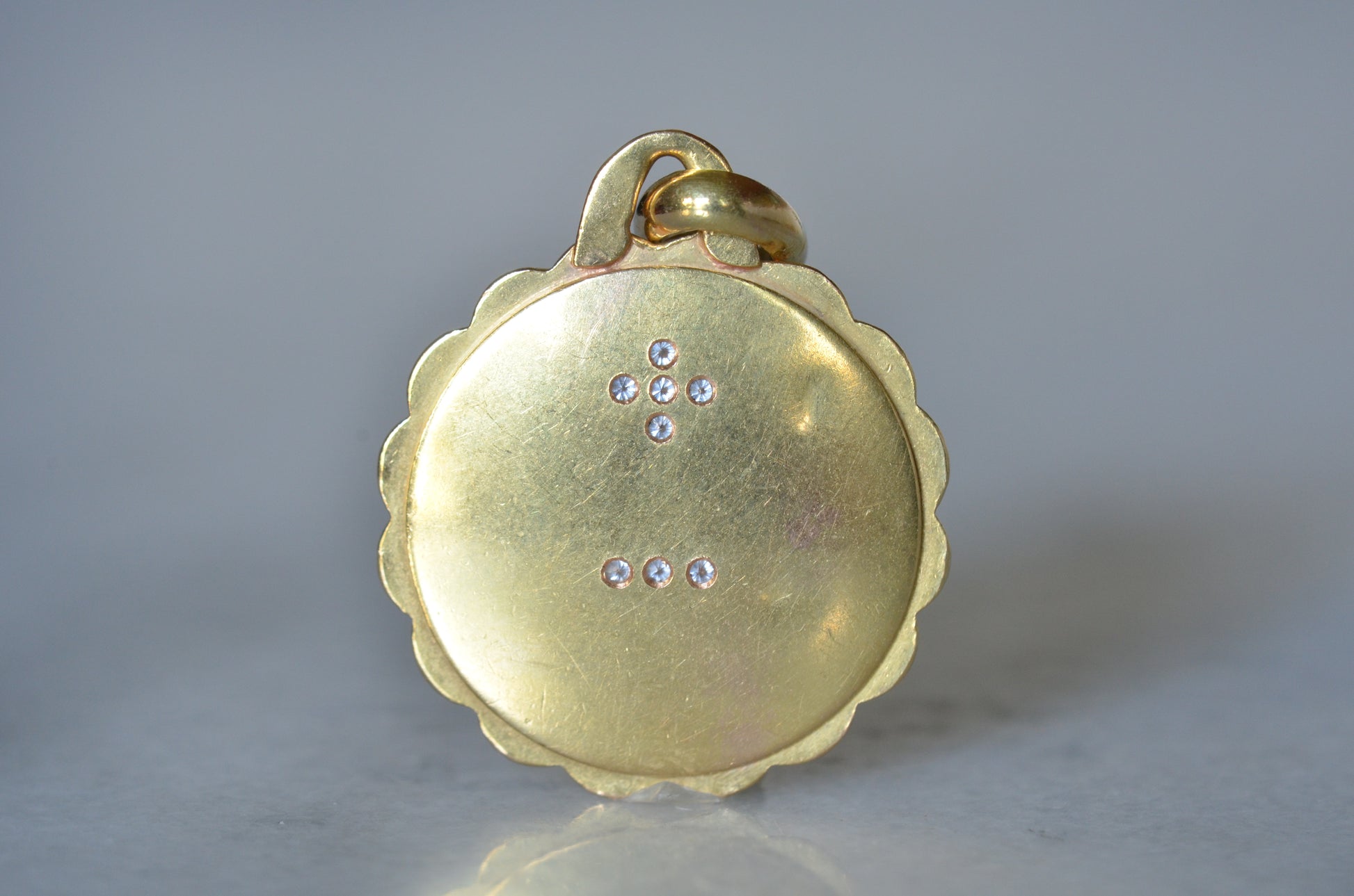 A beautiful vintage French love token, with contrasting white gold "+" sign and softly scalloped edge. Created by Alphonse Augis and inspired by a letter poet Rosemonde Gérard wrote to her husband, the writer Edmond Rostand, the pendant features a rebus reading "+ qu'hier - que demain" for the lines,