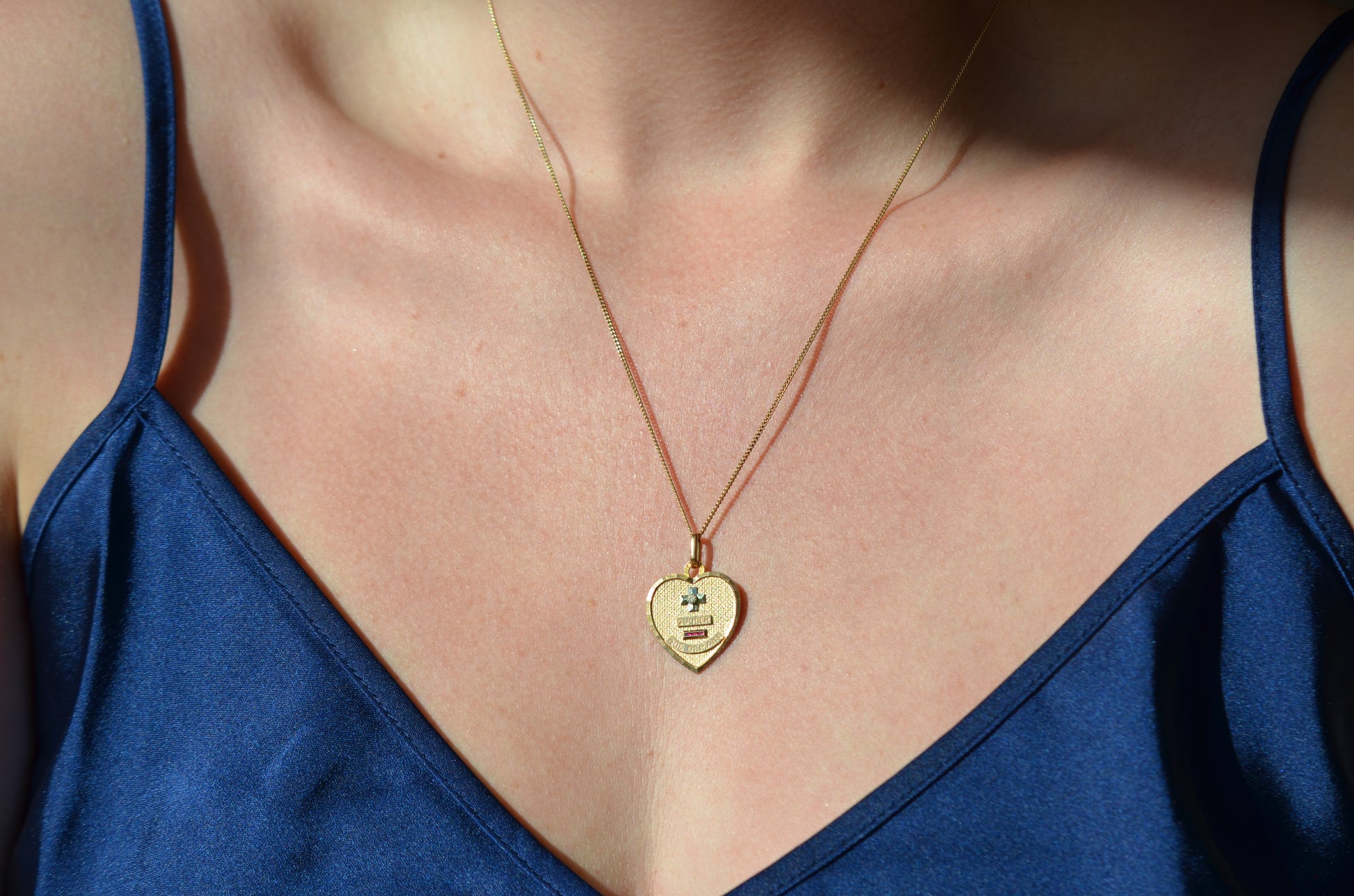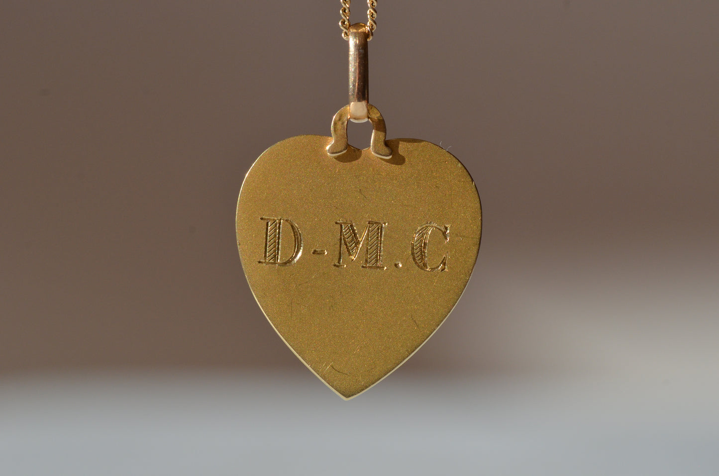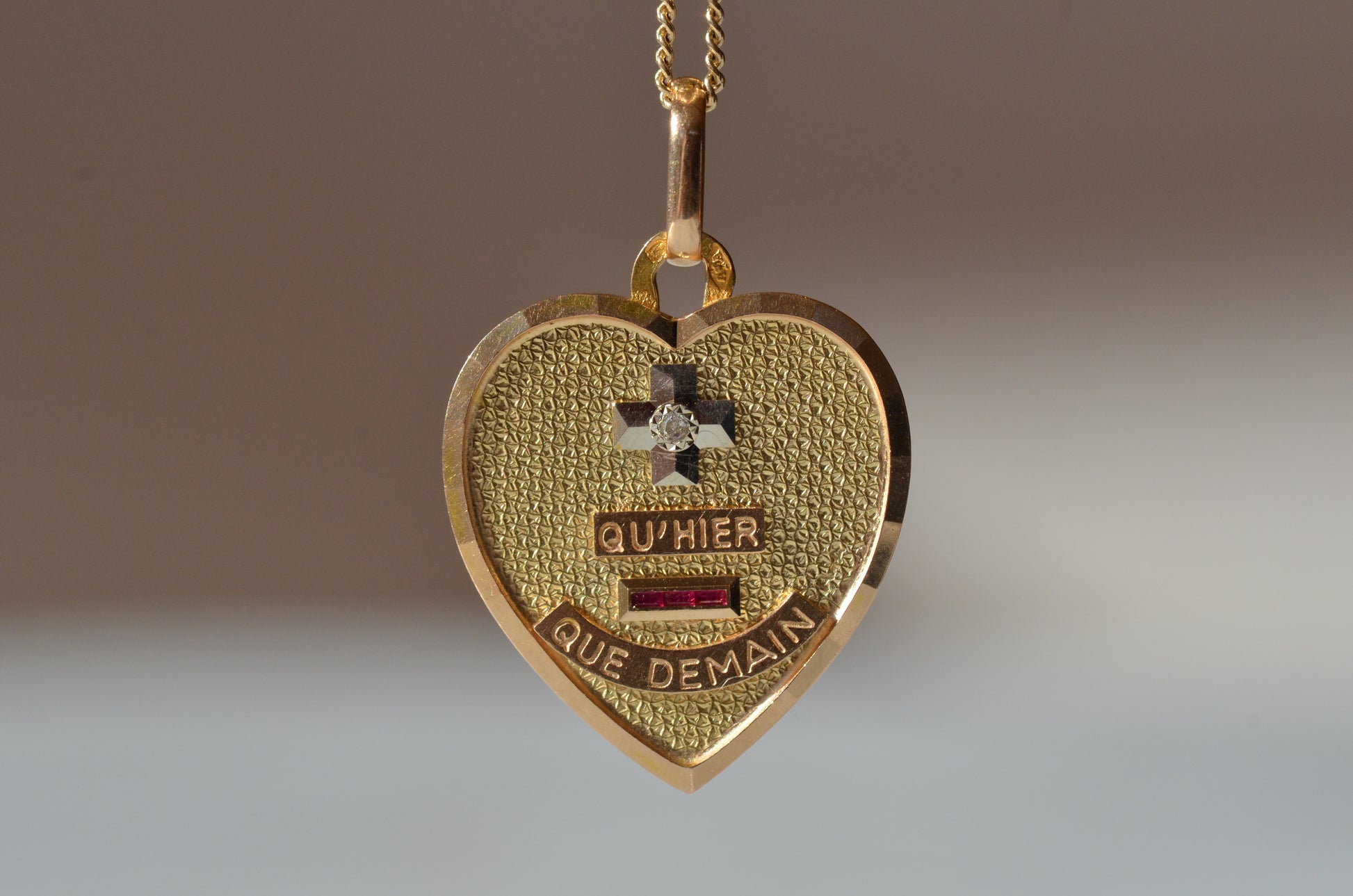 A beautiful vintage French love token, in a unique textured heart version complete with personalized inscription on the reverse. Originally created by Alphonse Augis c.1907, and inspired by a letter poet Rosemonde Gérard wrote to her husband, the writer Edmond Rostand, the pendant features a rebus reading "+ qu'hier - que demain" for the lines,