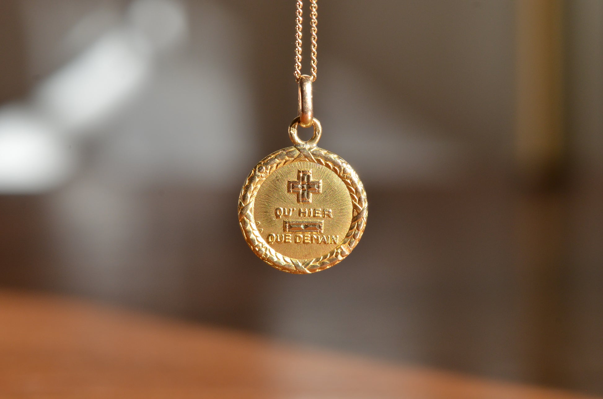 A beautiful vintage French love token, in a covetable laurel-bordered variation. Originally created by Alphonse Augis c.1907, and inspired by a letter poet Rosemonde Gérard wrote to her husband, the writer Edmond Rostand, the pendant features a rebus reading "+ qu'hier - que demain" for the lines,