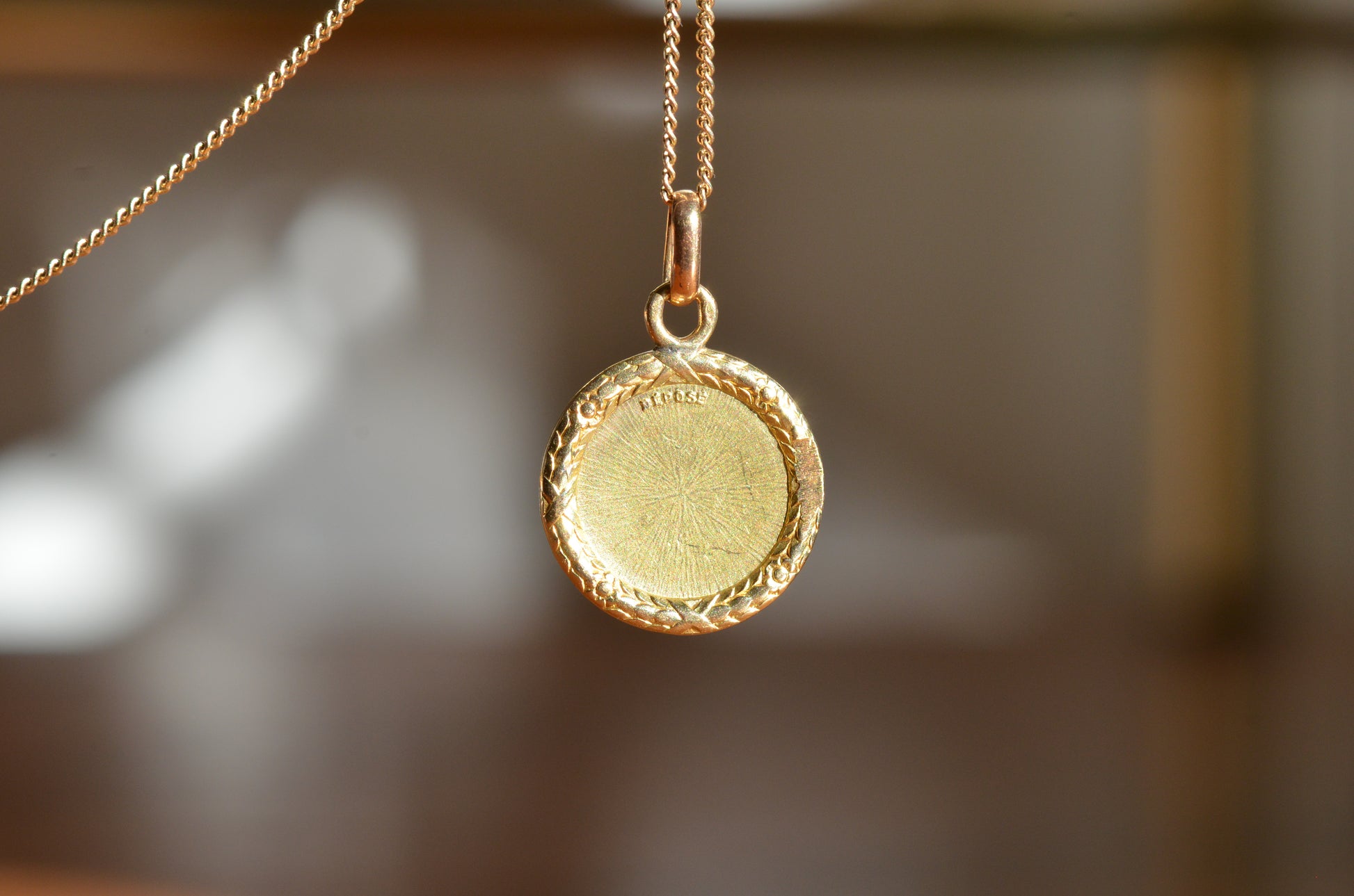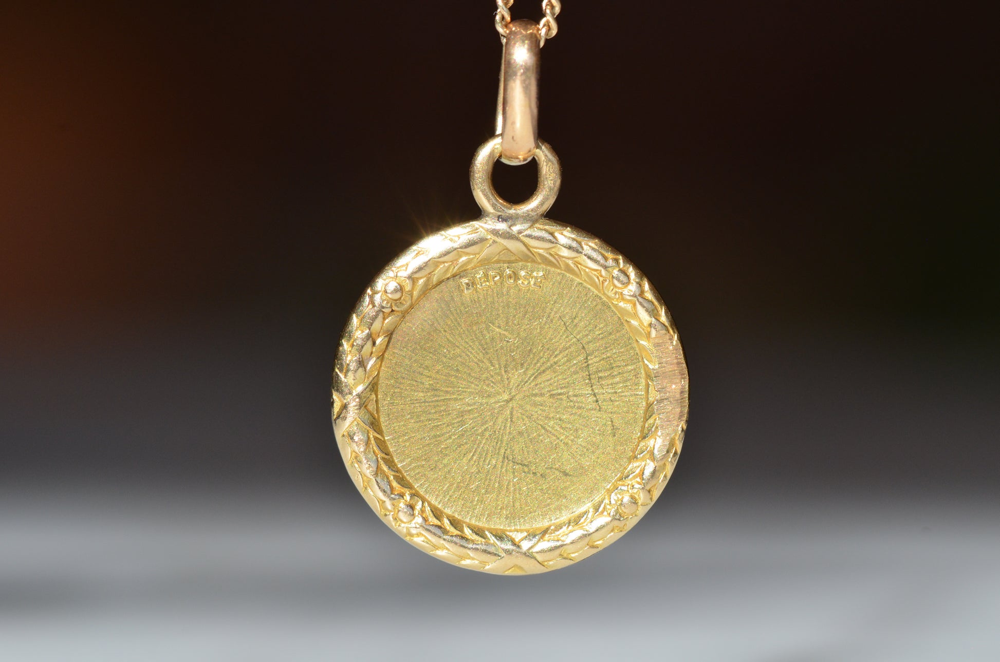 Fair vintage condition: please note that the back of this pendant has been filed in an aggressive gold test resulting in loss to a portion of the laurel border and has been priced with that in mind. The file marks are not visible from the front while worn.